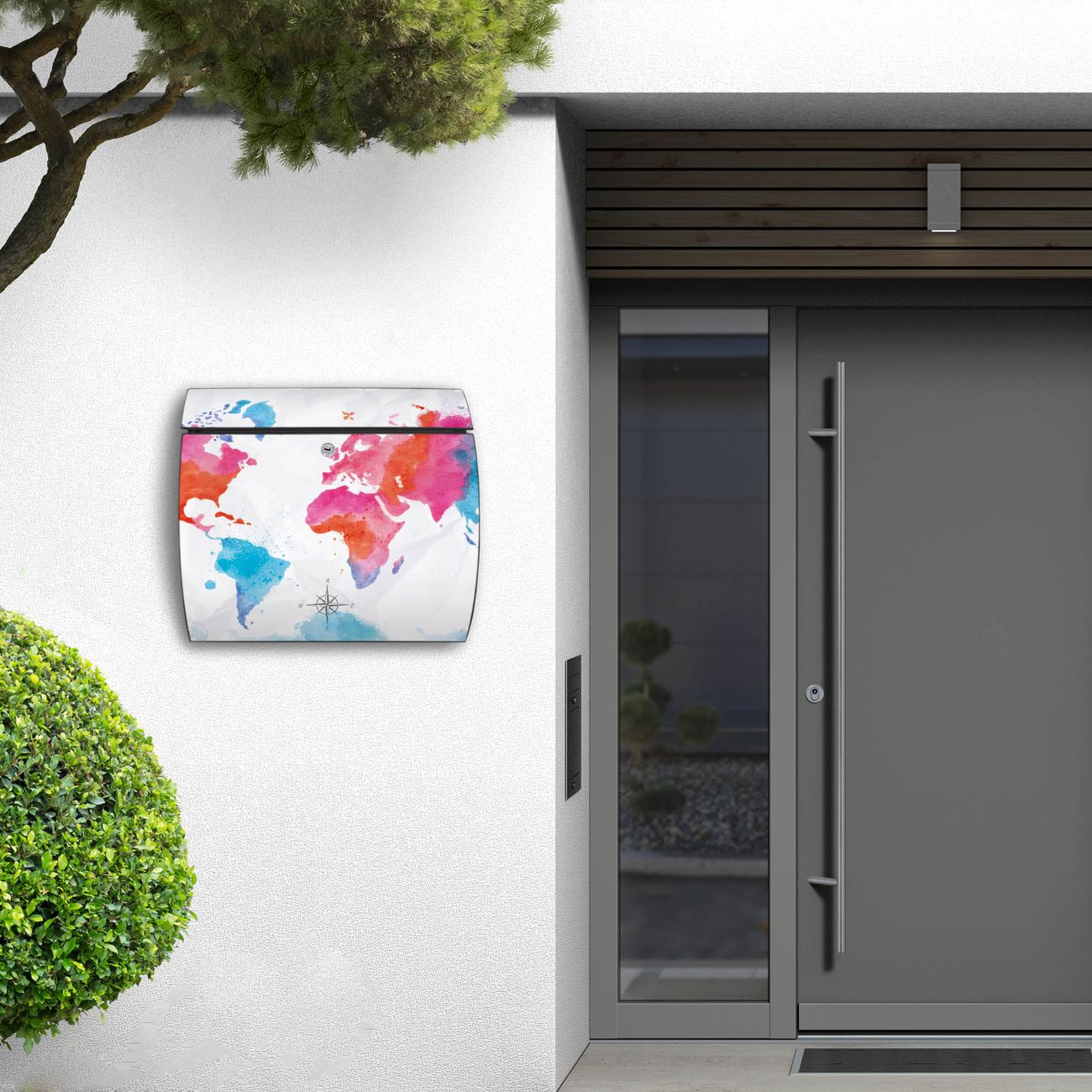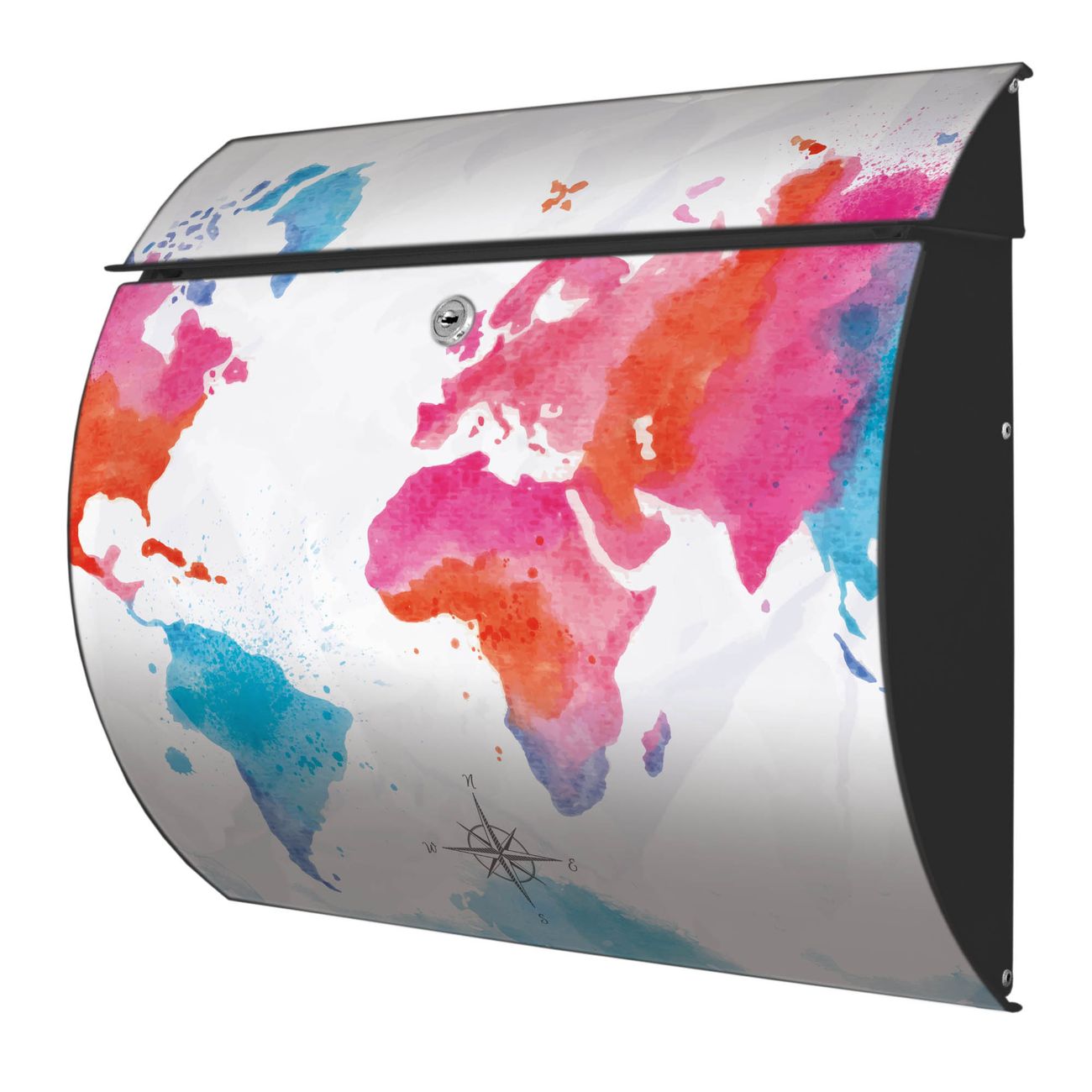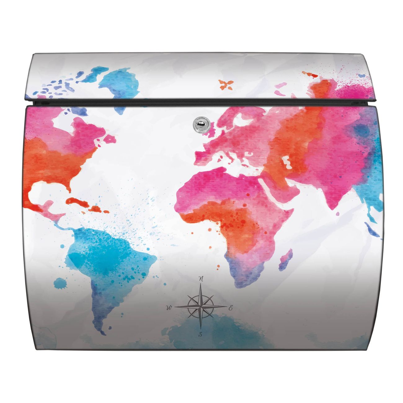 FUNKTION: DESIGN: Das Burg Wächter Modell Toscana mit Motiv Weltkarte pastell hat ein sehr ansprechendes und zeitloses Design und ist besonderes wetterfest. Heben Sie Sich von der tristen grauen Masse ab, ohne auf Funktionalität zu verzichten. Wir bieten Ihnen ebenfalls Namensschilder, bereits beschriftet oder frei zu beschriften, und verschiedene selbst gestaltete Bitte-Keine-Werbung-Aufkleber. DETAILS: Der Postkasten besteht aus vollflächig verzinktem Stahl welcher in Anthrazit oder Weiß lackiert wurde oder aus Edelstahl (je nach gewählter Variante). Das Motiv besteht aus einer wetter- und UV-festen Folie, die mit einem Schutzlaminat überzogen ist, durch die Ihren Briefkasten zusätzlich vor Kratzern geschützt ist und auf den Briefkasten kaschiert wurde. Sie erhalten zu Ihrem neuen Design Briefkasten 2 Schlüssel sowie das passende Montagematerial. BANJADO: Ihr Briefkasten wird von Burg Wächter in Deutschland gefertigt und in unserer kleinen Manufaktur von Hand veredelt. Die Motivfolie ist lösungsmittelfrei und schutzlaminiert, dies sorgt für einen langen Halt. Wir legen großen Wert auf die Verbindung von Funktionalität und Design. Sie erhalten besondere Handarbeit aus Sachsen und Made in Germany.