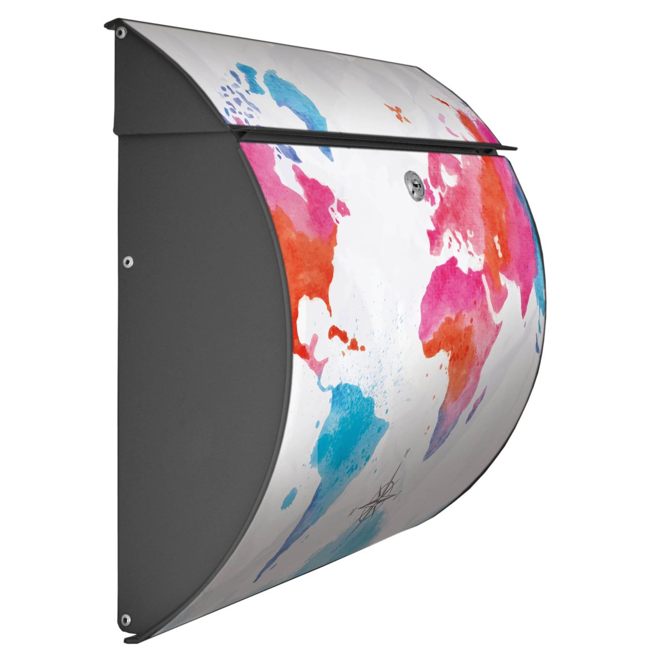 Der geschwungene Burg Wächter Briefkasten Toscana mit Motiv Weltkarte pastell bietet Ihnen mit seinem großen Fassungsvermögen genügend Platz auch für große A4 Sendungen. Auf Wunsch können Sie bei uns den passenden Standfuß bestellen und so aus dem Wandbriefkasten einen Standbriefkasten machen. Der integrierte Öffnungsstopp ermöglicht eine einfache Handhabung beim Entnehmen der Post.