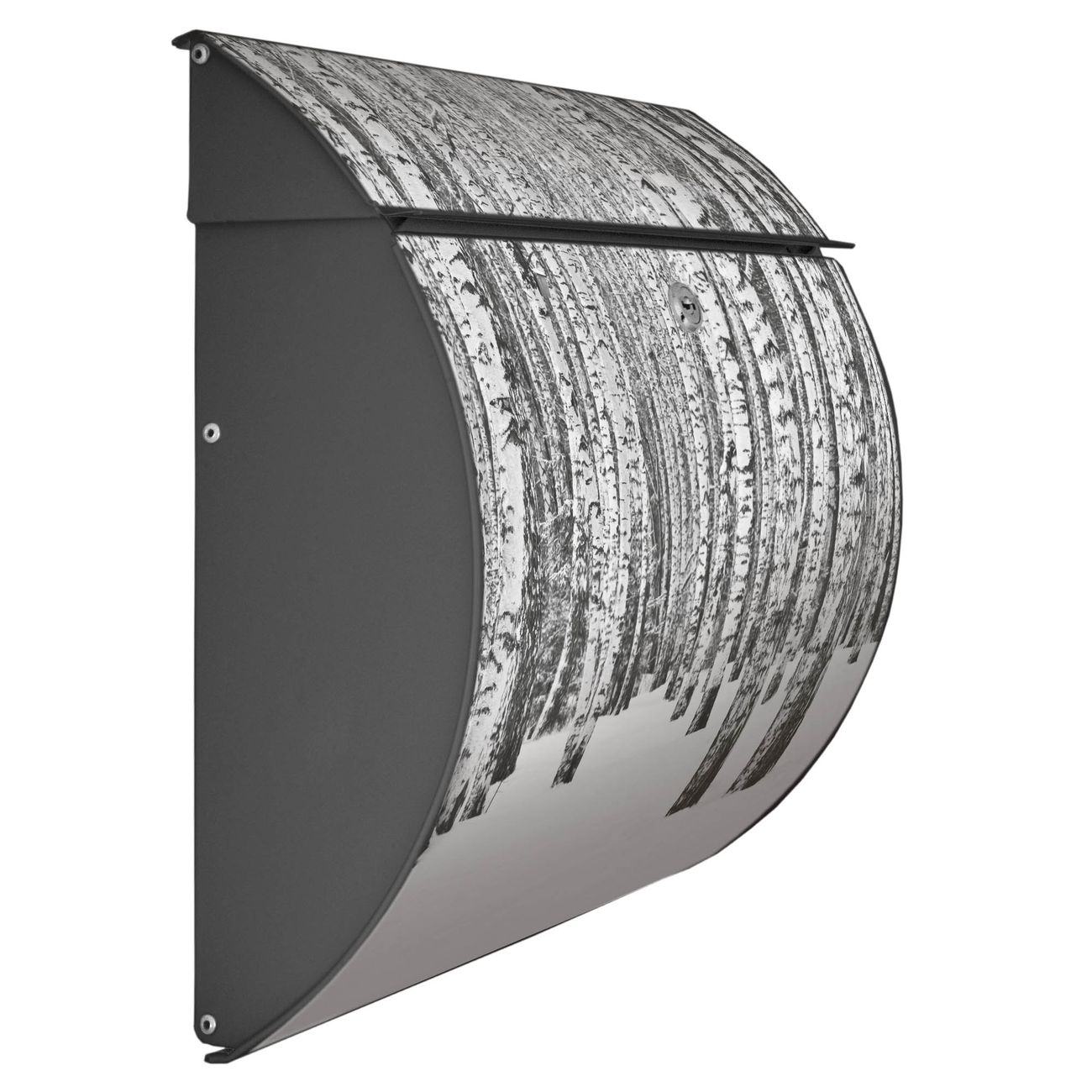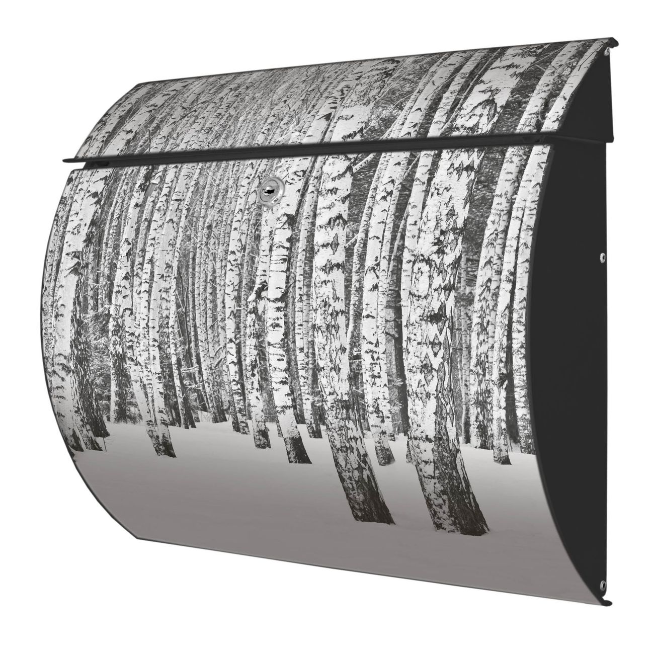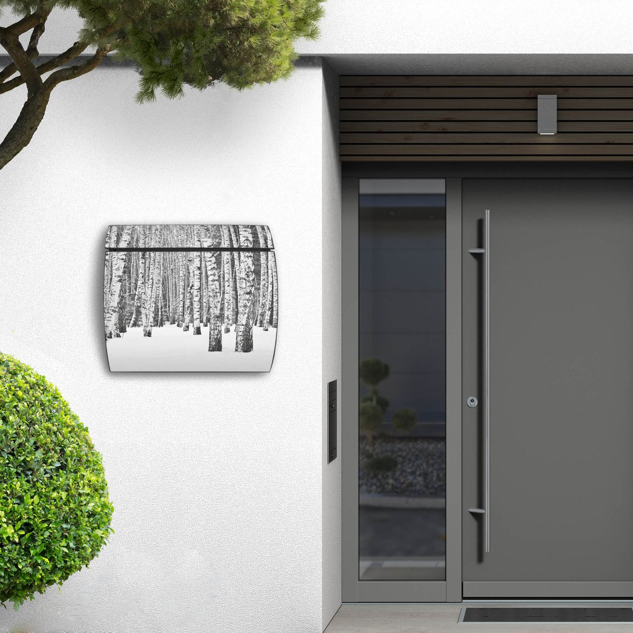 Der geschwungene Burg Wächter Briefkasten Toscana mit Motiv Winterlicher Birkenwald bietet Ihnen mit seinem großen Fassungsvermögen genügend Platz auch für große A4 Sendungen. Auf Wunsch können Sie bei uns den passenden Standfuß bestellen und so aus dem Wandbriefkasten einen Standbriefkasten machen. Der integrierte Öffnungsstopp ermöglicht eine einfache Handhabung beim Entnehmen der Post.