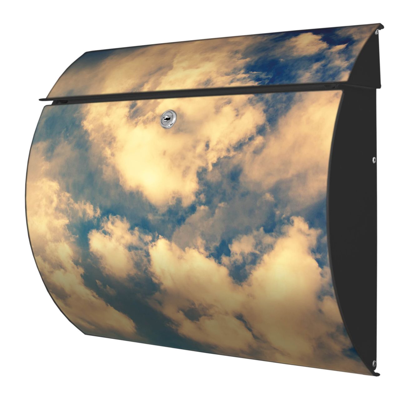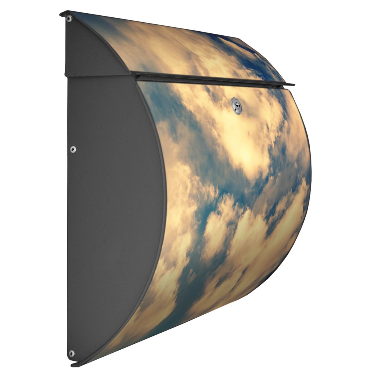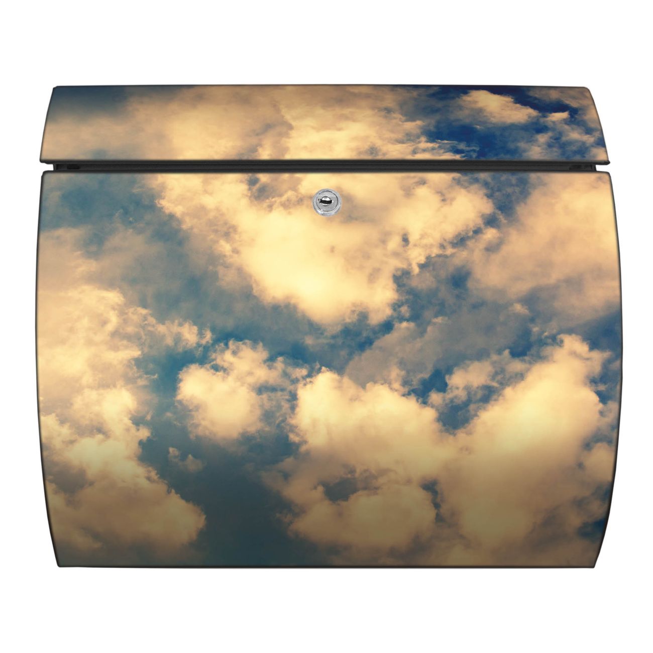 Der geschwungene Burg Wächter Briefkasten Toscana mit Motiv Wolken 3 bietet Ihnen mit seinem großen Fassungsvermögen genügend Platz auch für große A4 Sendungen. Auf Wunsch können Sie bei uns den passenden Standfuß bestellen und so aus dem Wandbriefkasten einen Standbriefkasten machen. Der integrierte Öffnungsstopp ermöglicht eine einfache Handhabung beim Entnehmen der Post.