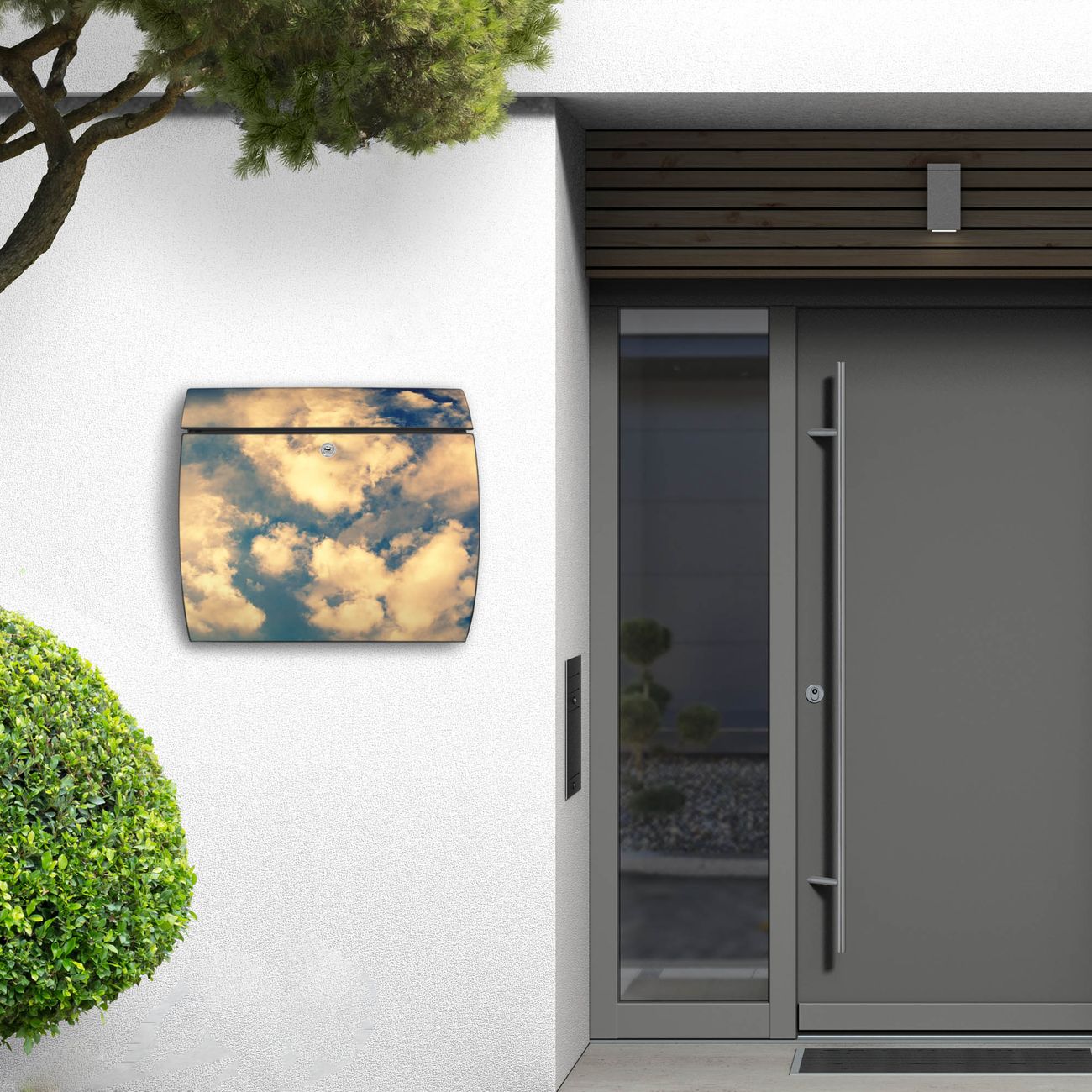 FUNKTION: DESIGN: Das Burg Wächter Modell Toscana mit Motiv Wolken 3 hat ein sehr ansprechendes und zeitloses Design und ist besonderes wetterfest. Heben Sie Sich von der tristen grauen Masse ab, ohne auf Funktionalität zu verzichten. Wir bieten Ihnen ebenfalls Namensschilder, bereits beschriftet oder frei zu beschriften, und verschiedene selbst gestaltete Bitte-Keine-Werbung-Aufkleber. DETAILS: Der Postkasten besteht aus vollflächig verzinktem Stahl welcher in Anthrazit oder Weiß lackiert wurde oder aus Edelstahl (je nach gewählter Variante). Das Motiv besteht aus einer wetter- und UV-festen Folie, die mit einem Schutzlaminat überzogen ist, durch die Ihren Briefkasten zusätzlich vor Kratzern geschützt ist und auf den Briefkasten kaschiert wurde. Sie erhalten zu Ihrem neuen Design Briefkasten 2 Schlüssel sowie das passende Montagematerial. BANJADO: Ihr Briefkasten wird von Burg Wächter in Deutschland gefertigt und in unserer kleinen Manufaktur von Hand veredelt. Die Motivfolie ist lösungsmittelfrei und schutzlaminiert, dies sorgt für einen langen Halt. Wir legen großen Wert auf die Verbindung von Funktionalität und Design. Sie erhalten besondere Handarbeit aus Sachsen und Made in Germany.