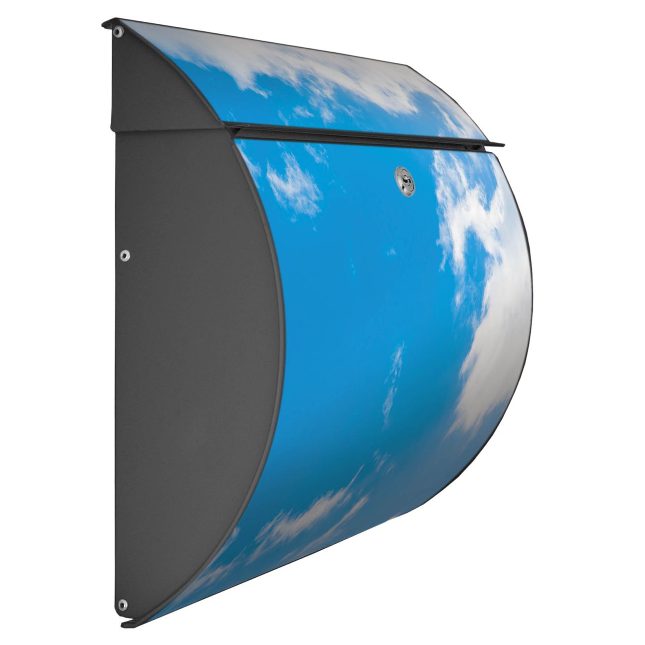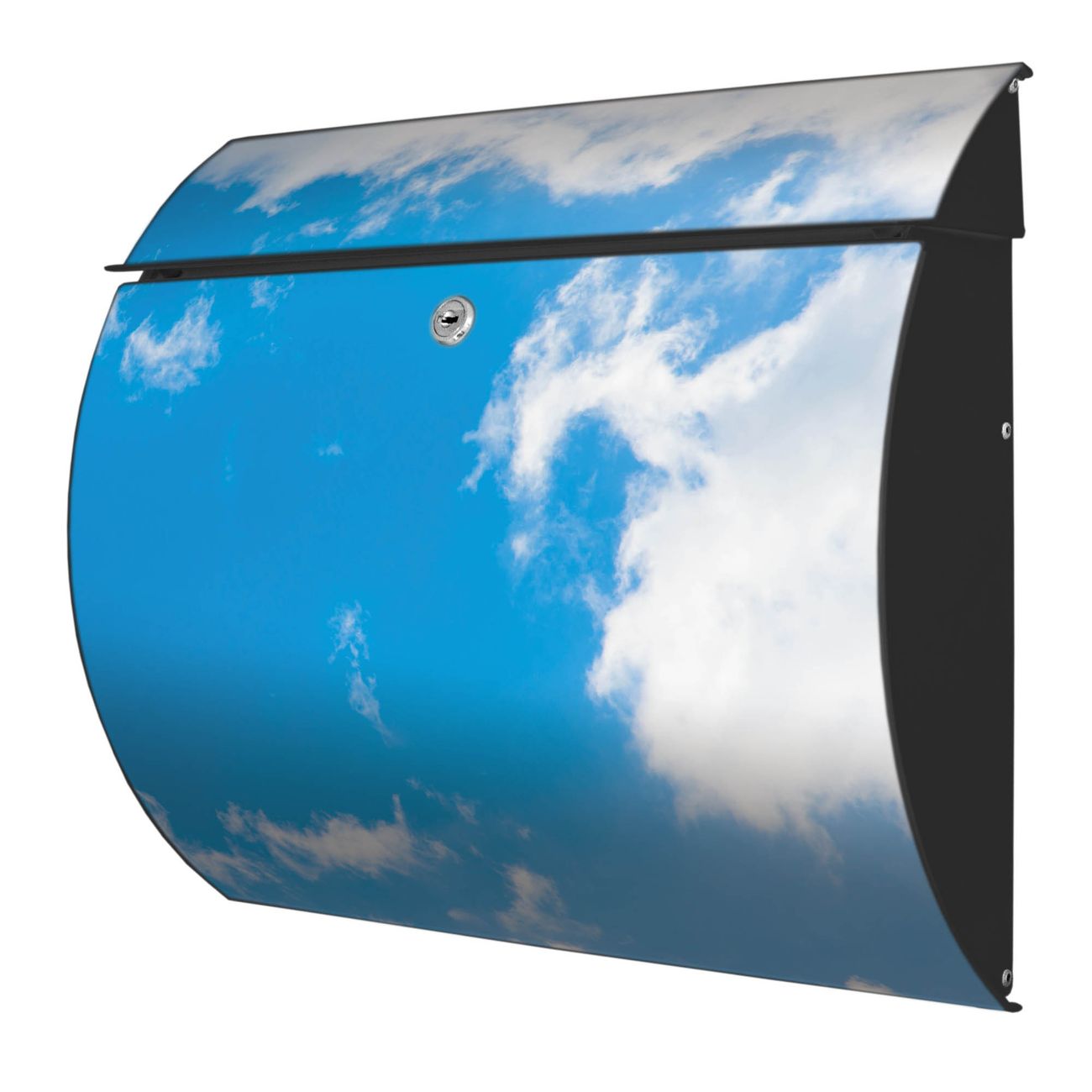 Der geschwungene Burg Wächter Briefkasten Toscana mit Motiv Wolken 9 bietet Ihnen mit seinem großen Fassungsvermögen genügend Platz auch für große A4 Sendungen. Auf Wunsch können Sie bei uns den passenden Standfuß bestellen und so aus dem Wandbriefkasten einen Standbriefkasten machen. Der integrierte Öffnungsstopp ermöglicht eine einfache Handhabung beim Entnehmen der Post.