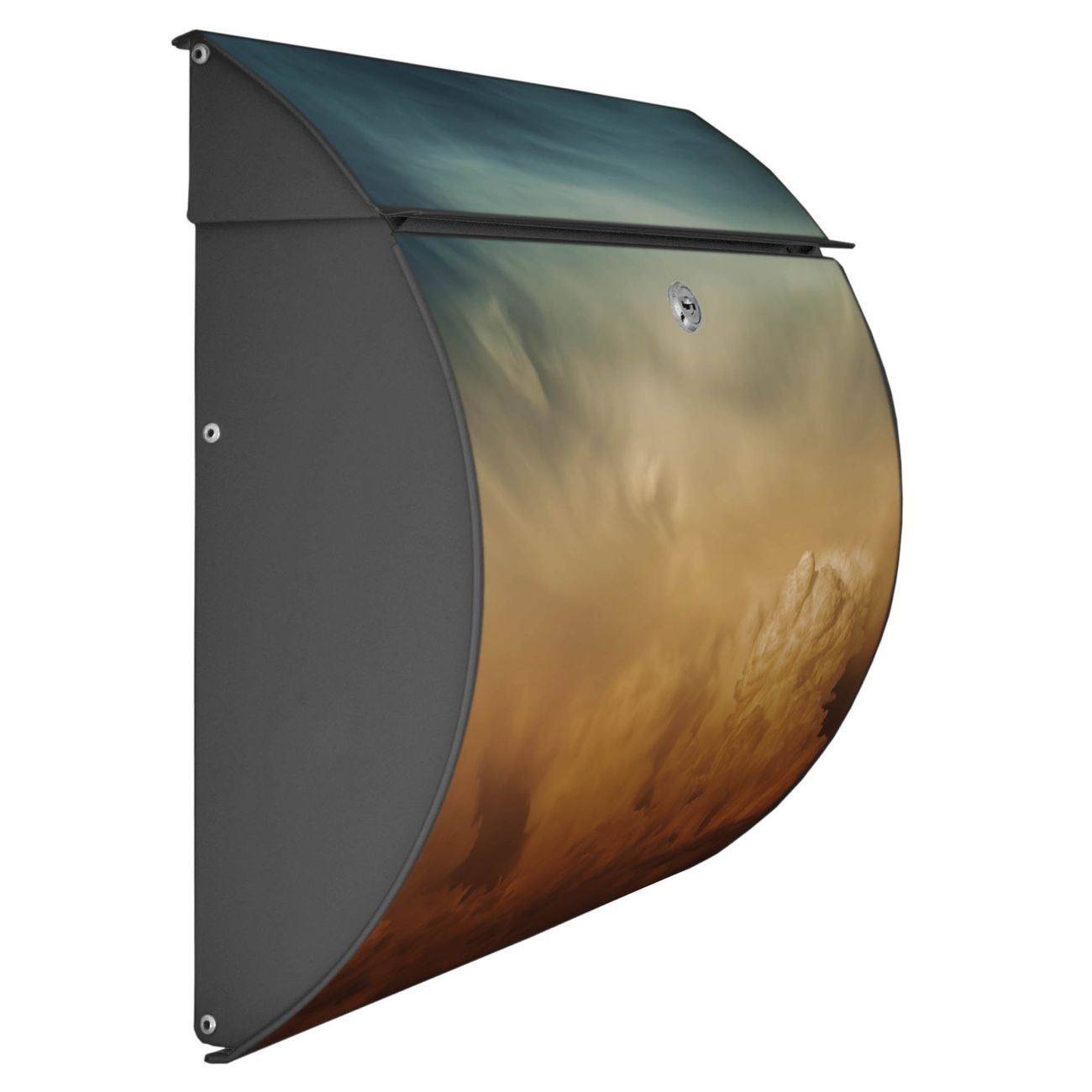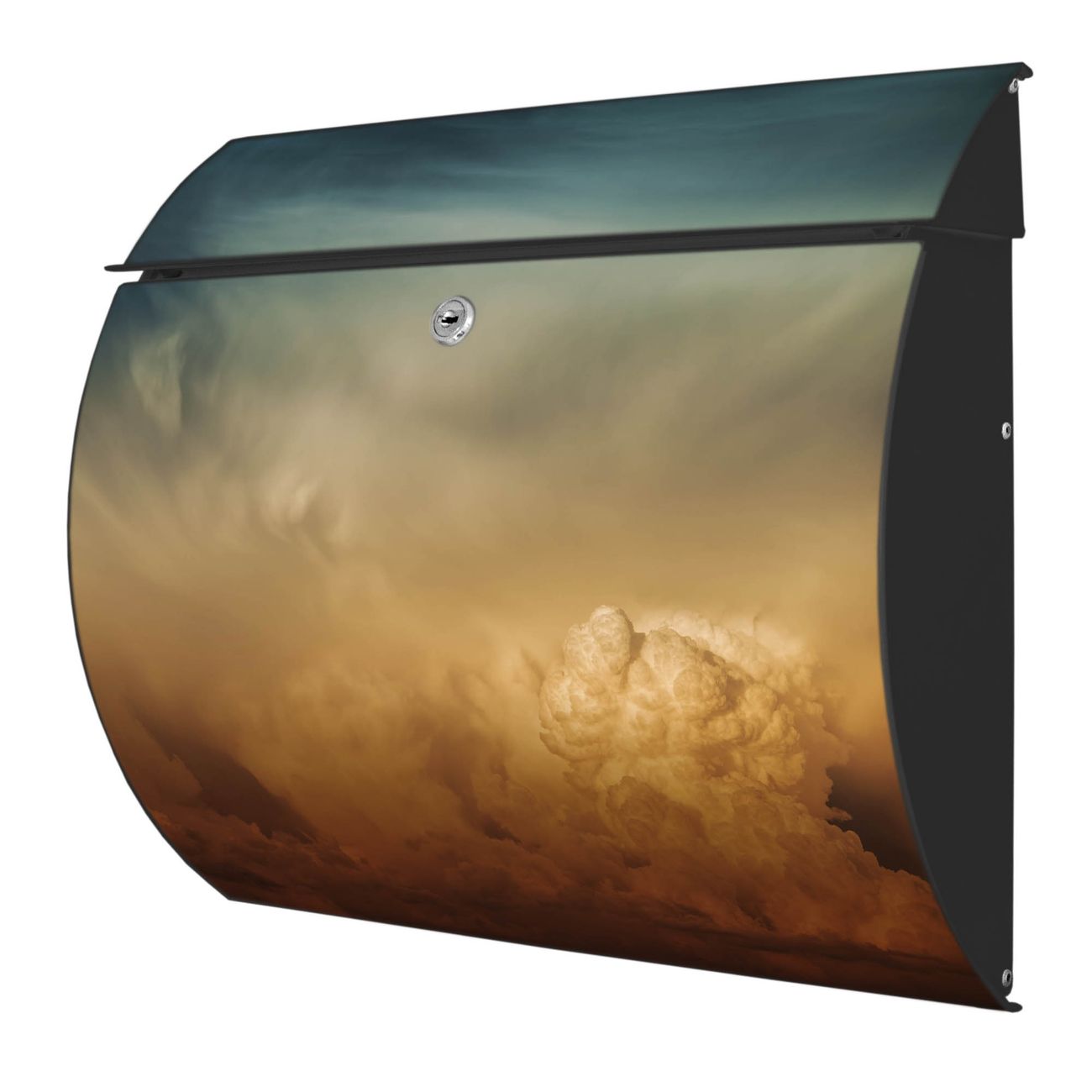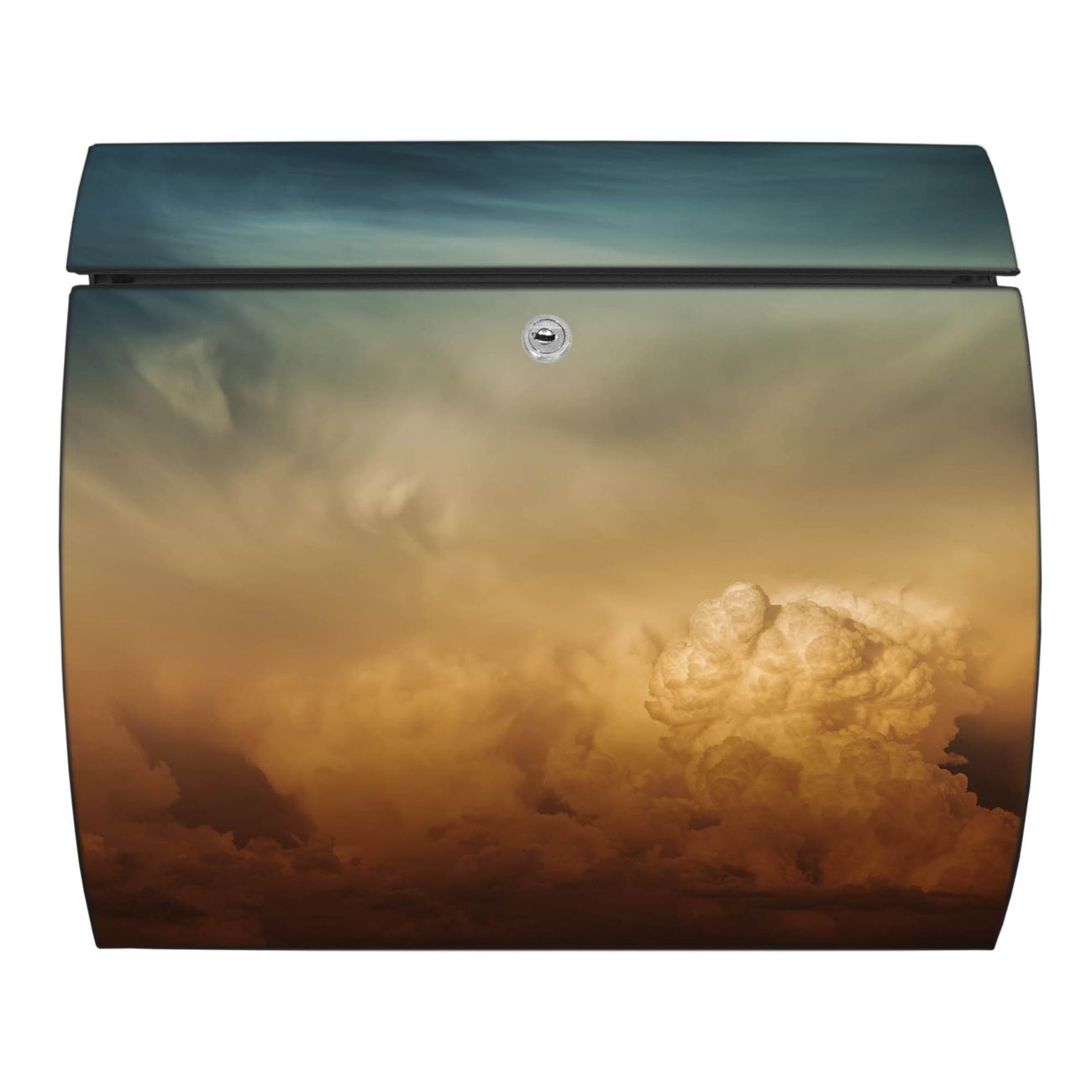 Der geschwungene Burg Wächter Briefkasten Toscana mit Motiv Wolken in der Dämmerung bietet Ihnen mit seinem großen Fassungsvermögen genügend Platz auch für große A4 Sendungen. Auf Wunsch können Sie bei uns den passenden Standfuß bestellen und so aus dem Wandbriefkasten einen Standbriefkasten machen. Der integrierte Öffnungsstopp ermöglicht eine einfache Handhabung beim Entnehmen der Post.