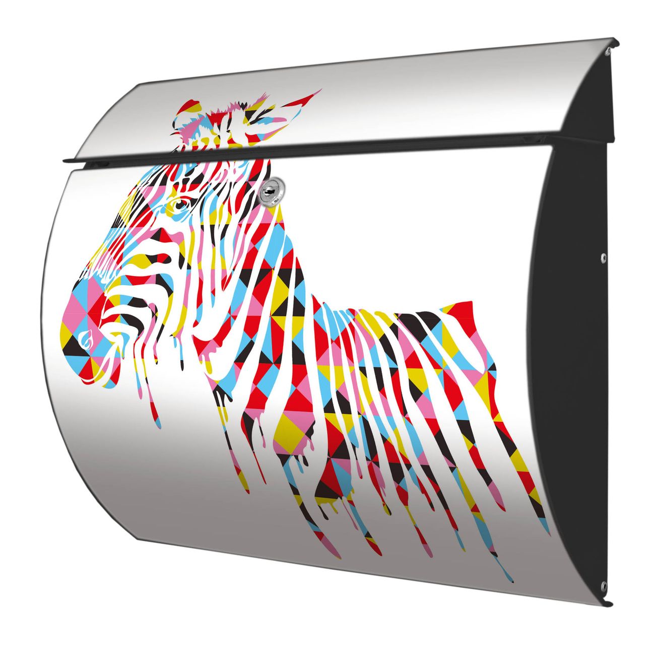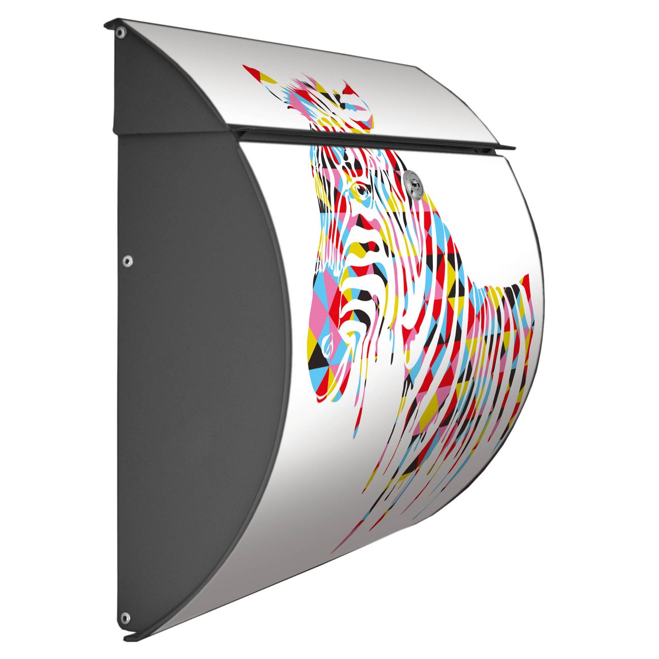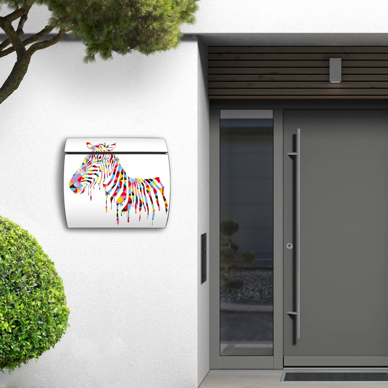 Der geschwungene Burg Wächter Briefkasten Toscana mit Motiv Zebra bietet Ihnen mit seinem großen Fassungsvermögen genügend Platz auch für große A4 Sendungen. Auf Wunsch können Sie bei uns den passenden Standfuß bestellen und so aus dem Wandbriefkasten einen Standbriefkasten machen. Der integrierte Öffnungsstopp ermöglicht eine einfache Handhabung beim Entnehmen der Post.