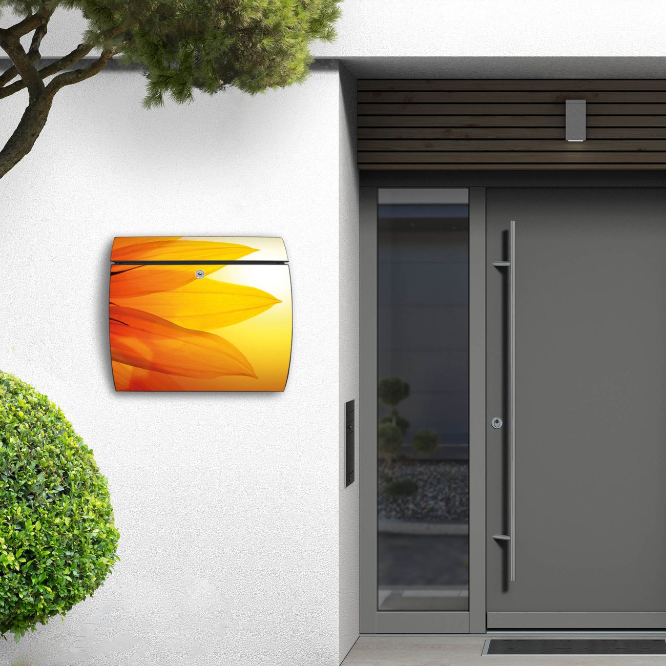 FUNKTION: DESIGN: Das Burg Wächter Modell Toscana mit Motiv Zwei Sonnen hat ein sehr ansprechendes und zeitloses Design und ist besonderes wetterfest. Heben Sie Sich von der tristen grauen Masse ab, ohne auf Funktionalität zu verzichten. Wir bieten Ihnen ebenfalls Namensschilder, bereits beschriftet oder frei zu beschriften, und verschiedene selbst gestaltete Bitte-Keine-Werbung-Aufkleber. DETAILS: Der Postkasten besteht aus vollflächig verzinktem Stahl welcher in Anthrazit oder Weiß lackiert wurde oder aus Edelstahl (je nach gewählter Variante). Das Motiv besteht aus einer wetter- und UV-festen Folie, die mit einem Schutzlaminat überzogen ist, durch die Ihren Briefkasten zusätzlich vor Kratzern geschützt ist und auf den Briefkasten kaschiert wurde. Sie erhalten zu Ihrem neuen Design Briefkasten 2 Schlüssel sowie das passende Montagematerial. BANJADO: Ihr Briefkasten wird von Burg Wächter in Deutschland gefertigt und in unserer kleinen Manufaktur von Hand veredelt. Die Motivfolie ist lösungsmittelfrei und schutzlaminiert, dies sorgt für einen langen Halt. Wir legen großen Wert auf die Verbindung von Funktionalität und Design. Sie erhalten besondere Handarbeit aus Sachsen und Made in Germany.