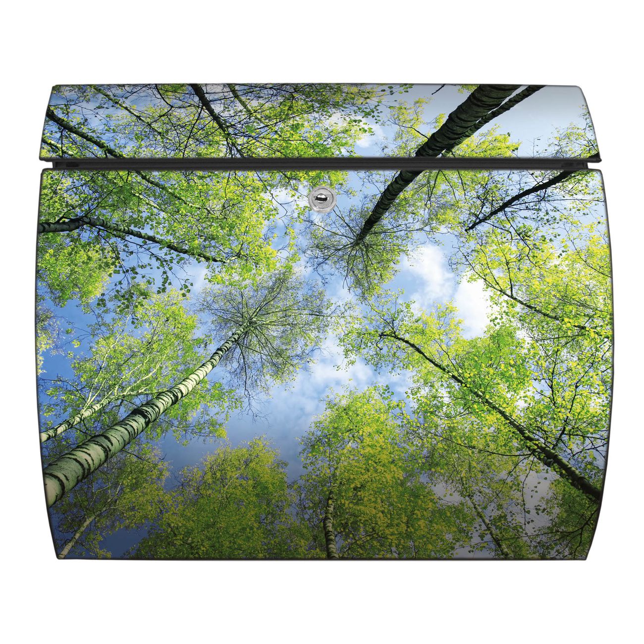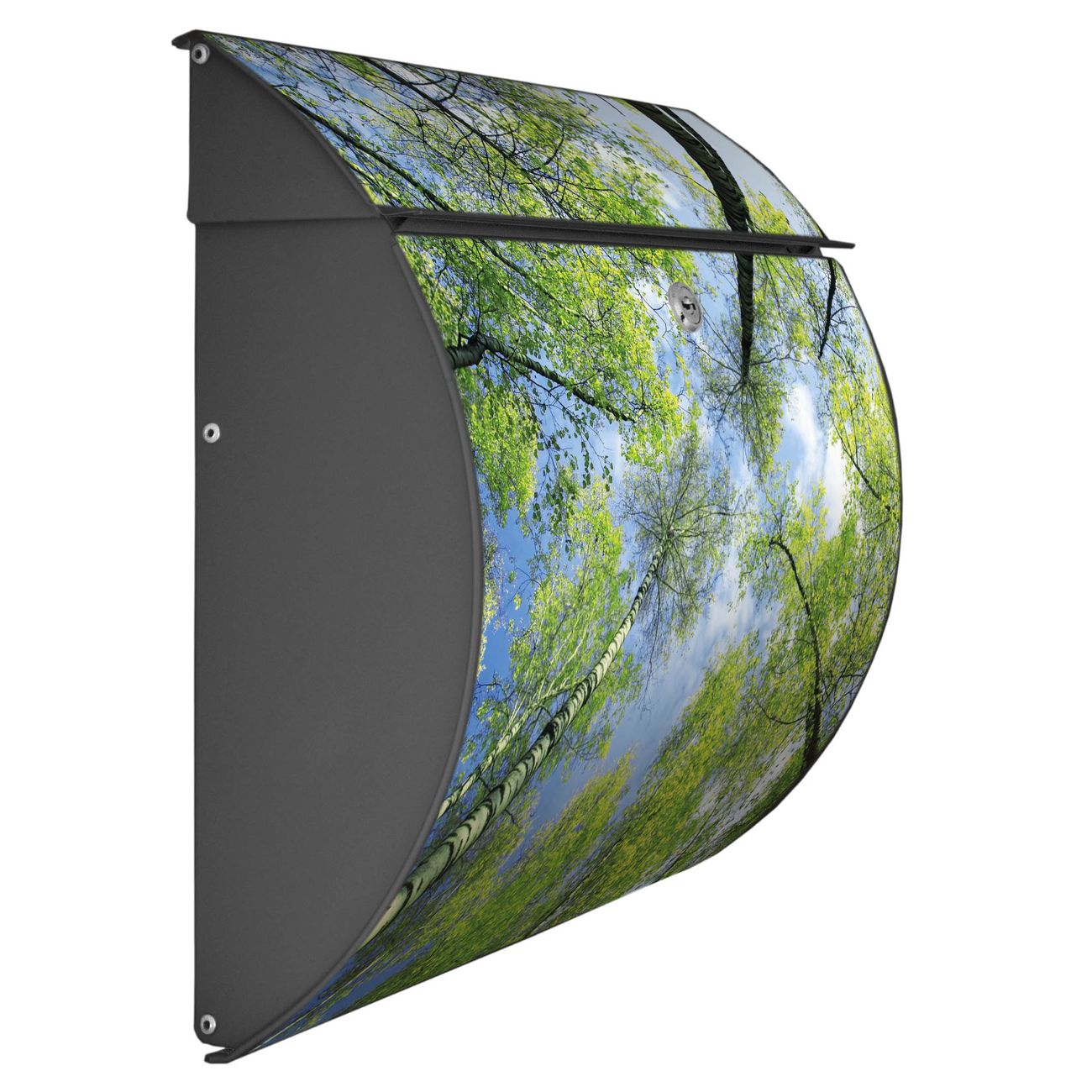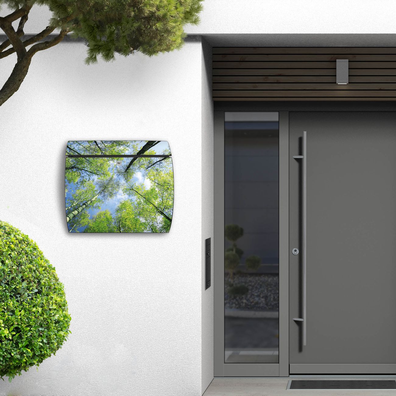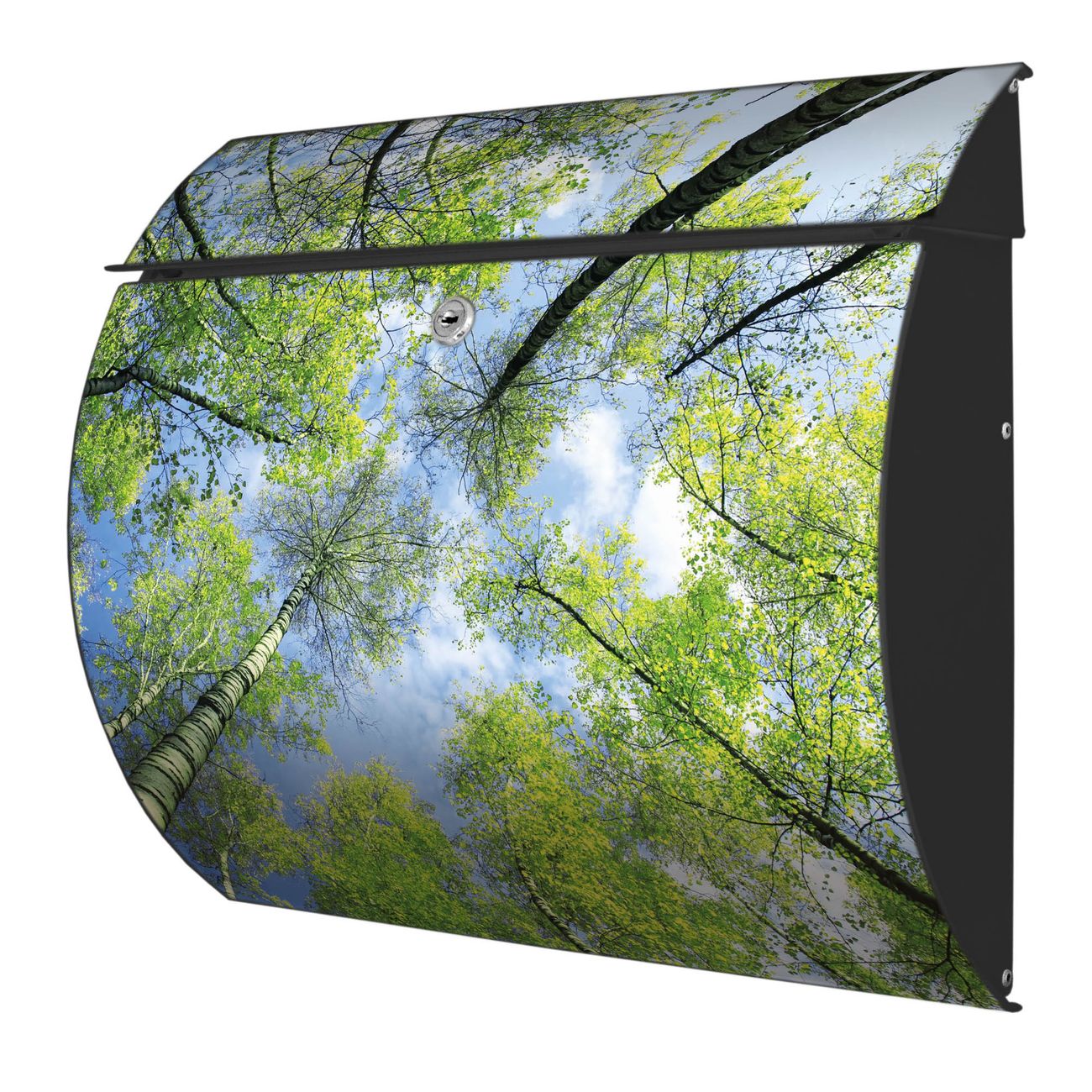 FUNKTION: DESIGN: Das Burg Wächter Modell Toscana mit Motiv Zwischen Bäumen 3 hat ein sehr ansprechendes und zeitloses Design und ist besonderes wetterfest. Heben Sie Sich von der tristen grauen Masse ab, ohne auf Funktionalität zu verzichten. Wir bieten Ihnen ebenfalls Namensschilder, bereits beschriftet oder frei zu beschriften, und verschiedene selbst gestaltete Bitte-Keine-Werbung-Aufkleber. DETAILS: Der Postkasten besteht aus vollflächig verzinktem Stahl welcher in Anthrazit oder Weiß lackiert wurde oder aus Edelstahl (je nach gewählter Variante). Das Motiv besteht aus einer wetter- und UV-festen Folie, die mit einem Schutzlaminat überzogen ist, durch die Ihren Briefkasten zusätzlich vor Kratzern geschützt ist und auf den Briefkasten kaschiert wurde. Sie erhalten zu Ihrem neuen Design Briefkasten 2 Schlüssel sowie das passende Montagematerial. BANJADO: Ihr Briefkasten wird von Burg Wächter in Deutschland gefertigt und in unserer kleinen Manufaktur von Hand veredelt. Die Motivfolie ist lösungsmittelfrei und schutzlaminiert, dies sorgt für einen langen Halt. Wir legen großen Wert auf die Verbindung von Funktionalität und Design. Sie erhalten besondere Handarbeit aus Sachsen und Made in Germany.