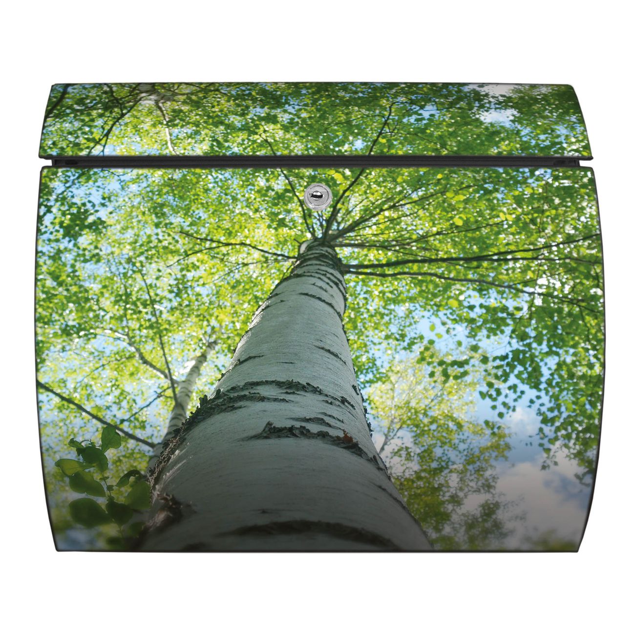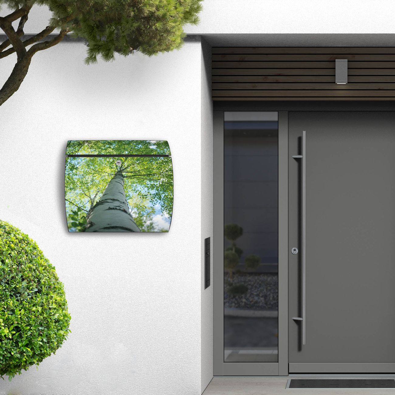 FUNKTION: DESIGN: Das Burg Wächter Modell Toscana mit Motiv Zwischen Bäumen 5 hat ein sehr ansprechendes und zeitloses Design und ist besonderes wetterfest. Heben Sie Sich von der tristen grauen Masse ab, ohne auf Funktionalität zu verzichten. Wir bieten Ihnen ebenfalls Namensschilder, bereits beschriftet oder frei zu beschriften, und verschiedene selbst gestaltete Bitte-Keine-Werbung-Aufkleber. DETAILS: Der Postkasten besteht aus vollflächig verzinktem Stahl welcher in Anthrazit oder Weiß lackiert wurde oder aus Edelstahl (je nach gewählter Variante). Das Motiv besteht aus einer wetter- und UV-festen Folie, die mit einem Schutzlaminat überzogen ist, durch die Ihren Briefkasten zusätzlich vor Kratzern geschützt ist und auf den Briefkasten kaschiert wurde. Sie erhalten zu Ihrem neuen Design Briefkasten 2 Schlüssel sowie das passende Montagematerial. BANJADO: Ihr Briefkasten wird von Burg Wächter in Deutschland gefertigt und in unserer kleinen Manufaktur von Hand veredelt. Die Motivfolie ist lösungsmittelfrei und schutzlaminiert, dies sorgt für einen langen Halt. Wir legen großen Wert auf die Verbindung von Funktionalität und Design. Sie erhalten besondere Handarbeit aus Sachsen und Made in Germany.