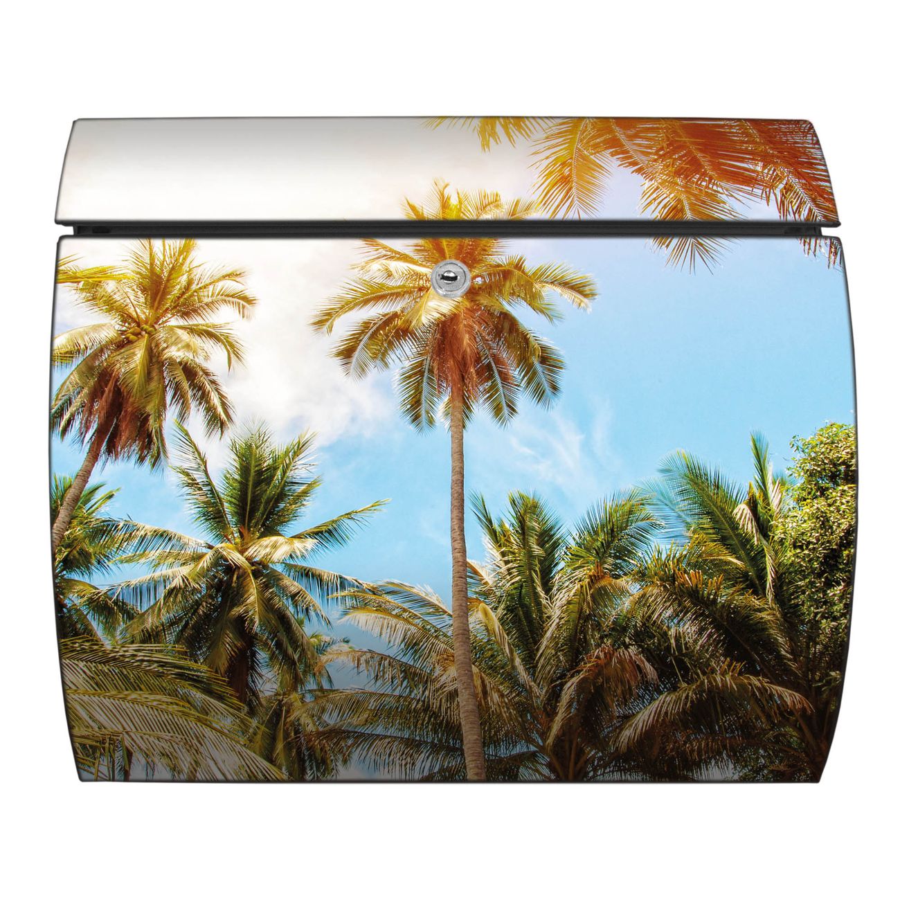 Der geschwungene Burg Wächter Briefkasten Toscana mit Motiv Zwischen Palmen bietet Ihnen mit seinem großen Fassungsvermögen genügend Platz auch für große A4 Sendungen. Auf Wunsch können Sie bei uns den passenden Standfuß bestellen und so aus dem Wandbriefkasten einen Standbriefkasten machen. Der integrierte Öffnungsstopp ermöglicht eine einfache Handhabung beim Entnehmen der Post.