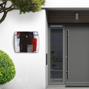 FUNKTION: DESIGN: Das Burg Wächter Modell Toscana mit Motiv Abstrakt Rot hat ein sehr ansprechendes und zeitloses Design und ist besonderes wetterfest. Heben Sie Sich von der tristen grauen Masse ab, ohne auf Funktionalität zu verzichten. Wir bieten Ihnen ebenfalls Namensschilder, bereits beschriftet oder frei zu beschriften, und verschiedene selbst gestaltete Bitte-Keine-Werbung-Aufkleber. DETAILS: Der Postkasten besteht aus vollflächig verzinktem Stahl welcher in Anthrazit oder Weiß lackiert wurde oder aus Edelstahl (je nach gewählter Variante). Das Motiv besteht aus einer wetter- und UV-festen Folie, die mit einem Schutzlaminat überzogen ist, durch die Ihren Briefkasten zusätzlich vor Kratzern geschützt ist und auf den Briefkasten kaschiert wurde. Sie erhalten zu Ihrem neuen Design Briefkasten 2 Schlüssel sowie das passende Montagematerial. BANJADO: Ihr Briefkasten wird von Burg Wächter in Deutschland gefertigt und in unserer kleinen Manufaktur von Hand veredelt. Die Motivfolie ist lösungsmittelfrei und schutzlaminiert, dies sorgt für einen langen Halt. Wir legen großen Wert auf die Verbindung von Funktionalität und Design. Sie erhalten besondere Handarbeit aus Sachsen und Made in Germany.