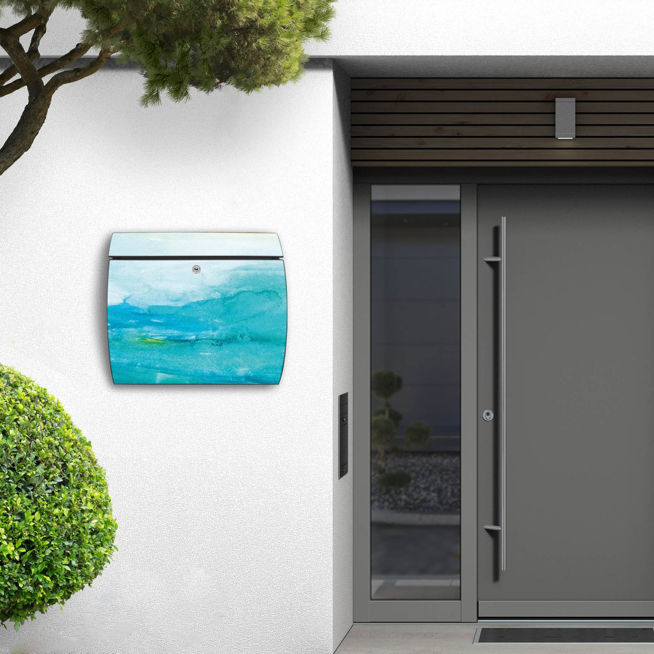 FUNKTION: DESIGN: Das Burg Wächter Modell Toscana mit Motiv Aquarell Blau hat ein sehr ansprechendes und zeitloses Design und ist besonderes wetterfest. Heben Sie Sich von der tristen grauen Masse ab, ohne auf Funktionalität zu verzichten. Wir bieten Ihnen ebenfalls Namensschilder, bereits beschriftet oder frei zu beschriften, und verschiedene selbst gestaltete Bitte-Keine-Werbung-Aufkleber. DETAILS: Der Postkasten besteht aus vollflächig verzinktem Stahl welcher in Anthrazit oder Weiß lackiert wurde oder aus Edelstahl (je nach gewählter Variante). Das Motiv besteht aus einer wetter- und UV-festen Folie, die mit einem Schutzlaminat überzogen ist, durch die Ihren Briefkasten zusätzlich vor Kratzern geschützt ist und auf den Briefkasten kaschiert wurde. Sie erhalten zu Ihrem neuen Design Briefkasten 2 Schlüssel sowie das passende Montagematerial. BANJADO: Ihr Briefkasten wird von Burg Wächter in Deutschland gefertigt und in unserer kleinen Manufaktur von Hand veredelt. Die Motivfolie ist lösungsmittelfrei und schutzlaminiert, dies sorgt für einen langen Halt. Wir legen großen Wert auf die Verbindung von Funktionalität und Design. Sie erhalten besondere Handarbeit aus Sachsen und Made in Germany.
