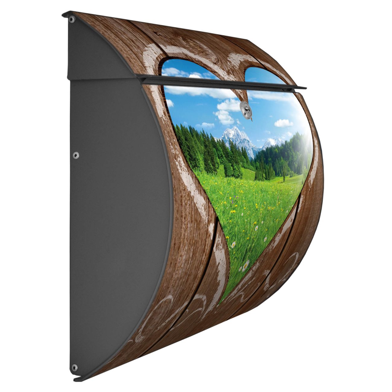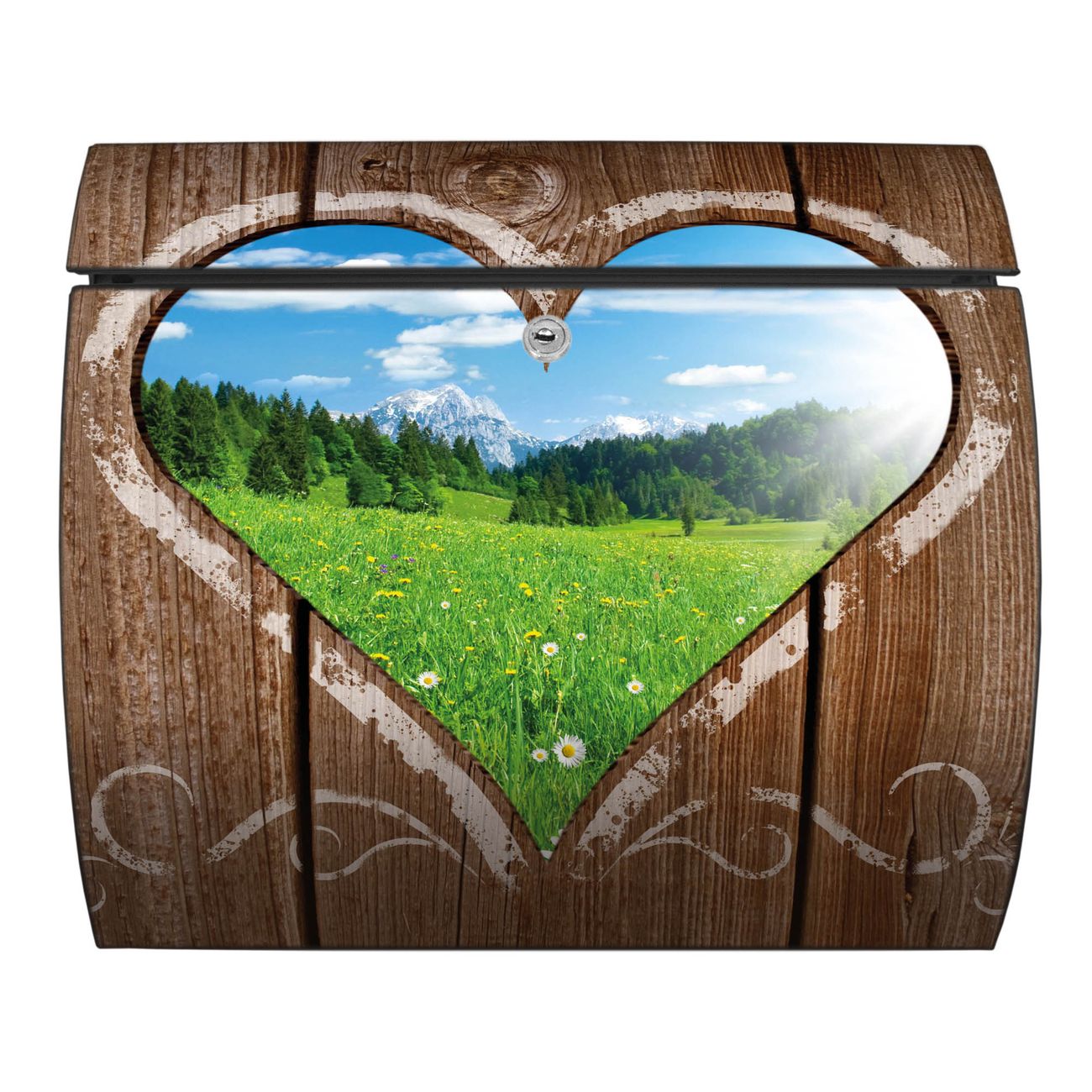 Der geschwungene Burg Wächter Briefkasten Toscana mit Motiv Ausblick mit Herz bietet Ihnen mit seinem großen Fassungsvermögen genügend Platz auch für große A4 Sendungen. Auf Wunsch können Sie bei uns den passenden Standfuß bestellen und so aus dem Wandbriefkasten einen Standbriefkasten machen. Der integrierte Öffnungsstopp ermöglicht eine einfache Handhabung beim Entnehmen der Post.
