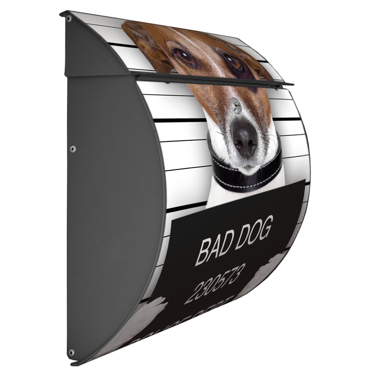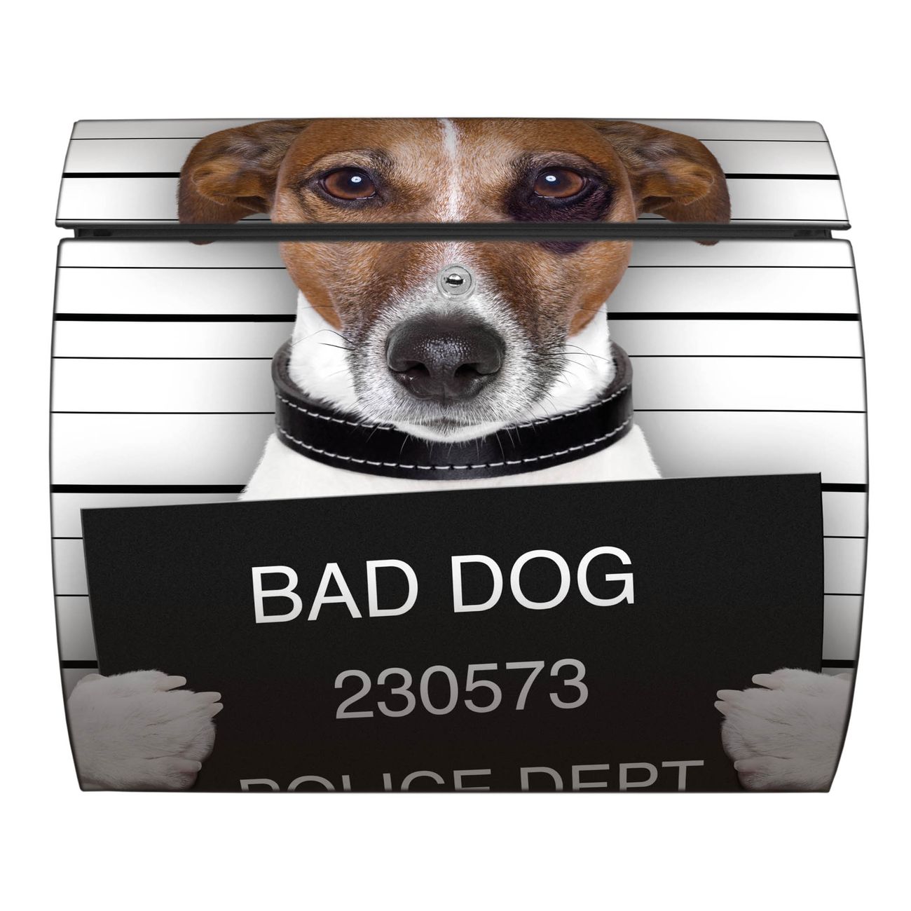 Der geschwungene Burg Wächter Briefkasten Toscana mit Motiv Bad Dog Jack Russel bietet Ihnen mit seinem großen Fassungsvermögen genügend Platz auch für große A4 Sendungen. Auf Wunsch können Sie bei uns den passenden Standfuß bestellen und so aus dem Wandbriefkasten einen Standbriefkasten machen. Der integrierte Öffnungsstopp ermöglicht eine einfache Handhabung beim Entnehmen der Post.