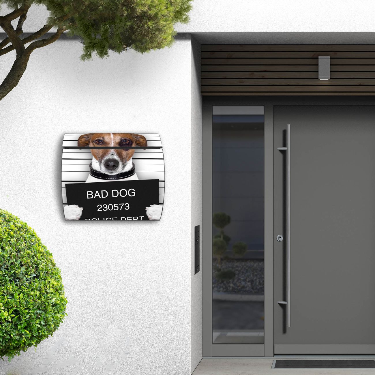 FUNKTION: DESIGN: Das Burg Wächter Modell Toscana mit Motiv Bad Dog Jack Russel hat ein sehr ansprechendes und zeitloses Design und ist besonderes wetterfest. Heben Sie Sich von der tristen grauen Masse ab, ohne auf Funktionalität zu verzichten. Wir bieten Ihnen ebenfalls Namensschilder, bereits beschriftet oder frei zu beschriften, und verschiedene selbst gestaltete Bitte-Keine-Werbung-Aufkleber. DETAILS: Der Postkasten besteht aus vollflächig verzinktem Stahl welcher in Anthrazit oder Weiß lackiert wurde oder aus Edelstahl (je nach gewählter Variante). Das Motiv besteht aus einer wetter- und UV-festen Folie, die mit einem Schutzlaminat überzogen ist, durch die Ihren Briefkasten zusätzlich vor Kratzern geschützt ist und auf den Briefkasten kaschiert wurde. Sie erhalten zu Ihrem neuen Design Briefkasten 2 Schlüssel sowie das passende Montagematerial. BANJADO: Ihr Briefkasten wird von Burg Wächter in Deutschland gefertigt und in unserer kleinen Manufaktur von Hand veredelt. Die Motivfolie ist lösungsmittelfrei und schutzlaminiert, dies sorgt für einen langen Halt. Wir legen großen Wert auf die Verbindung von Funktionalität und Design. Sie erhalten besondere Handarbeit aus Sachsen und Made in Germany.