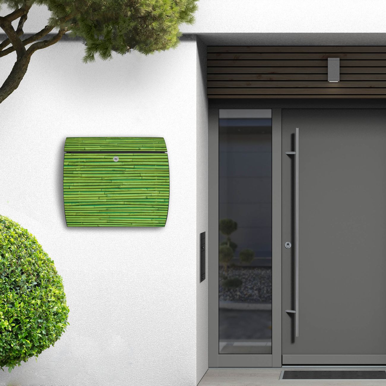 FUNKTION: DESIGN: Das Burg Wächter Modell Toscana mit Motiv Bambus Grün hat ein sehr ansprechendes und zeitloses Design und ist besonderes wetterfest. Heben Sie Sich von der tristen grauen Masse ab, ohne auf Funktionalität zu verzichten. Wir bieten Ihnen ebenfalls Namensschilder, bereits beschriftet oder frei zu beschriften, und verschiedene selbst gestaltete Bitte-Keine-Werbung-Aufkleber. DETAILS: Der Postkasten besteht aus vollflächig verzinktem Stahl welcher in Anthrazit oder Weiß lackiert wurde oder aus Edelstahl (je nach gewählter Variante). Das Motiv besteht aus einer wetter- und UV-festen Folie, die mit einem Schutzlaminat überzogen ist, durch die Ihren Briefkasten zusätzlich vor Kratzern geschützt ist und auf den Briefkasten kaschiert wurde. Sie erhalten zu Ihrem neuen Design Briefkasten 2 Schlüssel sowie das passende Montagematerial. BANJADO: Ihr Briefkasten wird von Burg Wächter in Deutschland gefertigt und in unserer kleinen Manufaktur von Hand veredelt. Die Motivfolie ist lösungsmittelfrei und schutzlaminiert, dies sorgt für einen langen Halt. Wir legen großen Wert auf die Verbindung von Funktionalität und Design. Sie erhalten besondere Handarbeit aus Sachsen und Made in Germany.