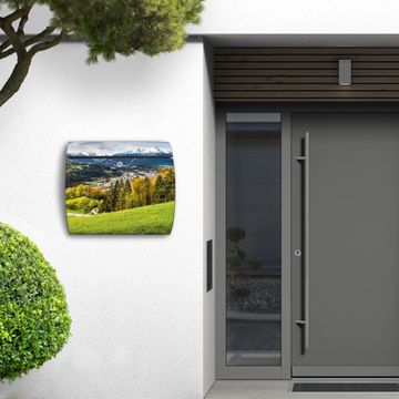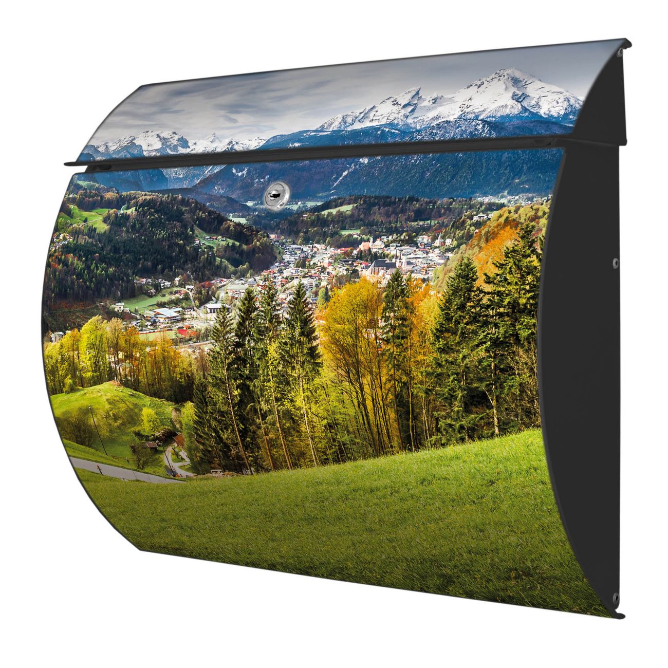 Der geschwungene Burg Wächter Briefkasten Toscana mit Motiv Berchtesgadener Land bietet Ihnen mit seinem großen Fassungsvermögen genügend Platz auch für große A4 Sendungen. Auf Wunsch können Sie bei uns den passenden Standfuß bestellen und so aus dem Wandbriefkasten einen Standbriefkasten machen. Der integrierte Öffnungsstopp ermöglicht eine einfache Handhabung beim Entnehmen der Post.