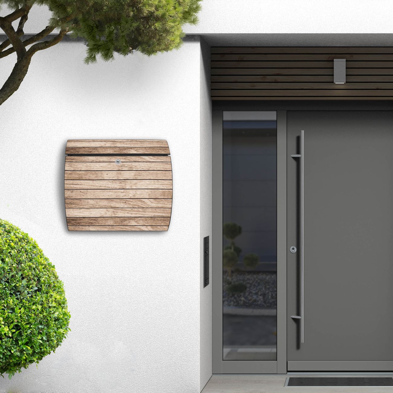 Der geschwungene Burg Wächter Briefkasten Toscana mit Motiv Blasse Holzlatten bietet Ihnen mit seinem großen Fassungsvermögen genügend Platz auch für große A4 Sendungen. Auf Wunsch können Sie bei uns den passenden Standfuß bestellen und so aus dem Wandbriefkasten einen Standbriefkasten machen. Der integrierte Öffnungsstopp ermöglicht eine einfache Handhabung beim Entnehmen der Post.