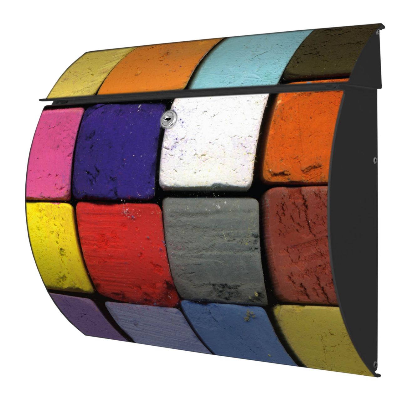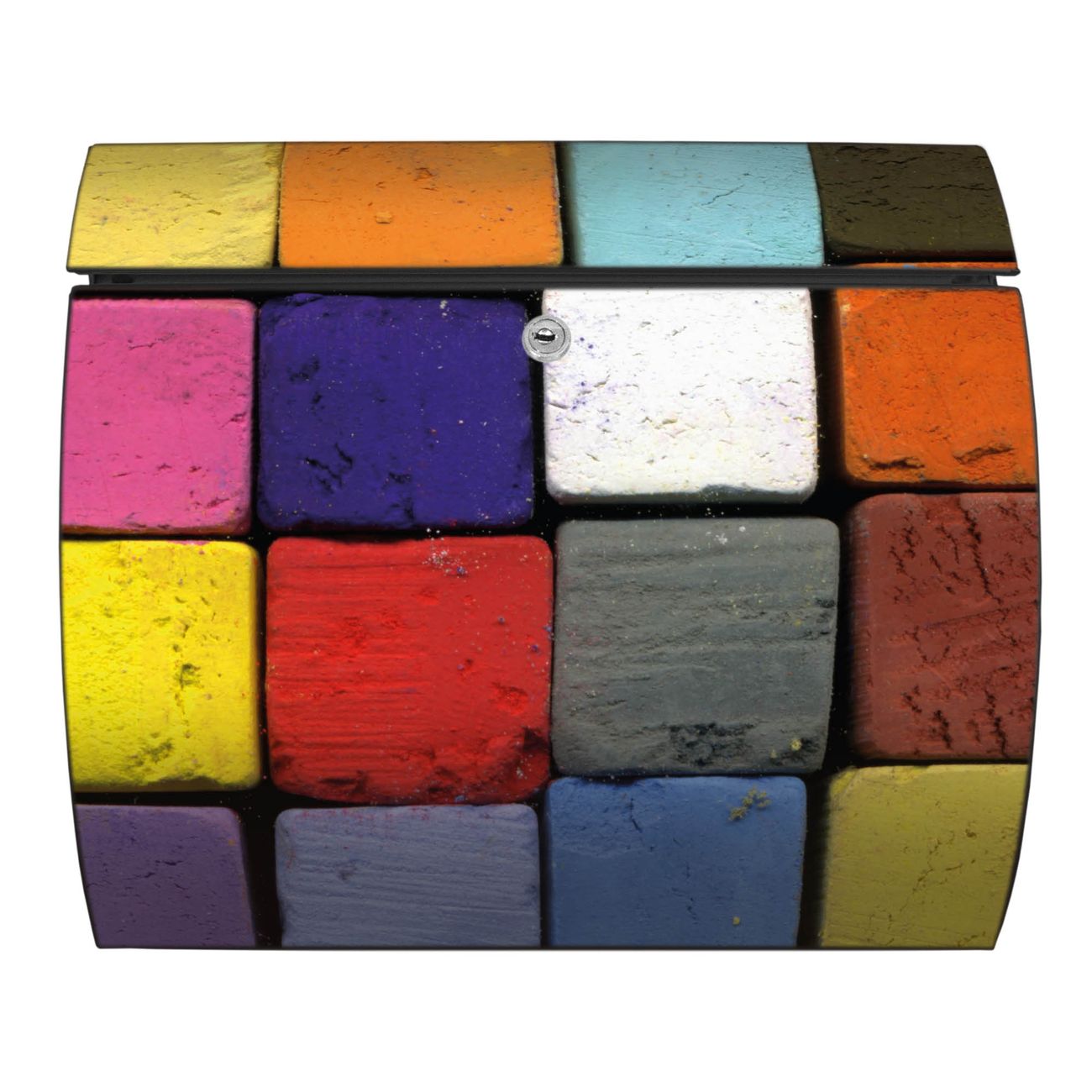 Der geschwungene Burg Wächter Briefkasten Toscana mit Motiv Bunte Kreide bietet Ihnen mit seinem großen Fassungsvermögen genügend Platz auch für große A4 Sendungen. Auf Wunsch können Sie bei uns den passenden Standfuß bestellen und so aus dem Wandbriefkasten einen Standbriefkasten machen. Der integrierte Öffnungsstopp ermöglicht eine einfache Handhabung beim Entnehmen der Post.