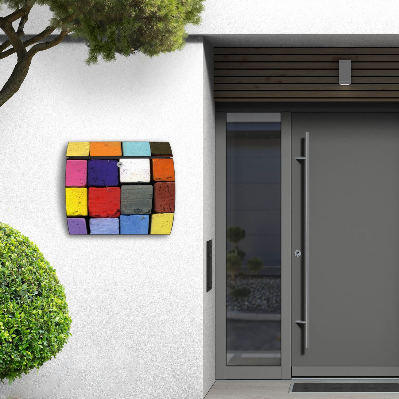 FUNKTION: DESIGN: Das Burg Wächter Modell Toscana mit Motiv Bunte Kreide hat ein sehr ansprechendes und zeitloses Design und ist besonderes wetterfest. Heben Sie Sich von der tristen grauen Masse ab, ohne auf Funktionalität zu verzichten. Wir bieten Ihnen ebenfalls Namensschilder, bereits beschriftet oder frei zu beschriften, und verschiedene selbst gestaltete Bitte-Keine-Werbung-Aufkleber. DETAILS: Der Postkasten besteht aus vollflächig verzinktem Stahl welcher in Anthrazit oder Weiß lackiert wurde oder aus Edelstahl (je nach gewählter Variante). Das Motiv besteht aus einer wetter- und UV-festen Folie, die mit einem Schutzlaminat überzogen ist, durch die Ihren Briefkasten zusätzlich vor Kratzern geschützt ist und auf den Briefkasten kaschiert wurde. Sie erhalten zu Ihrem neuen Design Briefkasten 2 Schlüssel sowie das passende Montagematerial. BANJADO: Ihr Briefkasten wird von Burg Wächter in Deutschland gefertigt und in unserer kleinen Manufaktur von Hand veredelt. Die Motivfolie ist lösungsmittelfrei und schutzlaminiert, dies sorgt für einen langen Halt. Wir legen großen Wert auf die Verbindung von Funktionalität und Design. Sie erhalten besondere Handarbeit aus Sachsen und Made in Germany.
