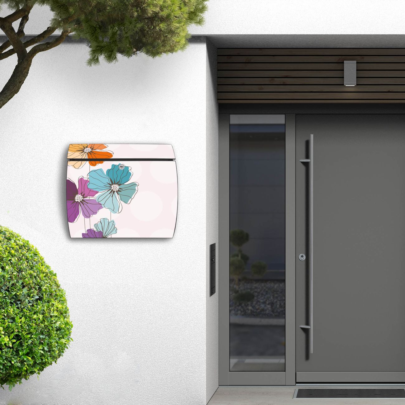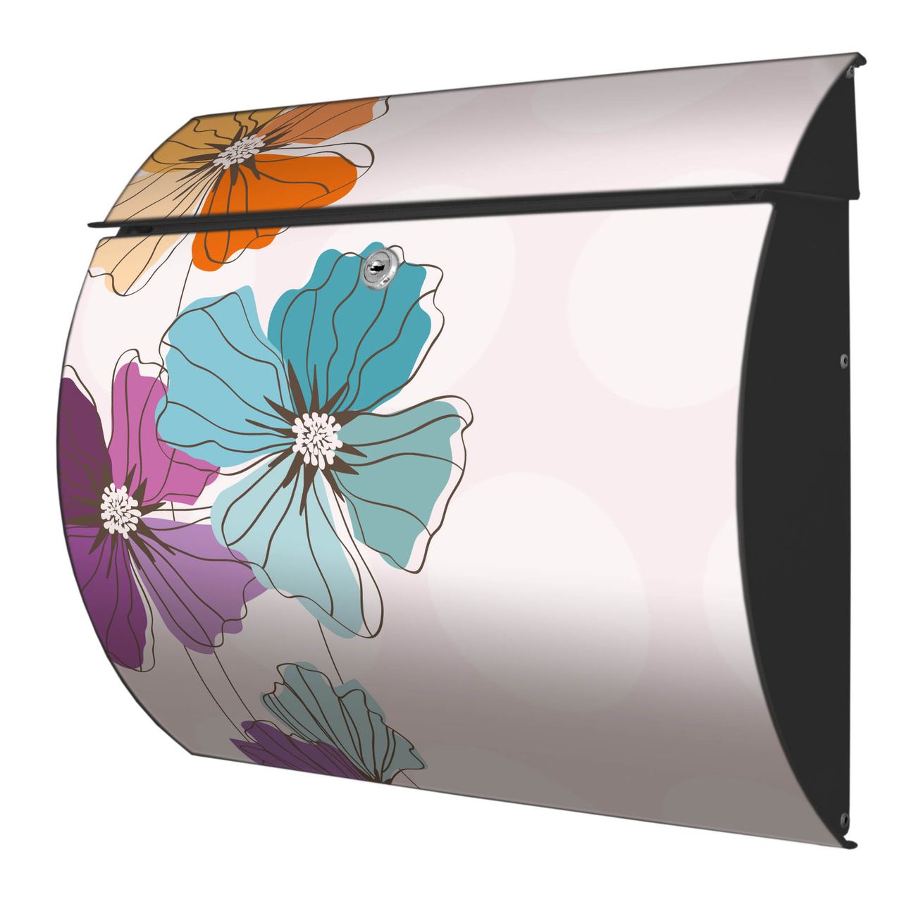 Der geschwungene Burg Wächter Briefkasten Toscana mit Motiv Bunter Mohn bietet Ihnen mit seinem großen Fassungsvermögen genügend Platz auch für große A4 Sendungen. Auf Wunsch können Sie bei uns den passenden Standfuß bestellen und so aus dem Wandbriefkasten einen Standbriefkasten machen. Der integrierte Öffnungsstopp ermöglicht eine einfache Handhabung beim Entnehmen der Post.