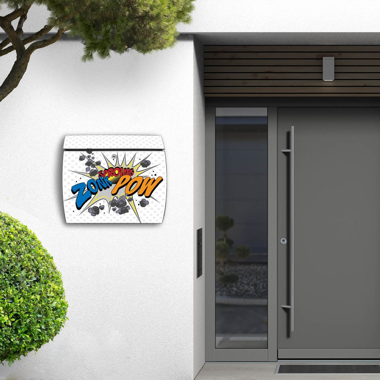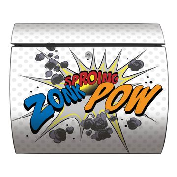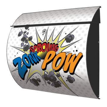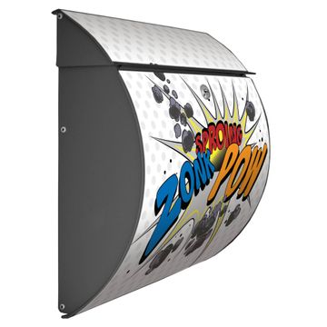 FUNKTION: DESIGN: Das Burg Wächter Modell Toscana mit Motiv Comic hat ein sehr ansprechendes und zeitloses Design und ist besonderes wetterfest. Heben Sie Sich von der tristen grauen Masse ab, ohne auf Funktionalität zu verzichten. Wir bieten Ihnen ebenfalls Namensschilder, bereits beschriftet oder frei zu beschriften, und verschiedene selbst gestaltete Bitte-Keine-Werbung-Aufkleber. DETAILS: Der Postkasten besteht aus vollflächig verzinktem Stahl welcher in Anthrazit oder Weiß lackiert wurde oder aus Edelstahl (je nach gewählter Variante). Das Motiv besteht aus einer wetter- und UV-festen Folie, die mit einem Schutzlaminat überzogen ist, durch die Ihren Briefkasten zusätzlich vor Kratzern geschützt ist und auf den Briefkasten kaschiert wurde. Sie erhalten zu Ihrem neuen Design Briefkasten 2 Schlüssel sowie das passende Montagematerial. BANJADO: Ihr Briefkasten wird von Burg Wächter in Deutschland gefertigt und in unserer kleinen Manufaktur von Hand veredelt. Die Motivfolie ist lösungsmittelfrei und schutzlaminiert, dies sorgt für einen langen Halt. Wir legen großen Wert auf die Verbindung von Funktionalität und Design. Sie erhalten besondere Handarbeit aus Sachsen und Made in Germany.