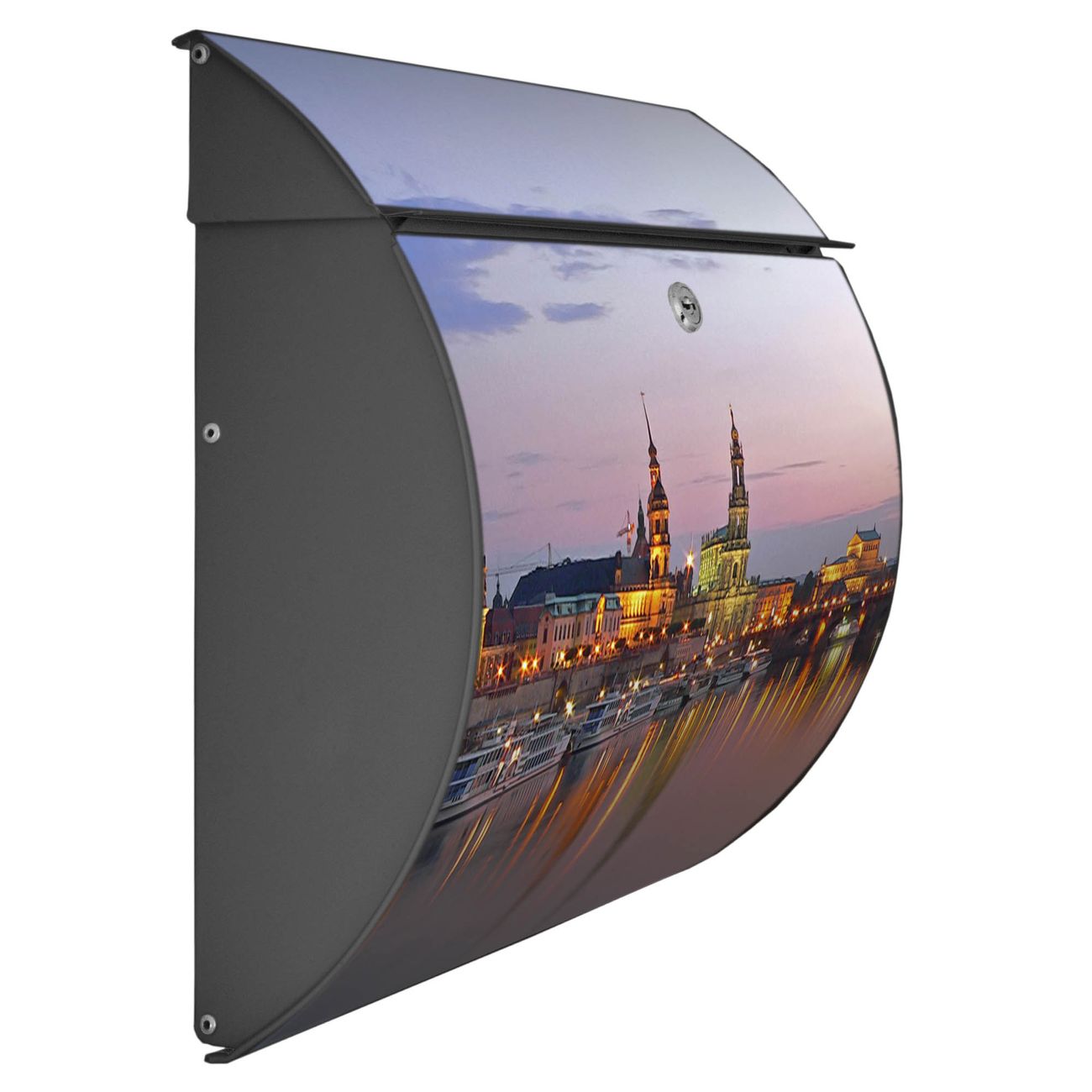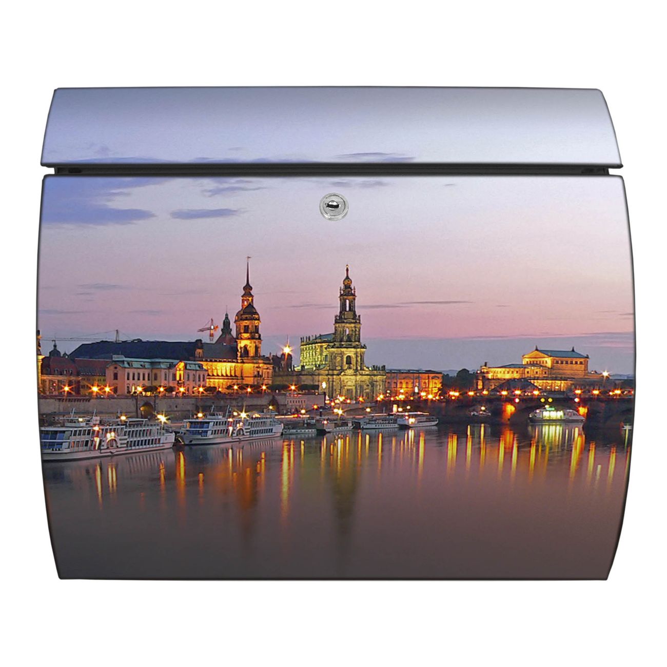 FUNKTION: DESIGN: Das Burg Wächter Modell Toscana mit Motiv Dresden hat ein sehr ansprechendes und zeitloses Design und ist besonderes wetterfest. Heben Sie Sich von der tristen grauen Masse ab, ohne auf Funktionalität zu verzichten. Wir bieten Ihnen ebenfalls Namensschilder, bereits beschriftet oder frei zu beschriften, und verschiedene selbst gestaltete Bitte-Keine-Werbung-Aufkleber. DETAILS: Der Postkasten besteht aus vollflächig verzinktem Stahl welcher in Anthrazit oder Weiß lackiert wurde oder aus Edelstahl (je nach gewählter Variante). Das Motiv besteht aus einer wetter- und UV-festen Folie, die mit einem Schutzlaminat überzogen ist, durch die Ihren Briefkasten zusätzlich vor Kratzern geschützt ist und auf den Briefkasten kaschiert wurde. Sie erhalten zu Ihrem neuen Design Briefkasten 2 Schlüssel sowie das passende Montagematerial. BANJADO: Ihr Briefkasten wird von Burg Wächter in Deutschland gefertigt und in unserer kleinen Manufaktur von Hand veredelt. Die Motivfolie ist lösungsmittelfrei und schutzlaminiert, dies sorgt für einen langen Halt. Wir legen großen Wert auf die Verbindung von Funktionalität und Design. Sie erhalten besondere Handarbeit aus Sachsen und Made in Germany.