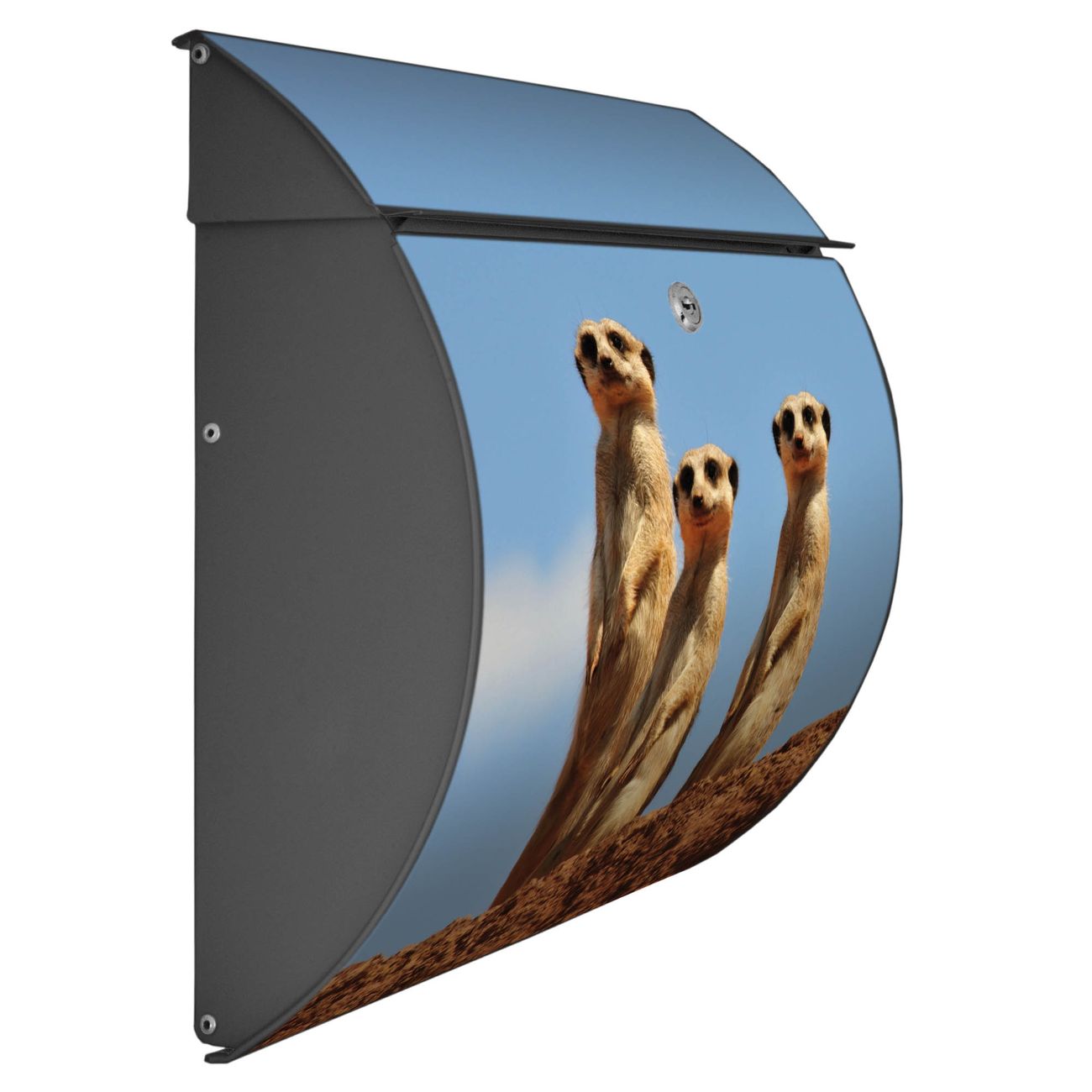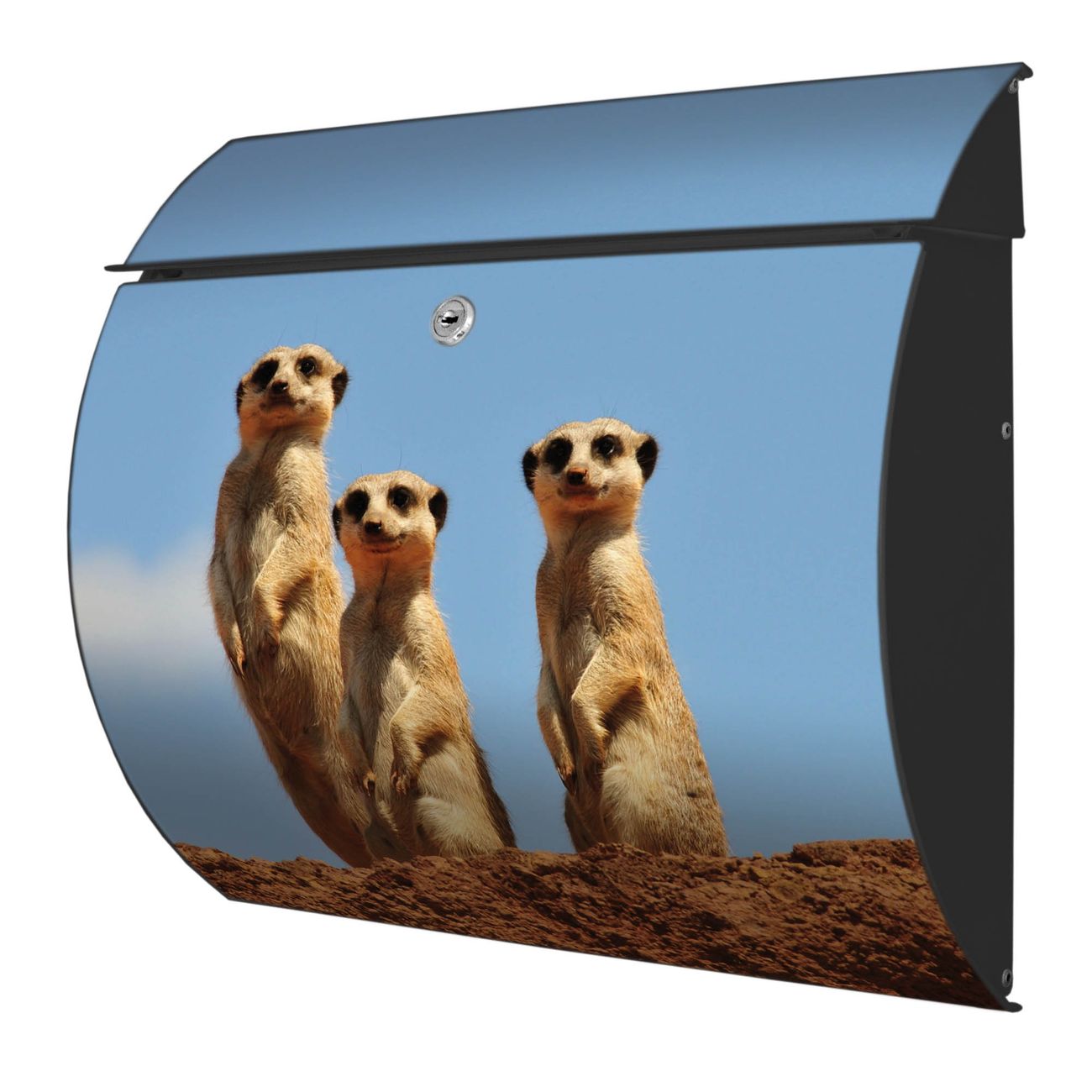 Der geschwungene Burg Wächter Briefkasten Toscana mit Motiv Erdmännchenfamilie bietet Ihnen mit seinem großen Fassungsvermögen genügend Platz auch für große A4 Sendungen. Auf Wunsch können Sie bei uns den passenden Standfuß bestellen und so aus dem Wandbriefkasten einen Standbriefkasten machen. Der integrierte Öffnungsstopp ermöglicht eine einfache Handhabung beim Entnehmen der Post.