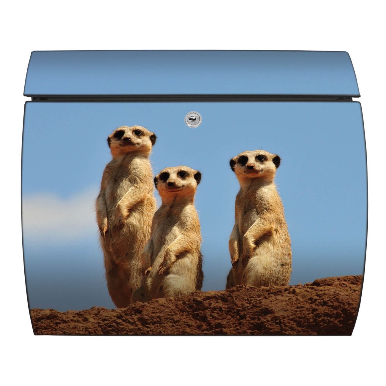 FUNKTION: DESIGN: Das Burg Wächter Modell Toscana mit Motiv Erdmännchenfamilie hat ein sehr ansprechendes und zeitloses Design und ist besonderes wetterfest. Heben Sie Sich von der tristen grauen Masse ab, ohne auf Funktionalität zu verzichten. Wir bieten Ihnen ebenfalls Namensschilder, bereits beschriftet oder frei zu beschriften, und verschiedene selbst gestaltete Bitte-Keine-Werbung-Aufkleber. DETAILS: Der Postkasten besteht aus vollflächig verzinktem Stahl welcher in Anthrazit oder Weiß lackiert wurde oder aus Edelstahl (je nach gewählter Variante). Das Motiv besteht aus einer wetter- und UV-festen Folie, die mit einem Schutzlaminat überzogen ist, durch die Ihren Briefkasten zusätzlich vor Kratzern geschützt ist und auf den Briefkasten kaschiert wurde. Sie erhalten zu Ihrem neuen Design Briefkasten 2 Schlüssel sowie das passende Montagematerial. BANJADO: Ihr Briefkasten wird von Burg Wächter in Deutschland gefertigt und in unserer kleinen Manufaktur von Hand veredelt. Die Motivfolie ist lösungsmittelfrei und schutzlaminiert, dies sorgt für einen langen Halt. Wir legen großen Wert auf die Verbindung von Funktionalität und Design. Sie erhalten besondere Handarbeit aus Sachsen und Made in Germany.