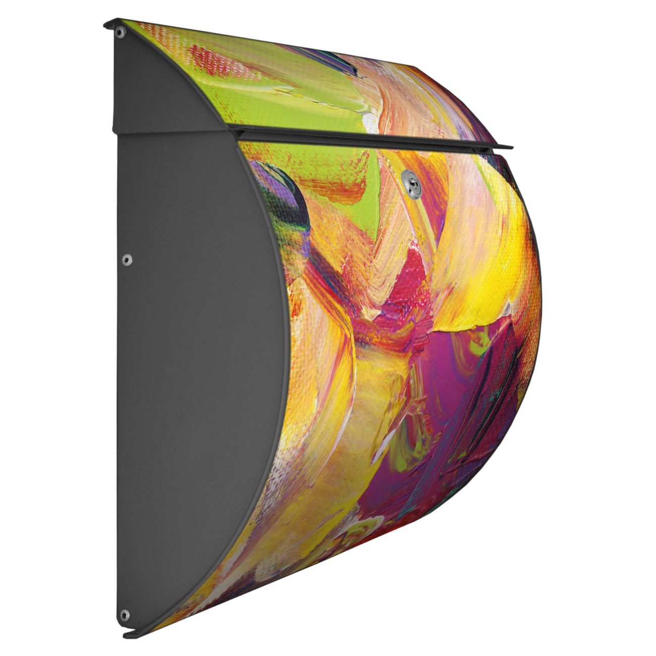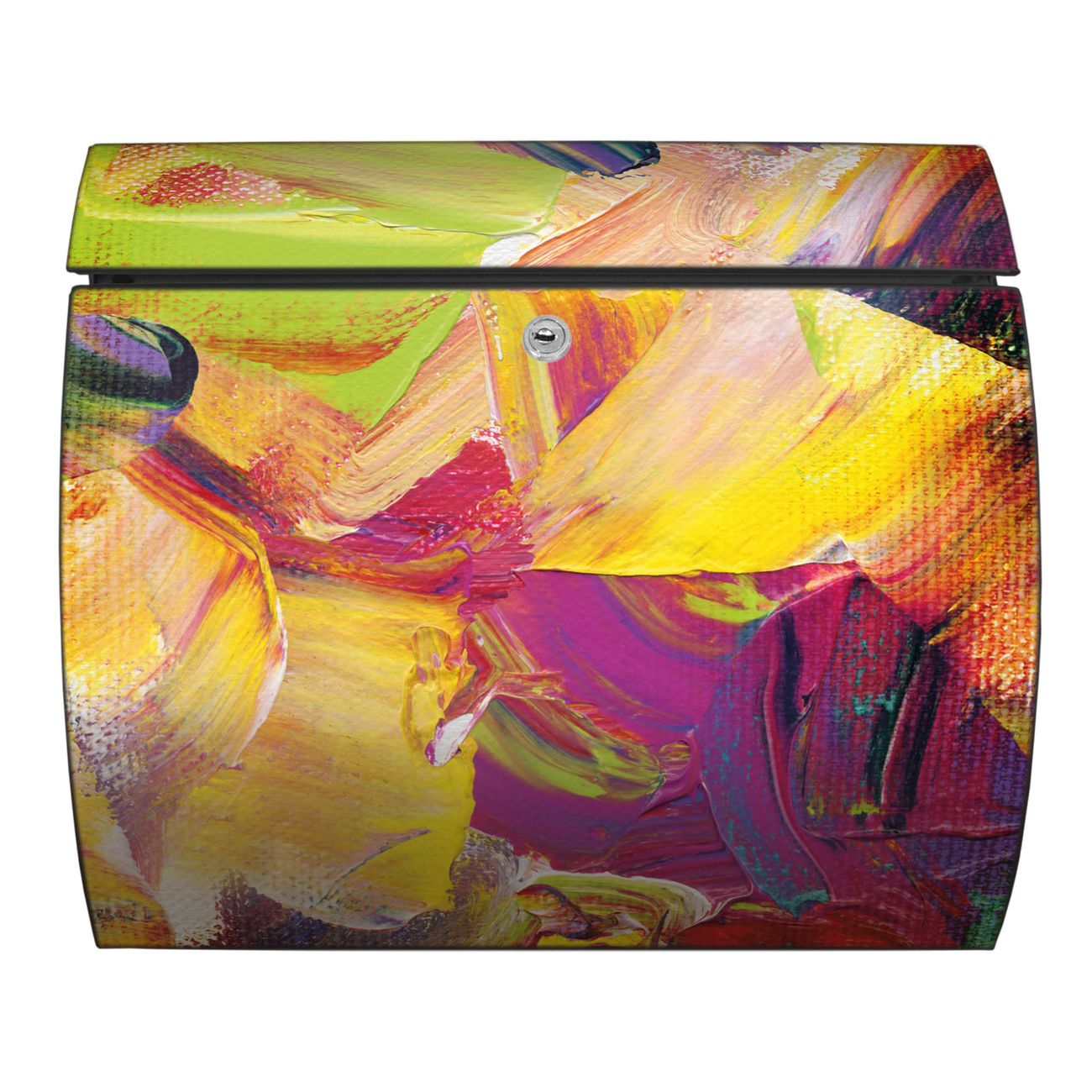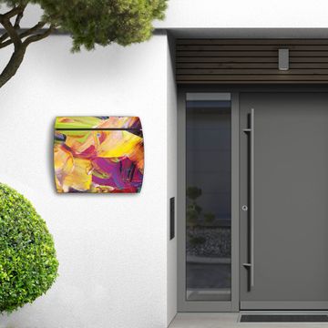 Der geschwungene Burg Wächter Briefkasten Toscana mit Motiv Farbe auf Leinwand bietet Ihnen mit seinem großen Fassungsvermögen genügend Platz auch für große A4 Sendungen. Auf Wunsch können Sie bei uns den passenden Standfuß bestellen und so aus dem Wandbriefkasten einen Standbriefkasten machen. Der integrierte Öffnungsstopp ermöglicht eine einfache Handhabung beim Entnehmen der Post.