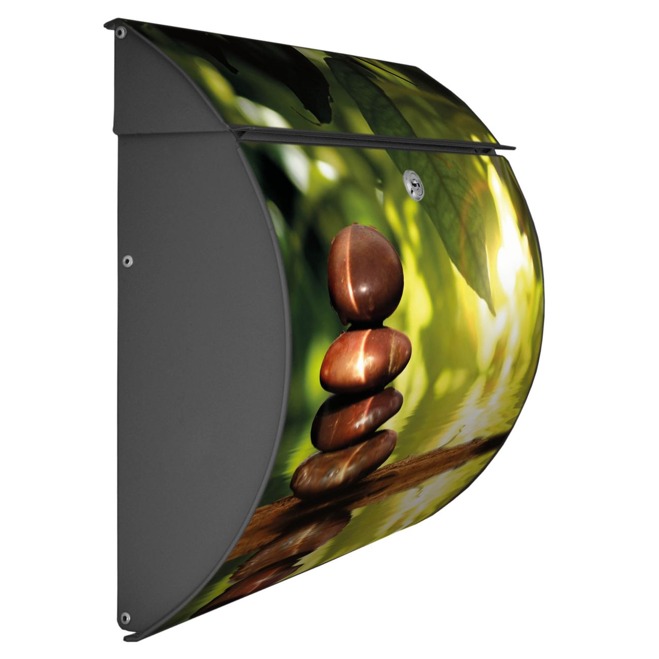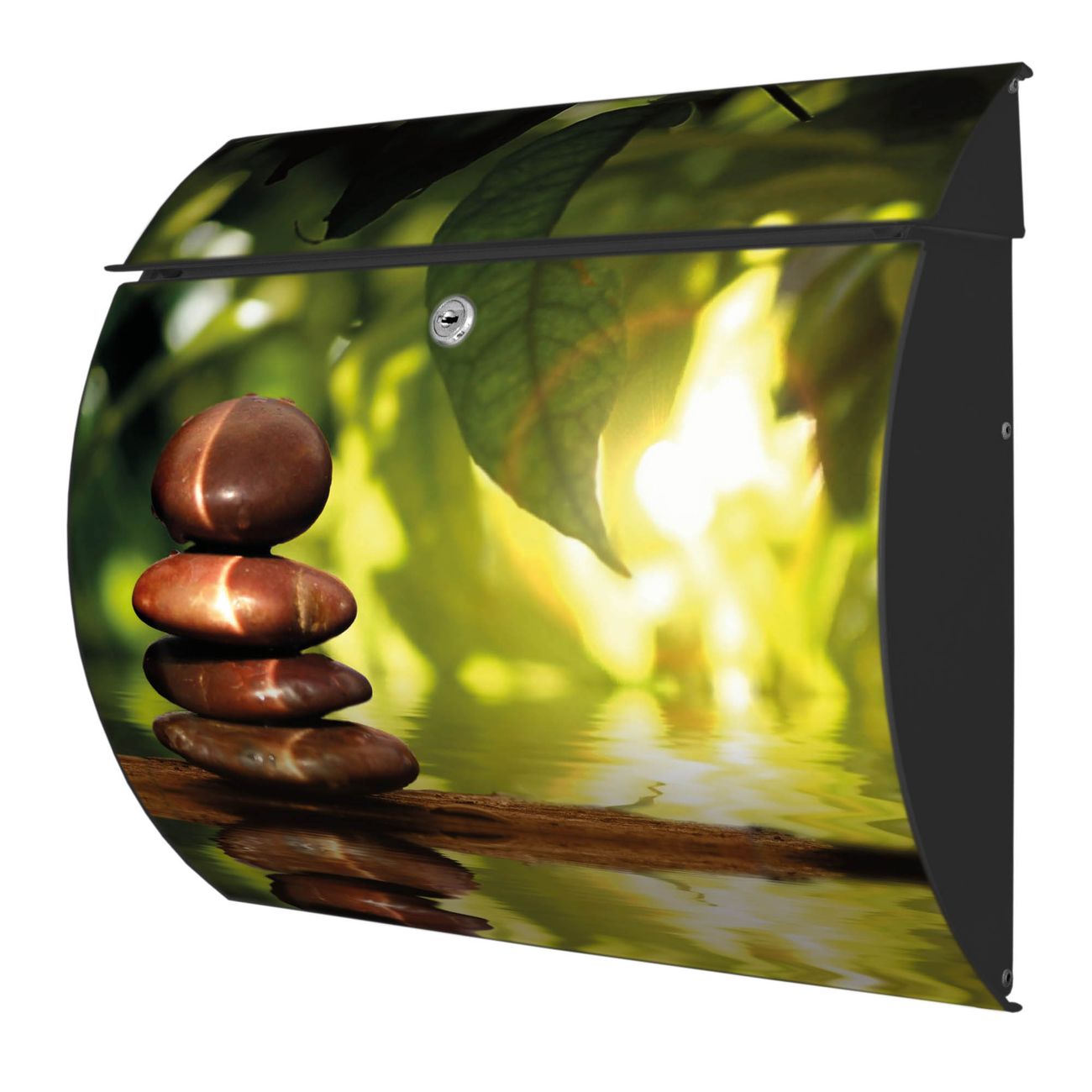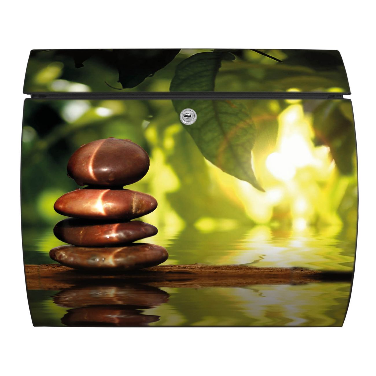 FUNKTION: DESIGN: Das Burg Wächter Modell Toscana mit Motiv Feng Shui hat ein sehr ansprechendes und zeitloses Design und ist besonderes wetterfest. Heben Sie Sich von der tristen grauen Masse ab, ohne auf Funktionalität zu verzichten. Wir bieten Ihnen ebenfalls Namensschilder, bereits beschriftet oder frei zu beschriften, und verschiedene selbst gestaltete Bitte-Keine-Werbung-Aufkleber. DETAILS: Der Postkasten besteht aus vollflächig verzinktem Stahl welcher in Anthrazit oder Weiß lackiert wurde oder aus Edelstahl (je nach gewählter Variante). Das Motiv besteht aus einer wetter- und UV-festen Folie, die mit einem Schutzlaminat überzogen ist, durch die Ihren Briefkasten zusätzlich vor Kratzern geschützt ist und auf den Briefkasten kaschiert wurde. Sie erhalten zu Ihrem neuen Design Briefkasten 2 Schlüssel sowie das passende Montagematerial. BANJADO: Ihr Briefkasten wird von Burg Wächter in Deutschland gefertigt und in unserer kleinen Manufaktur von Hand veredelt. Die Motivfolie ist lösungsmittelfrei und schutzlaminiert, dies sorgt für einen langen Halt. Wir legen großen Wert auf die Verbindung von Funktionalität und Design. Sie erhalten besondere Handarbeit aus Sachsen und Made in Germany.