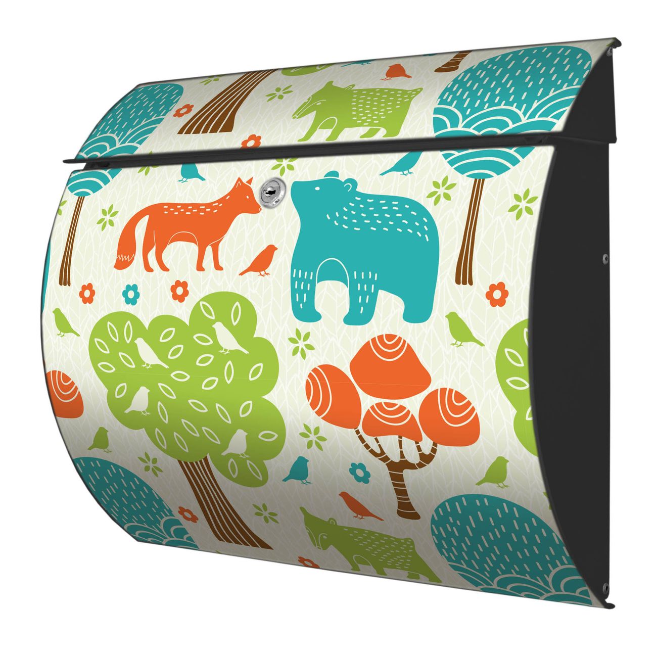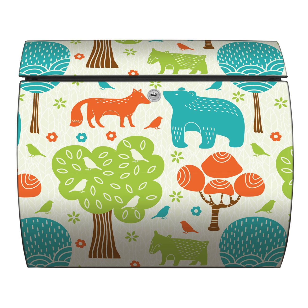 FUNKTION: DESIGN: Das Burg Wächter Modell Toscana mit Motiv Fuchs Bär Wald hat ein sehr ansprechendes und zeitloses Design und ist besonderes wetterfest. Heben Sie Sich von der tristen grauen Masse ab, ohne auf Funktionalität zu verzichten. Wir bieten Ihnen ebenfalls Namensschilder, bereits beschriftet oder frei zu beschriften, und verschiedene selbst gestaltete Bitte-Keine-Werbung-Aufkleber. DETAILS: Der Postkasten besteht aus vollflächig verzinktem Stahl welcher in Anthrazit oder Weiß lackiert wurde oder aus Edelstahl (je nach gewählter Variante). Das Motiv besteht aus einer wetter- und UV-festen Folie, die mit einem Schutzlaminat überzogen ist, durch die Ihren Briefkasten zusätzlich vor Kratzern geschützt ist und auf den Briefkasten kaschiert wurde. Sie erhalten zu Ihrem neuen Design Briefkasten 2 Schlüssel sowie das passende Montagematerial. BANJADO: Ihr Briefkasten wird von Burg Wächter in Deutschland gefertigt und in unserer kleinen Manufaktur von Hand veredelt. Die Motivfolie ist lösungsmittelfrei und schutzlaminiert, dies sorgt für einen langen Halt. Wir legen großen Wert auf die Verbindung von Funktionalität und Design. Sie erhalten besondere Handarbeit aus Sachsen und Made in Germany.