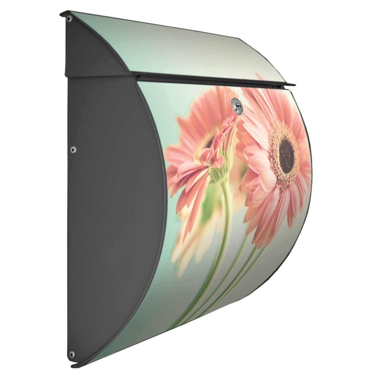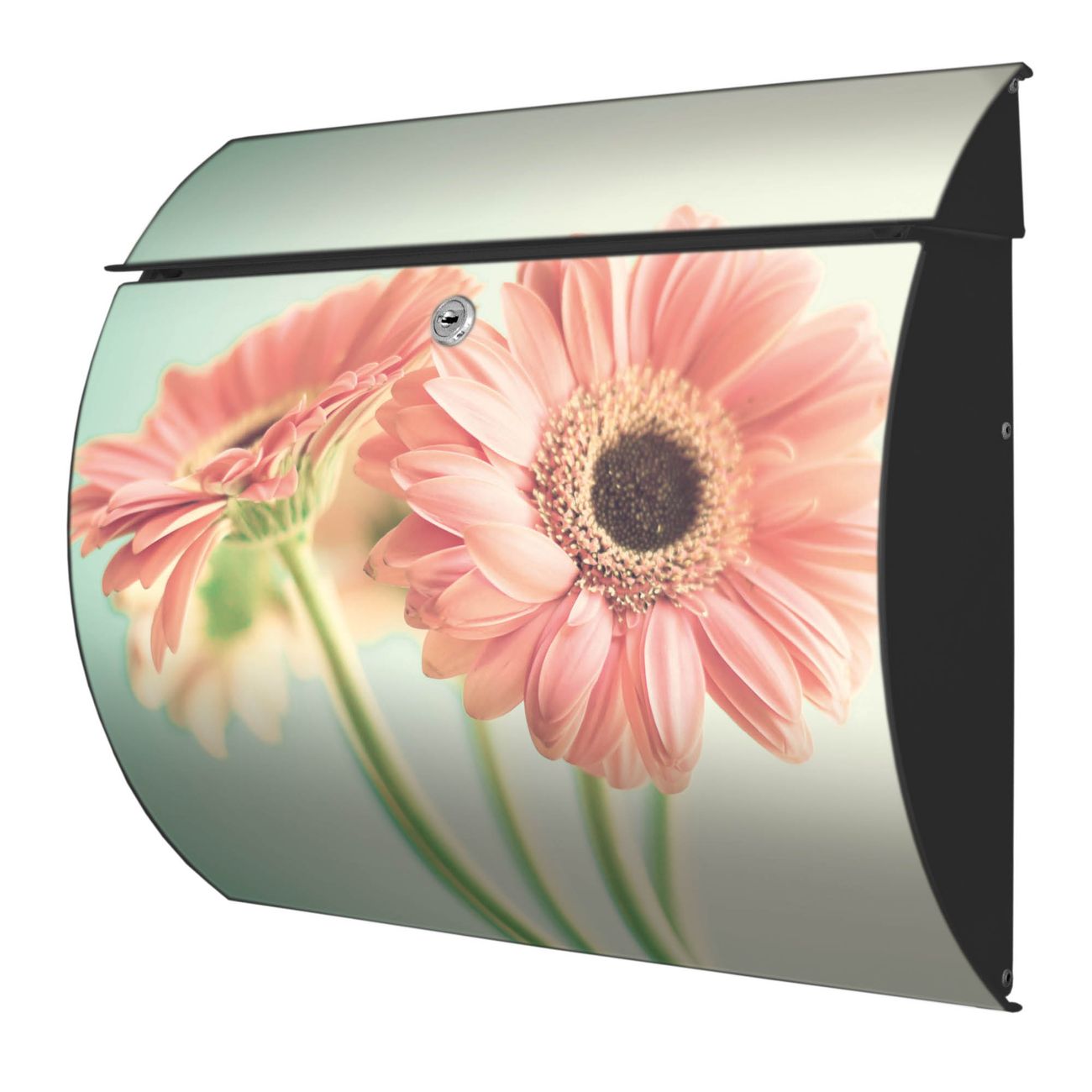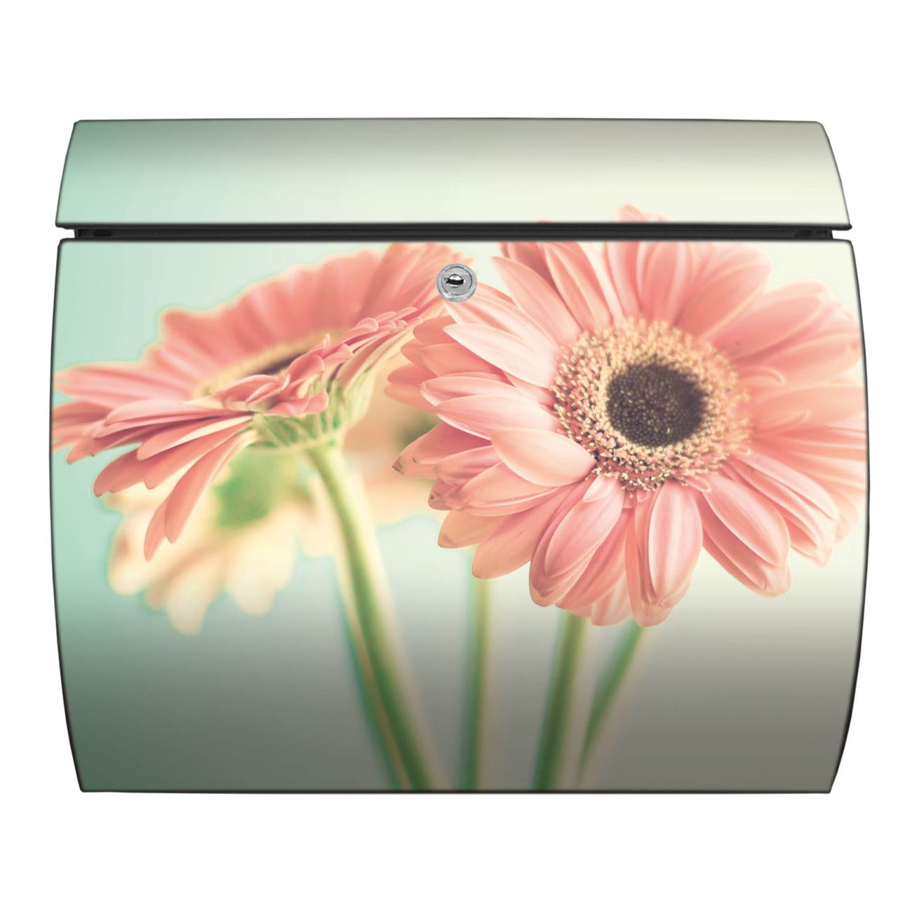 Der geschwungene Burg Wächter Briefkasten Toscana mit Motiv Fünf Gerbera bietet Ihnen mit seinem großen Fassungsvermögen genügend Platz auch für große A4 Sendungen. Auf Wunsch können Sie bei uns den passenden Standfuß bestellen und so aus dem Wandbriefkasten einen Standbriefkasten machen. Der integrierte Öffnungsstopp ermöglicht eine einfache Handhabung beim Entnehmen der Post.