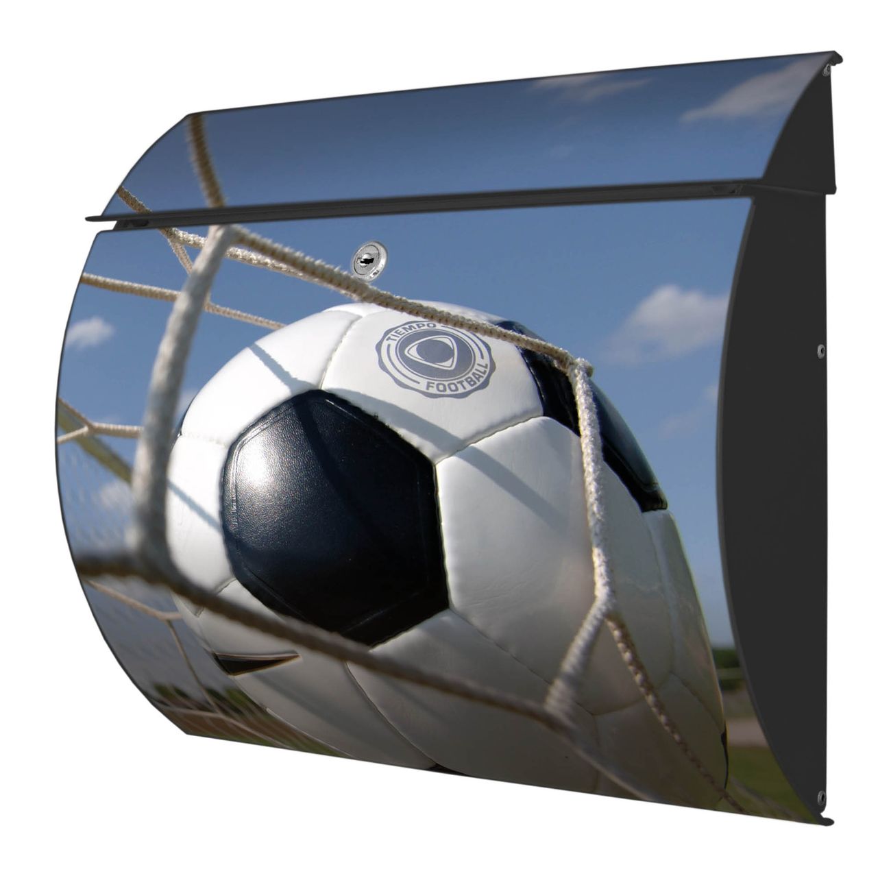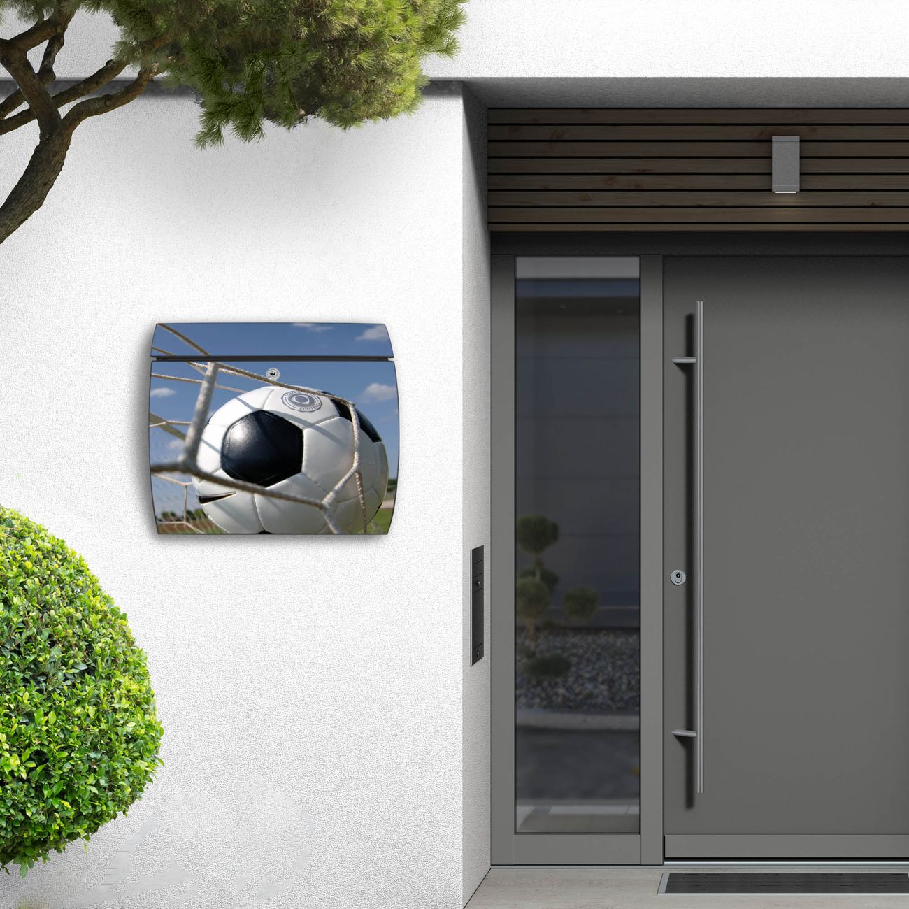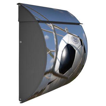 Der geschwungene Burg Wächter Briefkasten Toscana mit Motiv Fußball bietet Ihnen mit seinem großen Fassungsvermögen genügend Platz auch für große A4 Sendungen. Auf Wunsch können Sie bei uns den passenden Standfuß bestellen und so aus dem Wandbriefkasten einen Standbriefkasten machen. Der integrierte Öffnungsstopp ermöglicht eine einfache Handhabung beim Entnehmen der Post.
