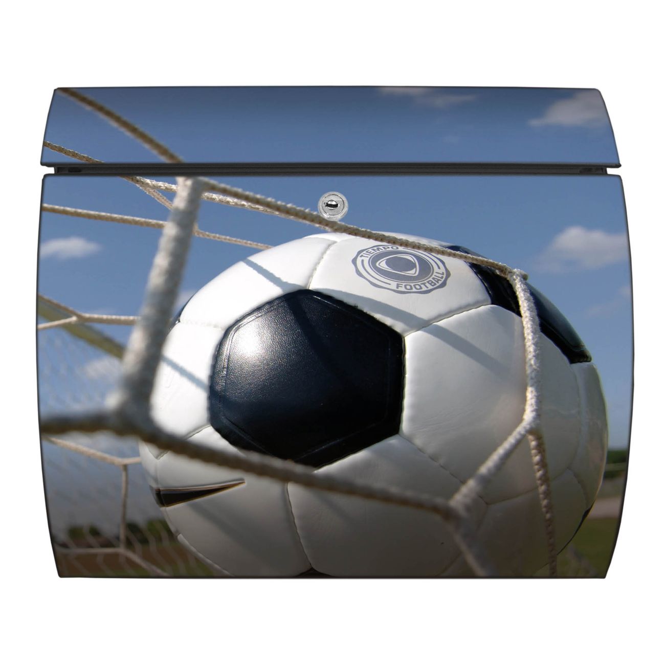 FUNKTION: DESIGN: Das Burg Wächter Modell Toscana mit Motiv Fußball hat ein sehr ansprechendes und zeitloses Design und ist besonderes wetterfest. Heben Sie Sich von der tristen grauen Masse ab, ohne auf Funktionalität zu verzichten. Wir bieten Ihnen ebenfalls Namensschilder, bereits beschriftet oder frei zu beschriften, und verschiedene selbst gestaltete Bitte-Keine-Werbung-Aufkleber. DETAILS: Der Postkasten besteht aus vollflächig verzinktem Stahl welcher in Anthrazit oder Weiß lackiert wurde oder aus Edelstahl (je nach gewählter Variante). Das Motiv besteht aus einer wetter- und UV-festen Folie, die mit einem Schutzlaminat überzogen ist, durch die Ihren Briefkasten zusätzlich vor Kratzern geschützt ist und auf den Briefkasten kaschiert wurde. Sie erhalten zu Ihrem neuen Design Briefkasten 2 Schlüssel sowie das passende Montagematerial. BANJADO: Ihr Briefkasten wird von Burg Wächter in Deutschland gefertigt und in unserer kleinen Manufaktur von Hand veredelt. Die Motivfolie ist lösungsmittelfrei und schutzlaminiert, dies sorgt für einen langen Halt. Wir legen großen Wert auf die Verbindung von Funktionalität und Design. Sie erhalten besondere Handarbeit aus Sachsen und Made in Germany.