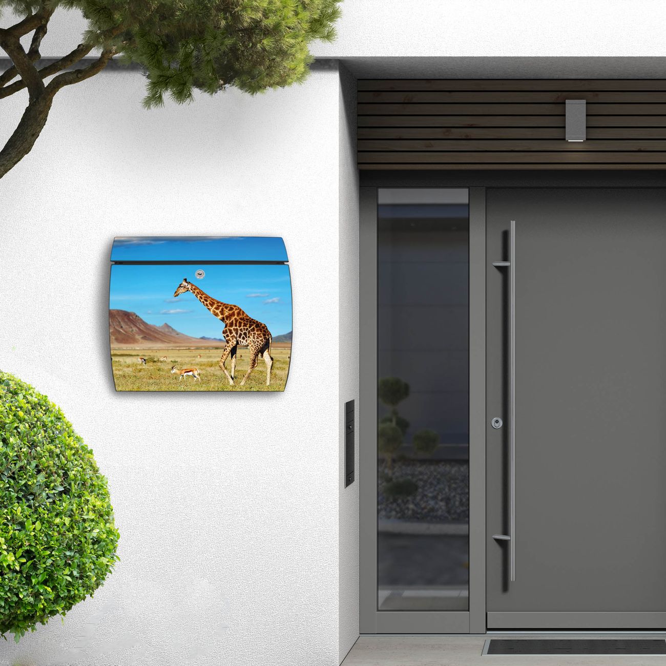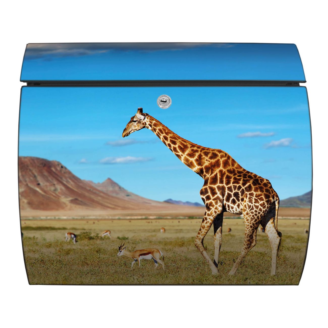 FUNKTION: DESIGN: Das Burg Wächter Modell Toscana mit Motiv Giraffe hat ein sehr ansprechendes und zeitloses Design und ist besonderes wetterfest. Heben Sie Sich von der tristen grauen Masse ab, ohne auf Funktionalität zu verzichten. Wir bieten Ihnen ebenfalls Namensschilder, bereits beschriftet oder frei zu beschriften, und verschiedene selbst gestaltete Bitte-Keine-Werbung-Aufkleber. DETAILS: Der Postkasten besteht aus vollflächig verzinktem Stahl welcher in Anthrazit oder Weiß lackiert wurde oder aus Edelstahl (je nach gewählter Variante). Das Motiv besteht aus einer wetter- und UV-festen Folie, die mit einem Schutzlaminat überzogen ist, durch die Ihren Briefkasten zusätzlich vor Kratzern geschützt ist und auf den Briefkasten kaschiert wurde. Sie erhalten zu Ihrem neuen Design Briefkasten 2 Schlüssel sowie das passende Montagematerial. BANJADO: Ihr Briefkasten wird von Burg Wächter in Deutschland gefertigt und in unserer kleinen Manufaktur von Hand veredelt. Die Motivfolie ist lösungsmittelfrei und schutzlaminiert, dies sorgt für einen langen Halt. Wir legen großen Wert auf die Verbindung von Funktionalität und Design. Sie erhalten besondere Handarbeit aus Sachsen und Made in Germany.