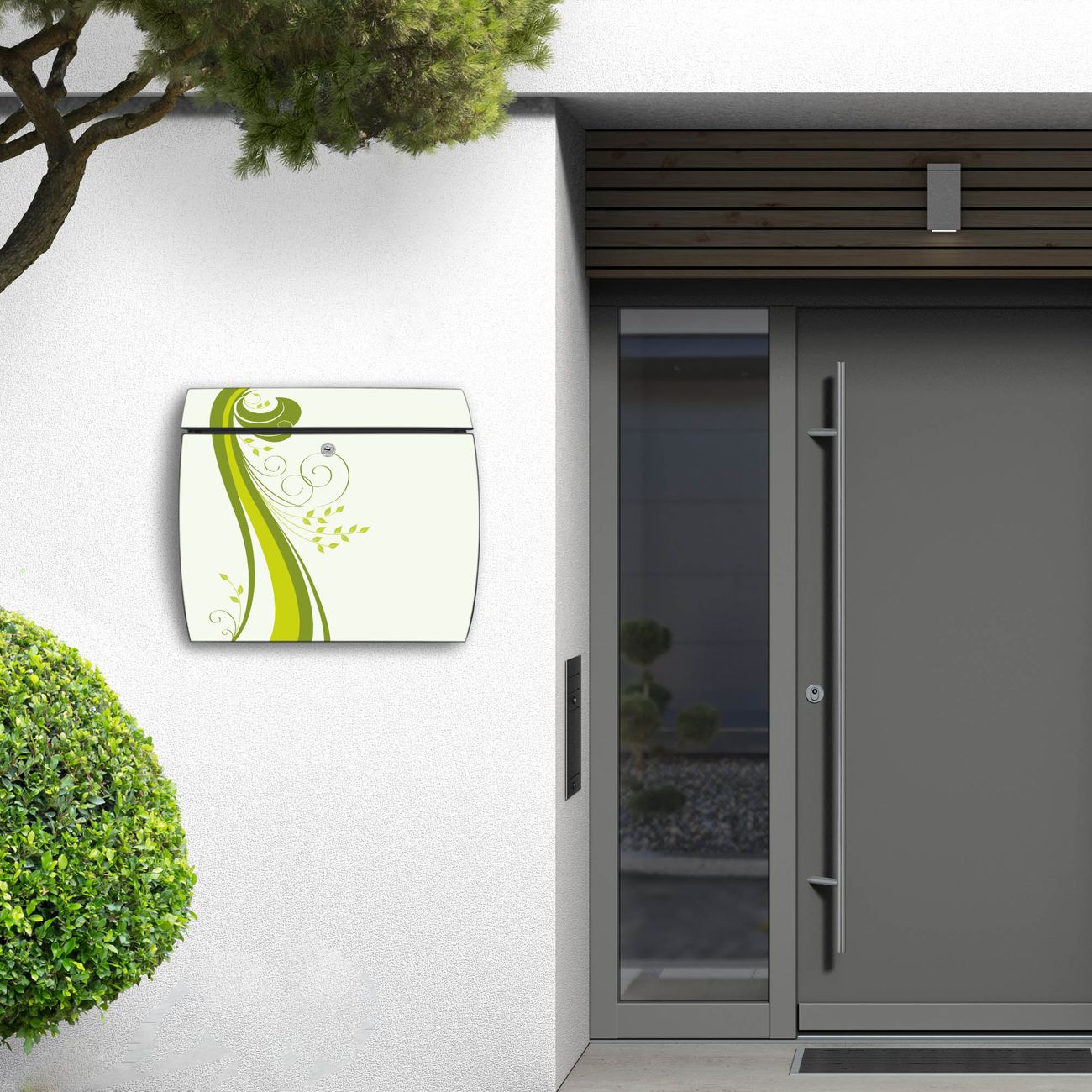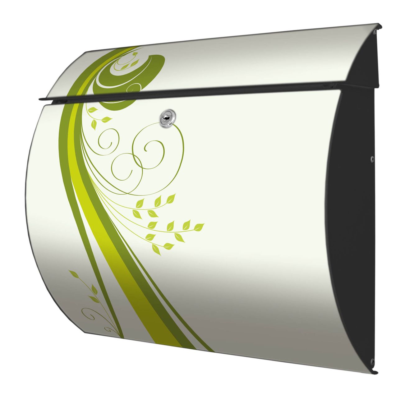 Der geschwungene Burg Wächter Briefkasten Toscana mit Motiv Green Swirl bietet Ihnen mit seinem großen Fassungsvermögen genügend Platz auch für große A4 Sendungen. Auf Wunsch können Sie bei uns den passenden Standfuß bestellen und so aus dem Wandbriefkasten einen Standbriefkasten machen. Der integrierte Öffnungsstopp ermöglicht eine einfache Handhabung beim Entnehmen der Post.
