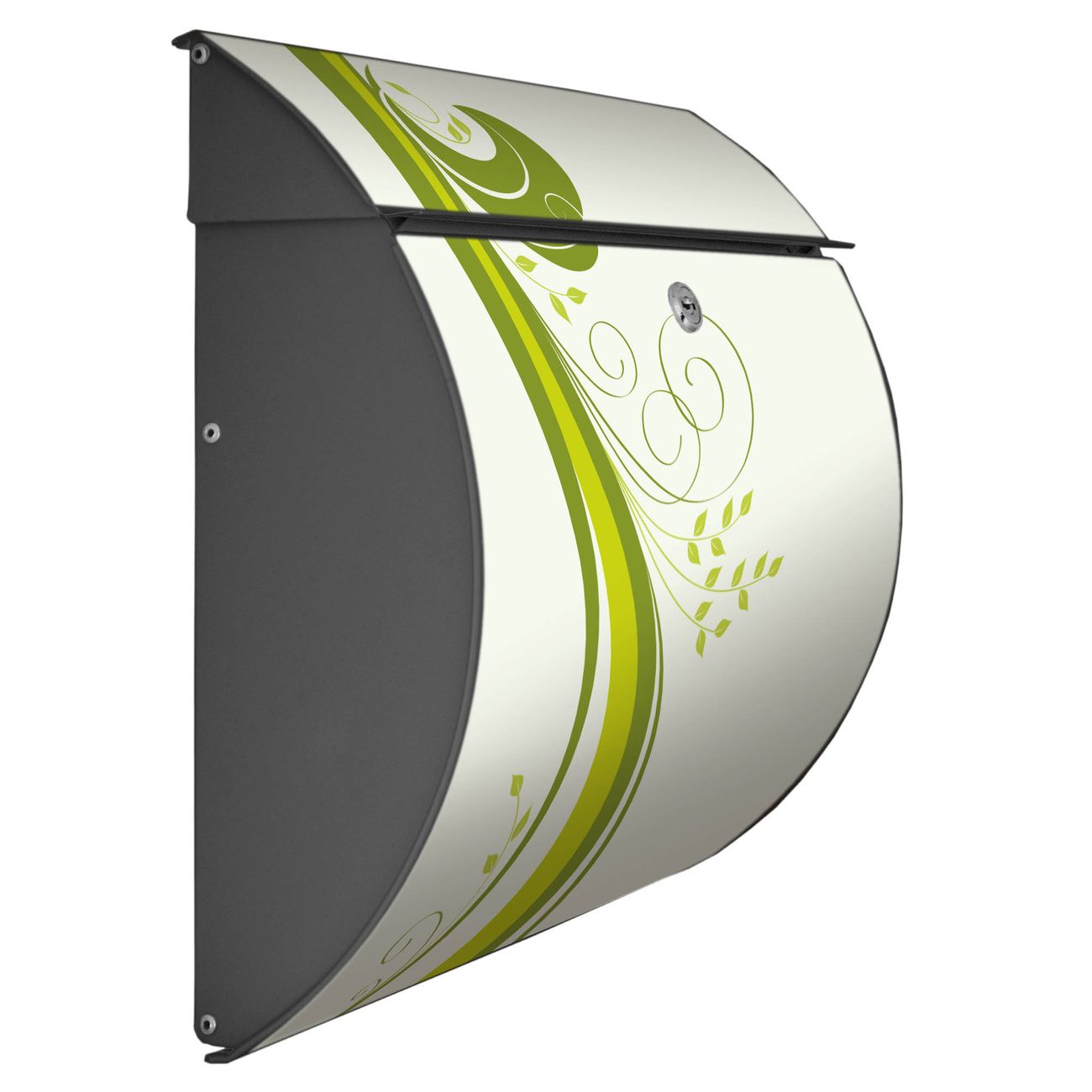 FUNKTION: DESIGN: Das Burg Wächter Modell Toscana mit Motiv Green Swirl hat ein sehr ansprechendes und zeitloses Design und ist besonderes wetterfest. Heben Sie Sich von der tristen grauen Masse ab, ohne auf Funktionalität zu verzichten. Wir bieten Ihnen ebenfalls Namensschilder, bereits beschriftet oder frei zu beschriften, und verschiedene selbst gestaltete Bitte-Keine-Werbung-Aufkleber. DETAILS: Der Postkasten besteht aus vollflächig verzinktem Stahl welcher in Anthrazit oder Weiß lackiert wurde oder aus Edelstahl (je nach gewählter Variante). Das Motiv besteht aus einer wetter- und UV-festen Folie, die mit einem Schutzlaminat überzogen ist, durch die Ihren Briefkasten zusätzlich vor Kratzern geschützt ist und auf den Briefkasten kaschiert wurde. Sie erhalten zu Ihrem neuen Design Briefkasten 2 Schlüssel sowie das passende Montagematerial. BANJADO: Ihr Briefkasten wird von Burg Wächter in Deutschland gefertigt und in unserer kleinen Manufaktur von Hand veredelt. Die Motivfolie ist lösungsmittelfrei und schutzlaminiert, dies sorgt für einen langen Halt. Wir legen großen Wert auf die Verbindung von Funktionalität und Design. Sie erhalten besondere Handarbeit aus Sachsen und Made in Germany.