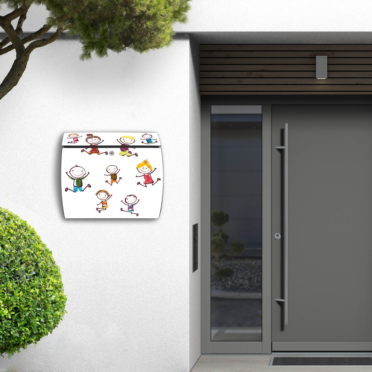 Der geschwungene Burg Wächter Briefkasten Toscana mit Motiv Happy Kids bietet Ihnen mit seinem großen Fassungsvermögen genügend Platz auch für große A4 Sendungen. Auf Wunsch können Sie bei uns den passenden Standfuß bestellen und so aus dem Wandbriefkasten einen Standbriefkasten machen. Der integrierte Öffnungsstopp ermöglicht eine einfache Handhabung beim Entnehmen der Post.