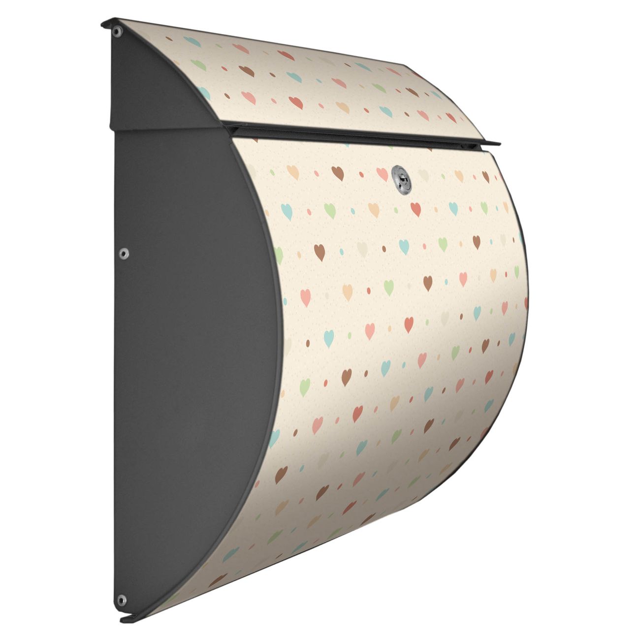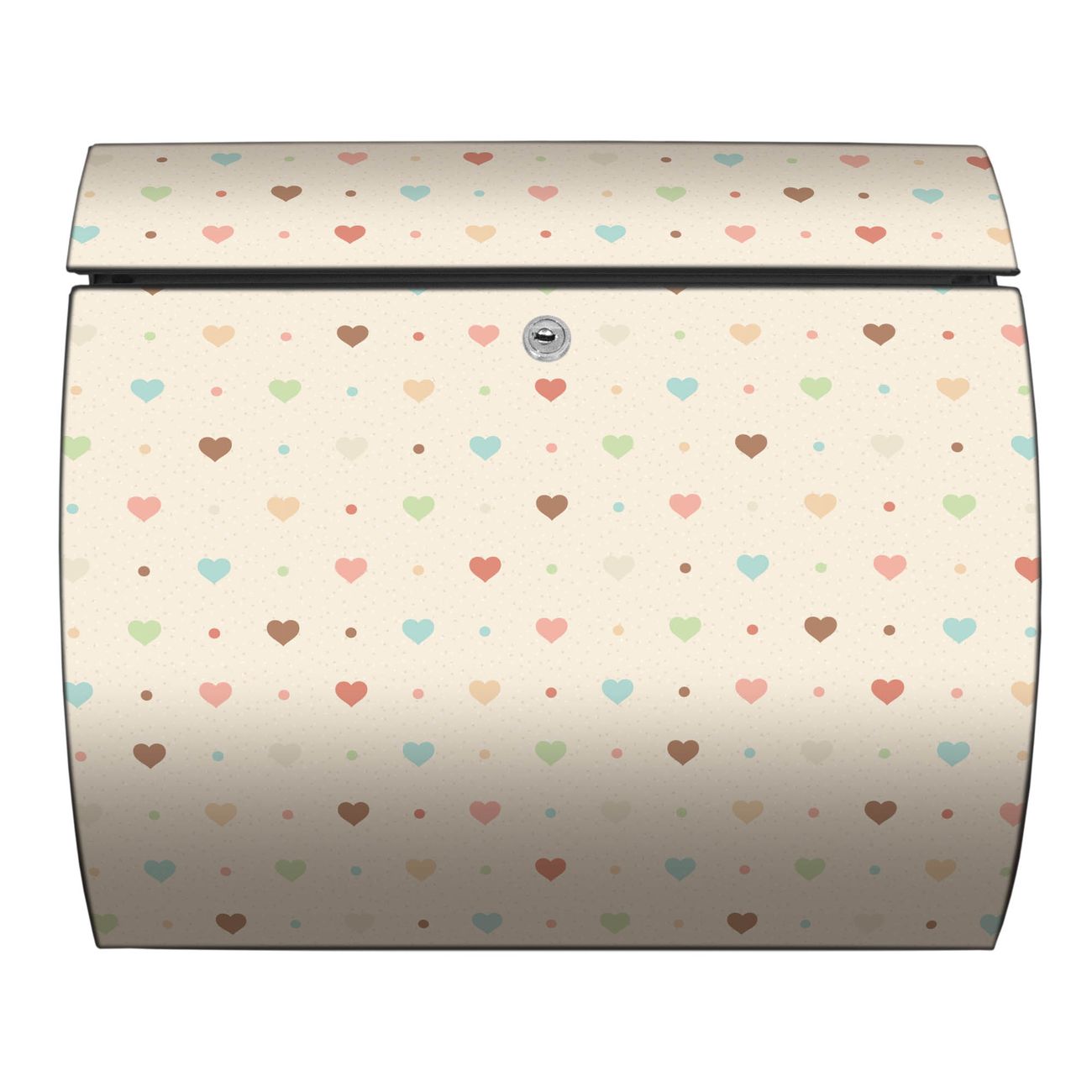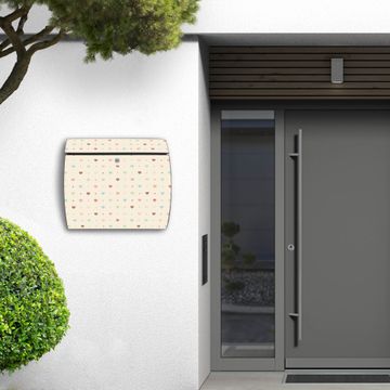 Der geschwungene Burg Wächter Briefkasten Toscana mit Motiv Herzen bunt bietet Ihnen mit seinem großen Fassungsvermögen genügend Platz auch für große A4 Sendungen. Auf Wunsch können Sie bei uns den passenden Standfuß bestellen und so aus dem Wandbriefkasten einen Standbriefkasten machen. Der integrierte Öffnungsstopp ermöglicht eine einfache Handhabung beim Entnehmen der Post.