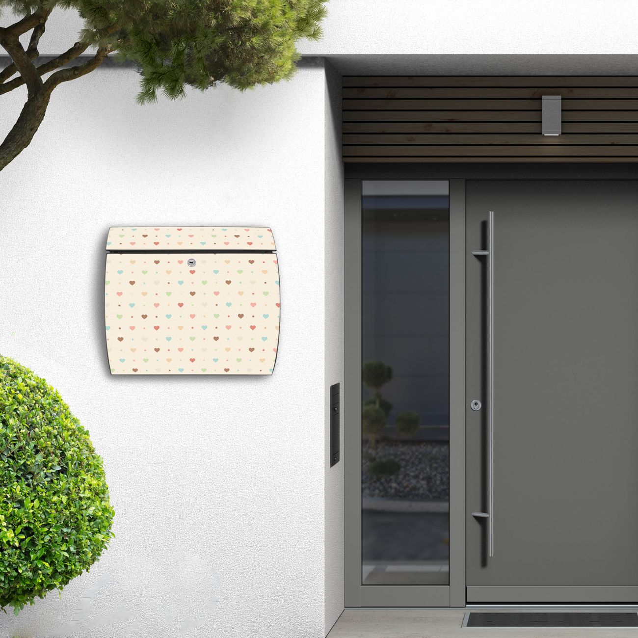 FUNKTION: DESIGN: Das Burg Wächter Modell Toscana mit Motiv Herzen bunt hat ein sehr ansprechendes und zeitloses Design und ist besonderes wetterfest. Heben Sie Sich von der tristen grauen Masse ab, ohne auf Funktionalität zu verzichten. Wir bieten Ihnen ebenfalls Namensschilder, bereits beschriftet oder frei zu beschriften, und verschiedene selbst gestaltete Bitte-Keine-Werbung-Aufkleber. DETAILS: Der Postkasten besteht aus vollflächig verzinktem Stahl welcher in Anthrazit oder Weiß lackiert wurde oder aus Edelstahl (je nach gewählter Variante). Das Motiv besteht aus einer wetter- und UV-festen Folie, die mit einem Schutzlaminat überzogen ist, durch die Ihren Briefkasten zusätzlich vor Kratzern geschützt ist und auf den Briefkasten kaschiert wurde. Sie erhalten zu Ihrem neuen Design Briefkasten 2 Schlüssel sowie das passende Montagematerial. BANJADO: Ihr Briefkasten wird von Burg Wächter in Deutschland gefertigt und in unserer kleinen Manufaktur von Hand veredelt. Die Motivfolie ist lösungsmittelfrei und schutzlaminiert, dies sorgt für einen langen Halt. Wir legen großen Wert auf die Verbindung von Funktionalität und Design. Sie erhalten besondere Handarbeit aus Sachsen und Made in Germany.