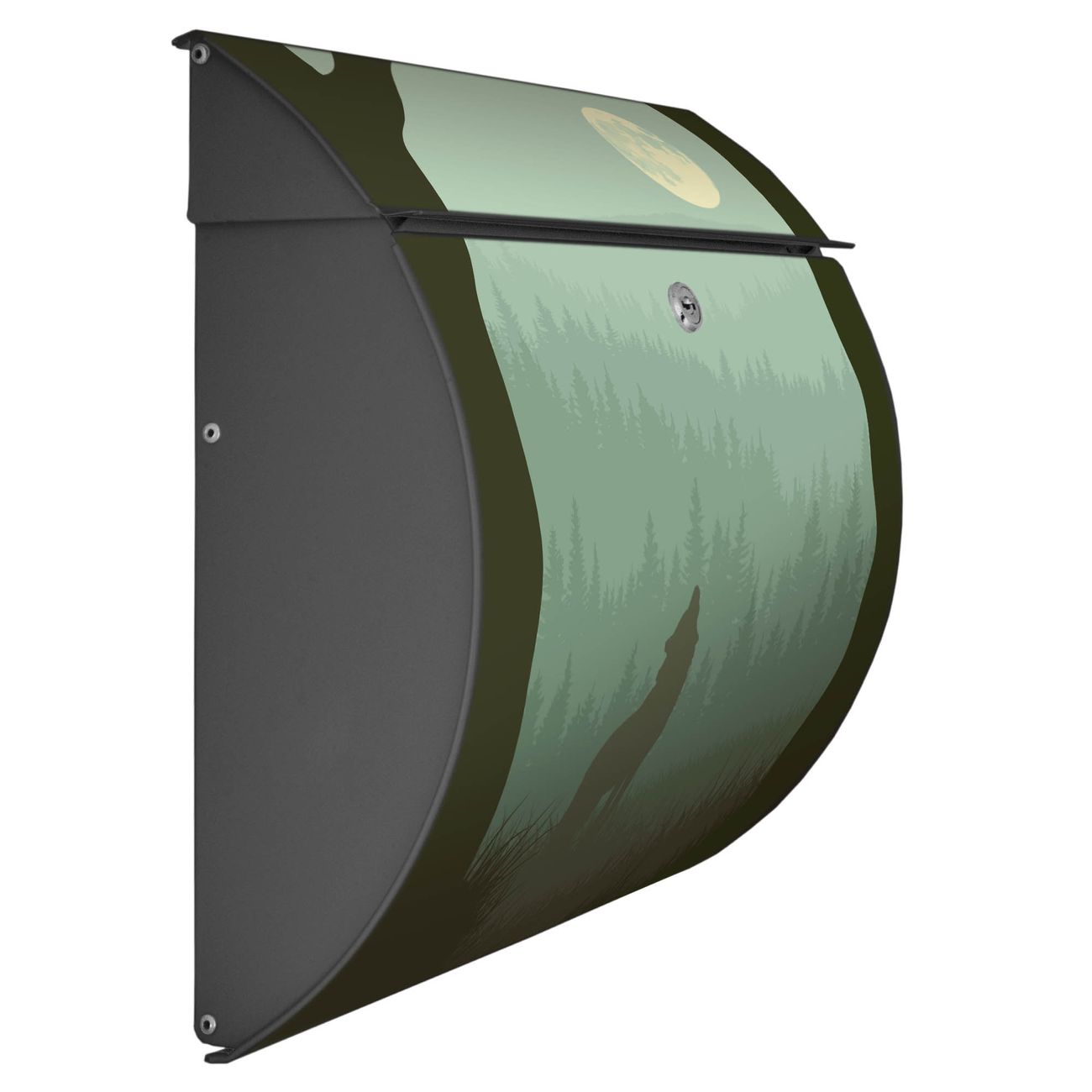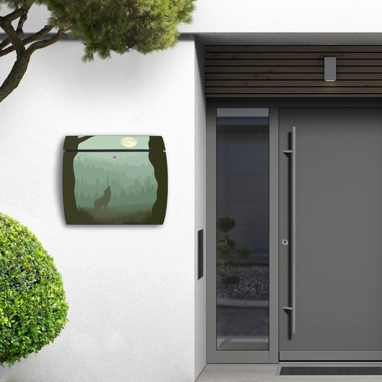 Der geschwungene Burg Wächter Briefkasten Toscana mit Motiv Heulender Wolf bietet Ihnen mit seinem großen Fassungsvermögen genügend Platz auch für große A4 Sendungen. Auf Wunsch können Sie bei uns den passenden Standfuß bestellen und so aus dem Wandbriefkasten einen Standbriefkasten machen. Der integrierte Öffnungsstopp ermöglicht eine einfache Handhabung beim Entnehmen der Post.