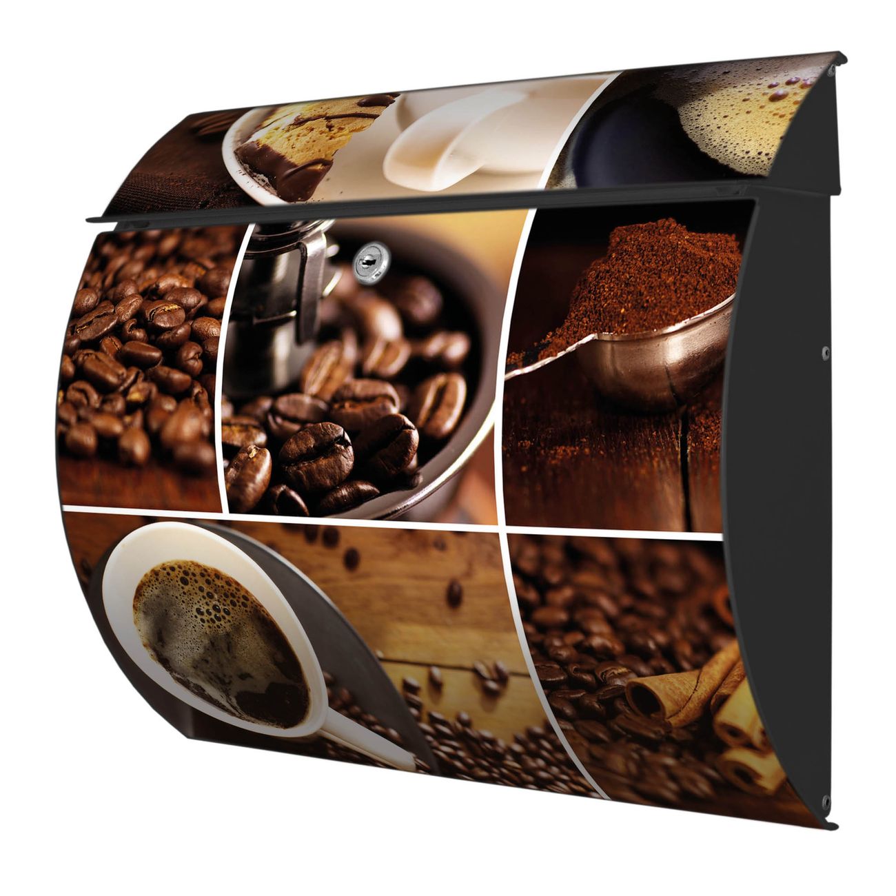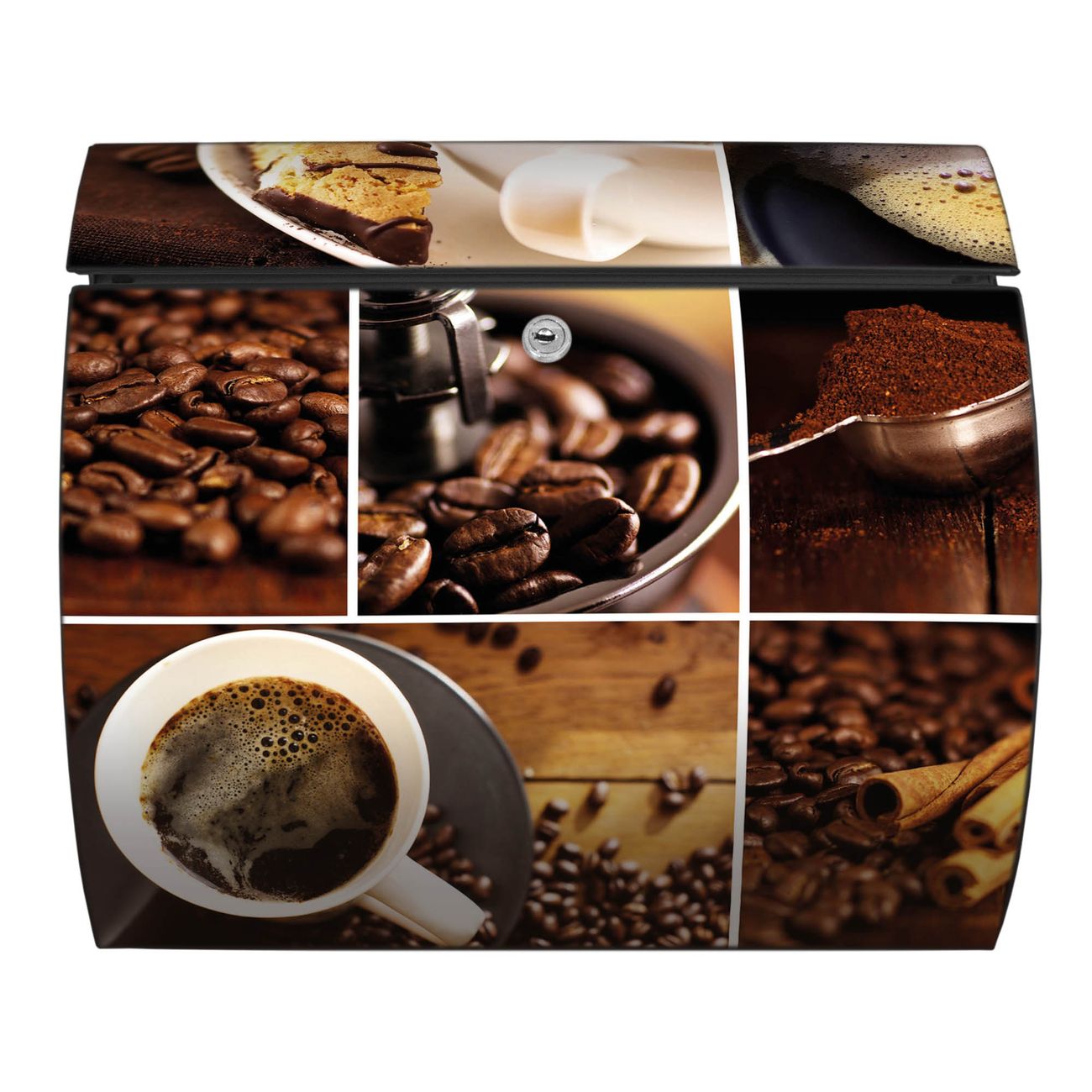 FUNKTION: DESIGN: Das Burg Wächter Modell Toscana mit Motiv Kaffee&Schokolade hat ein sehr ansprechendes und zeitloses Design und ist besonderes wetterfest. Heben Sie Sich von der tristen grauen Masse ab, ohne auf Funktionalität zu verzichten. Wir bieten Ihnen ebenfalls Namensschilder, bereits beschriftet oder frei zu beschriften, und verschiedene selbst gestaltete Bitte-Keine-Werbung-Aufkleber. DETAILS: Der Postkasten besteht aus vollflächig verzinktem Stahl welcher in Anthrazit oder Weiß lackiert wurde oder aus Edelstahl (je nach gewählter Variante). Das Motiv besteht aus einer wetter- und UV-festen Folie, die mit einem Schutzlaminat überzogen ist, durch die Ihren Briefkasten zusätzlich vor Kratzern geschützt ist und auf den Briefkasten kaschiert wurde. Sie erhalten zu Ihrem neuen Design Briefkasten 2 Schlüssel sowie das passende Montagematerial. BANJADO: Ihr Briefkasten wird von Burg Wächter in Deutschland gefertigt und in unserer kleinen Manufaktur von Hand veredelt. Die Motivfolie ist lösungsmittelfrei und schutzlaminiert, dies sorgt für einen langen Halt. Wir legen großen Wert auf die Verbindung von Funktionalität und Design. Sie erhalten besondere Handarbeit aus Sachsen und Made in Germany.