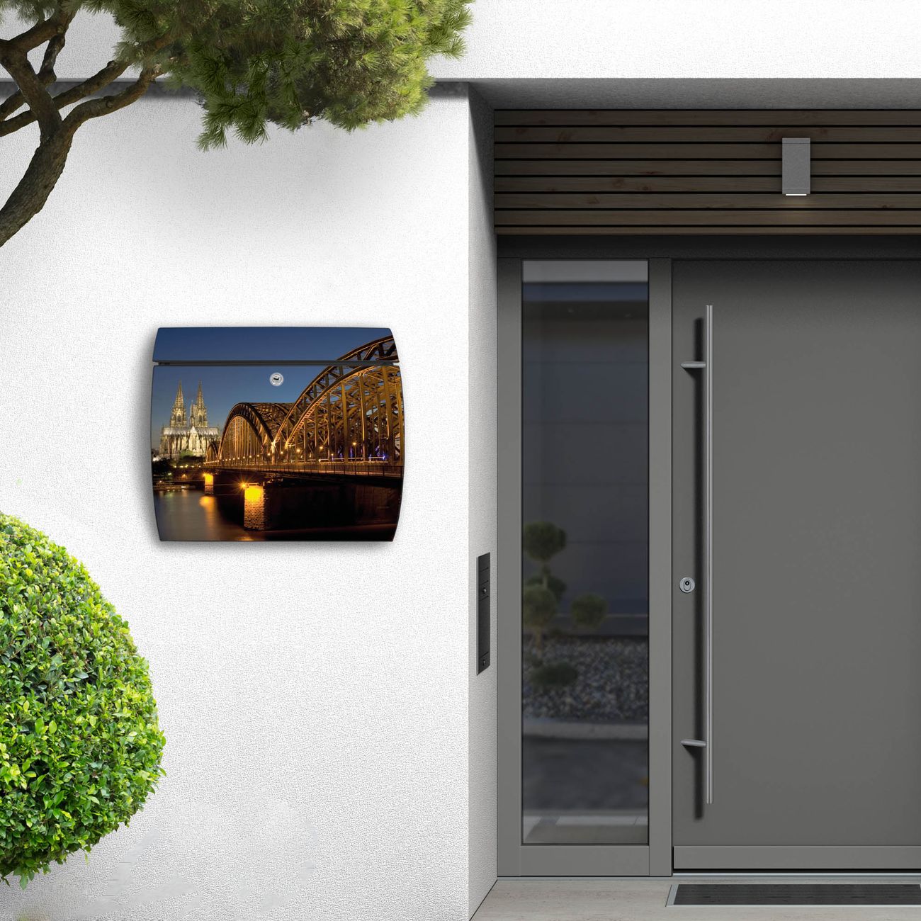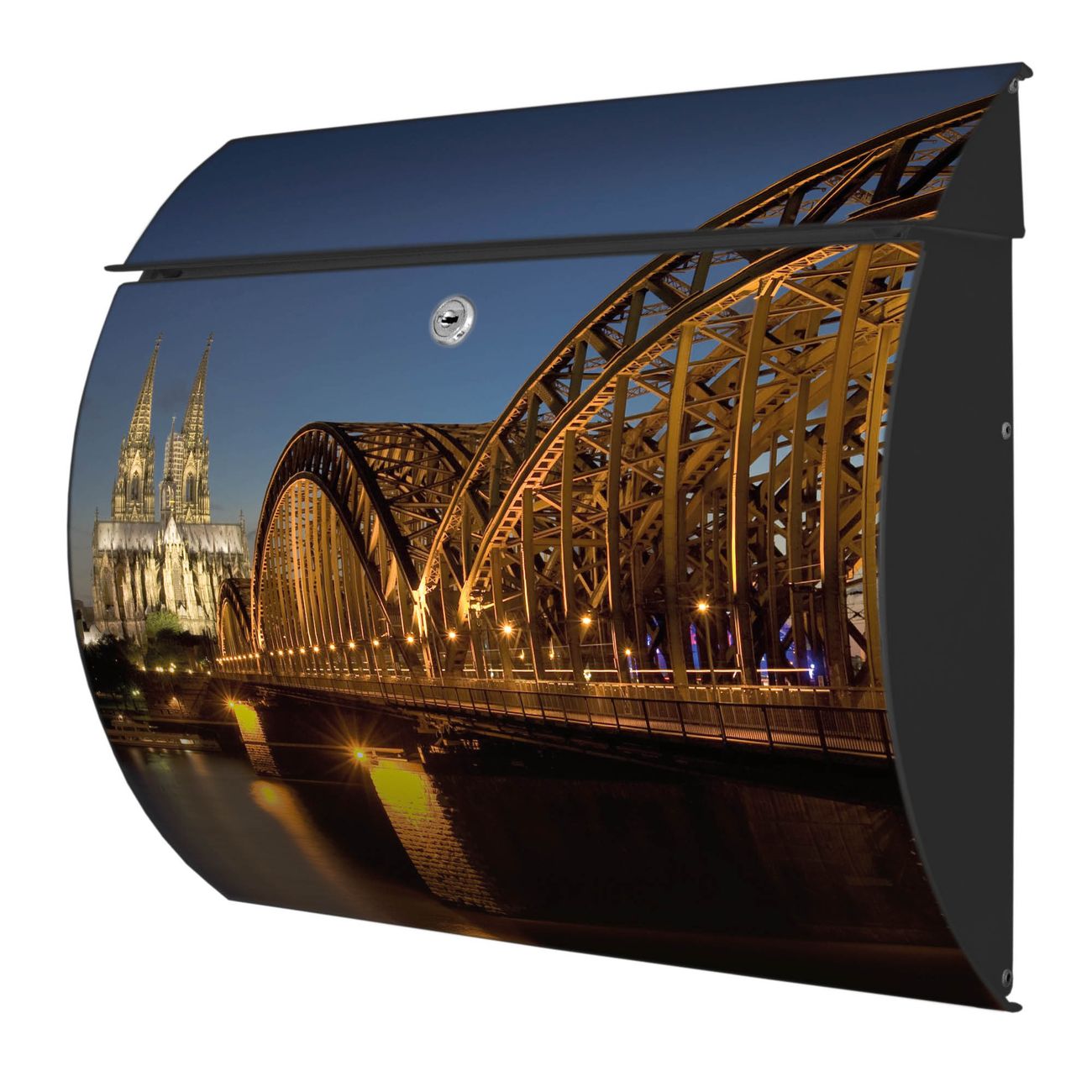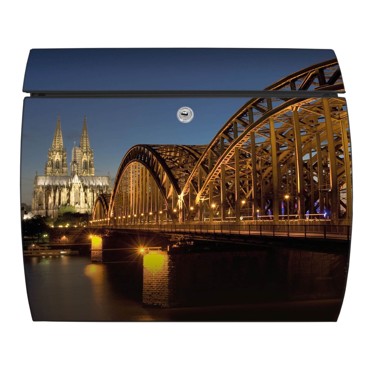 FUNKTION: DESIGN: Das Burg Wächter Modell Toscana mit Motiv Köln hat ein sehr ansprechendes und zeitloses Design und ist besonderes wetterfest. Heben Sie Sich von der tristen grauen Masse ab, ohne auf Funktionalität zu verzichten. Wir bieten Ihnen ebenfalls Namensschilder, bereits beschriftet oder frei zu beschriften, und verschiedene selbst gestaltete Bitte-Keine-Werbung-Aufkleber. DETAILS: Der Postkasten besteht aus vollflächig verzinktem Stahl welcher in Anthrazit oder Weiß lackiert wurde oder aus Edelstahl (je nach gewählter Variante). Das Motiv besteht aus einer wetter- und UV-festen Folie, die mit einem Schutzlaminat überzogen ist, durch die Ihren Briefkasten zusätzlich vor Kratzern geschützt ist und auf den Briefkasten kaschiert wurde. Sie erhalten zu Ihrem neuen Design Briefkasten 2 Schlüssel sowie das passende Montagematerial. BANJADO: Ihr Briefkasten wird von Burg Wächter in Deutschland gefertigt und in unserer kleinen Manufaktur von Hand veredelt. Die Motivfolie ist lösungsmittelfrei und schutzlaminiert, dies sorgt für einen langen Halt. Wir legen großen Wert auf die Verbindung von Funktionalität und Design. Sie erhalten besondere Handarbeit aus Sachsen und Made in Germany.