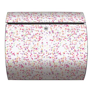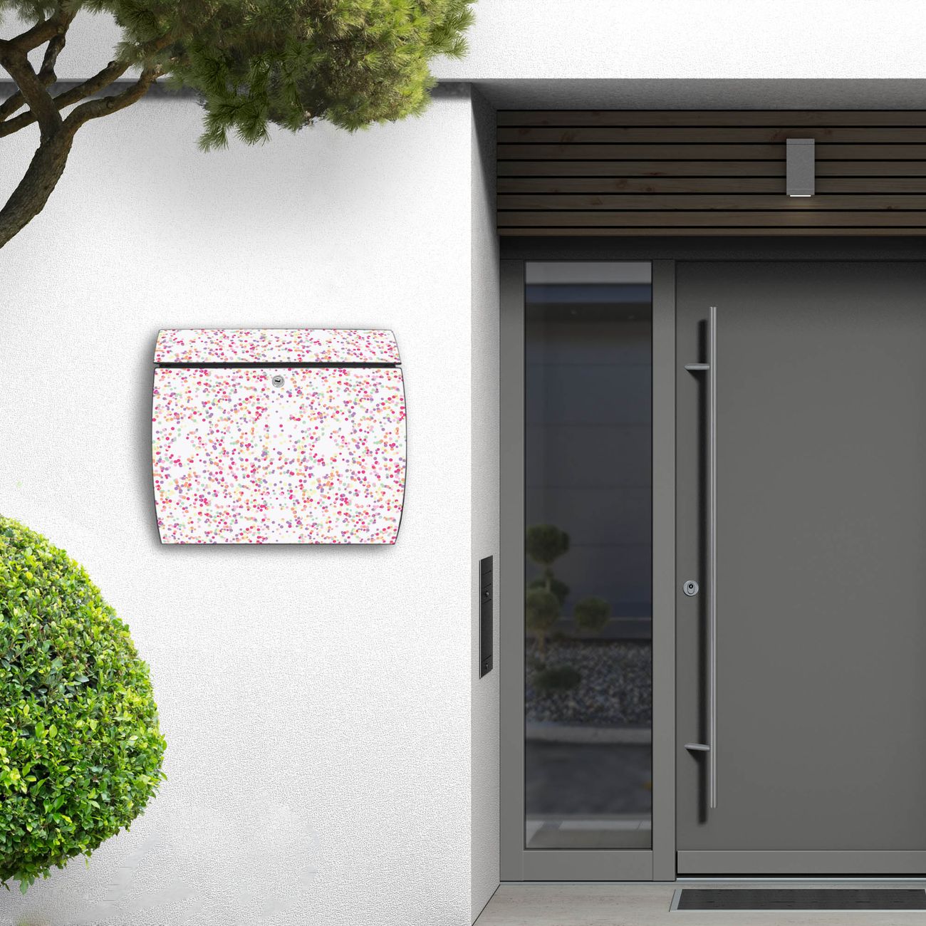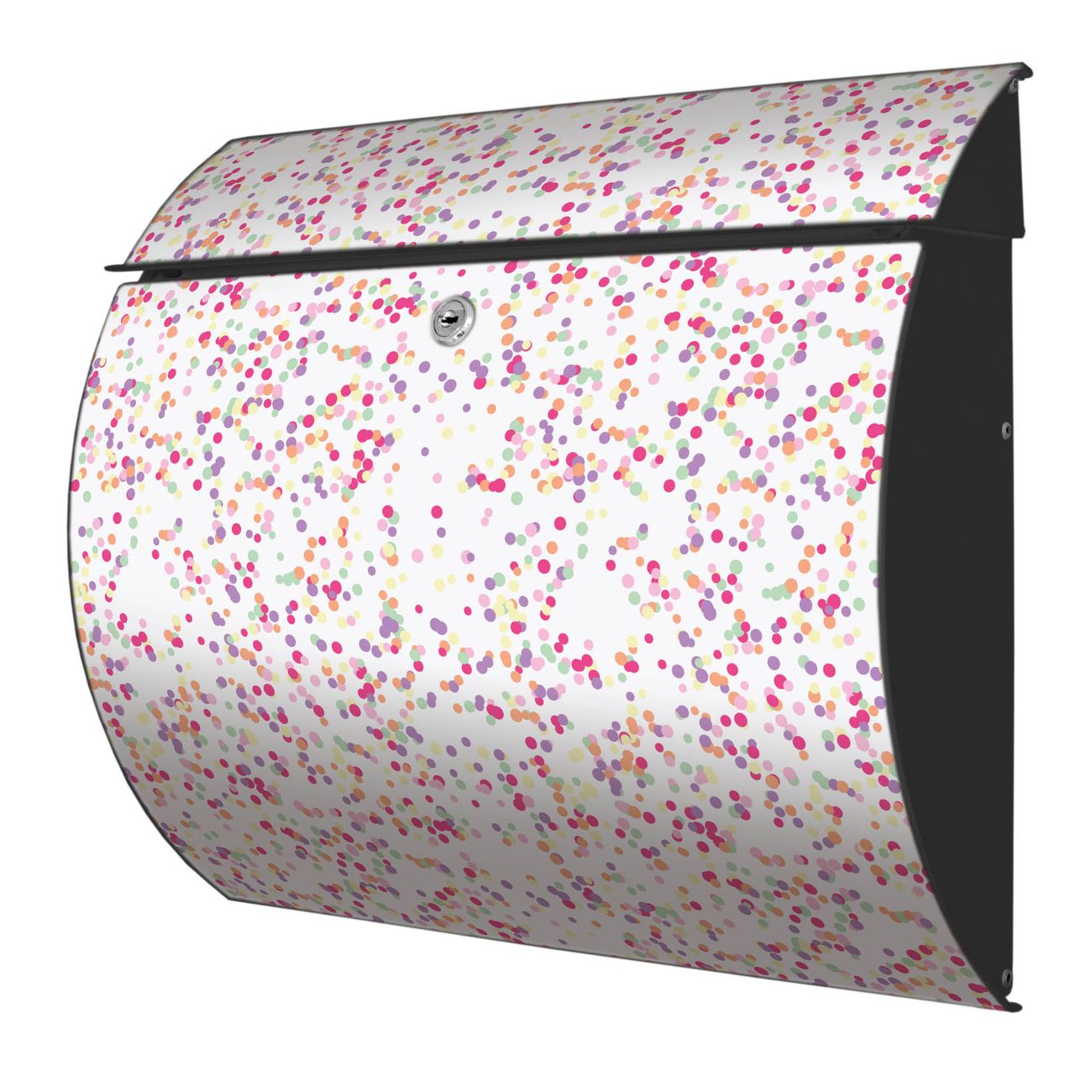 Der geschwungene Burg Wächter Briefkasten Toscana mit Motiv Konfettiregen bietet Ihnen mit seinem großen Fassungsvermögen genügend Platz auch für große A4 Sendungen. Auf Wunsch können Sie bei uns den passenden Standfuß bestellen und so aus dem Wandbriefkasten einen Standbriefkasten machen. Der integrierte Öffnungsstopp ermöglicht eine einfache Handhabung beim Entnehmen der Post.