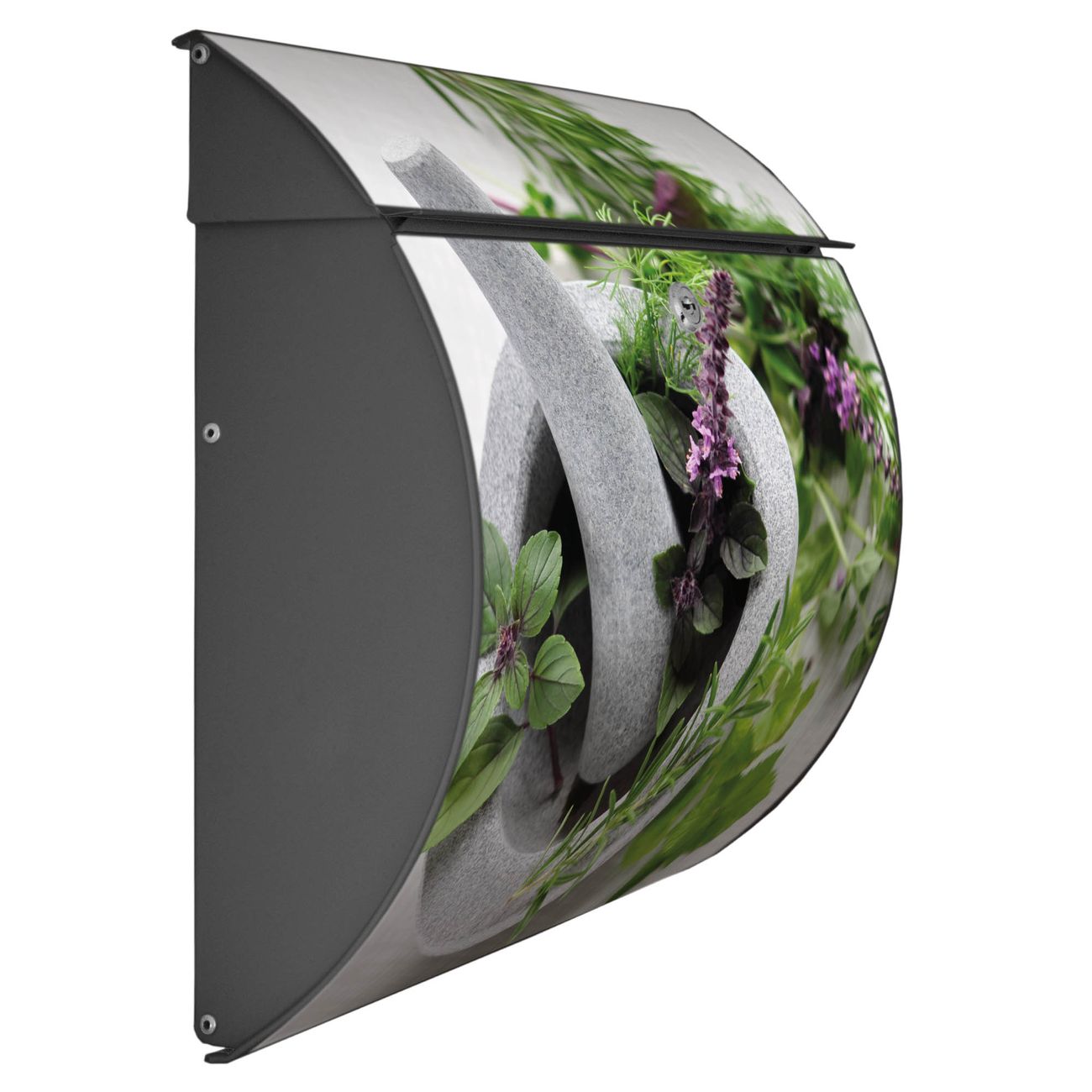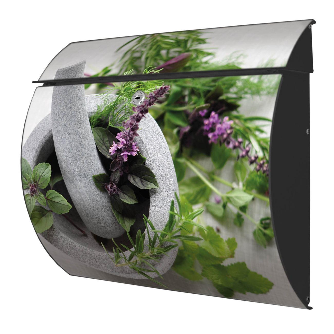 Der geschwungene Burg Wächter Briefkasten Toscana mit Motiv Kräuter bietet Ihnen mit seinem großen Fassungsvermögen genügend Platz auch für große A4 Sendungen. Auf Wunsch können Sie bei uns den passenden Standfuß bestellen und so aus dem Wandbriefkasten einen Standbriefkasten machen. Der integrierte Öffnungsstopp ermöglicht eine einfache Handhabung beim Entnehmen der Post.