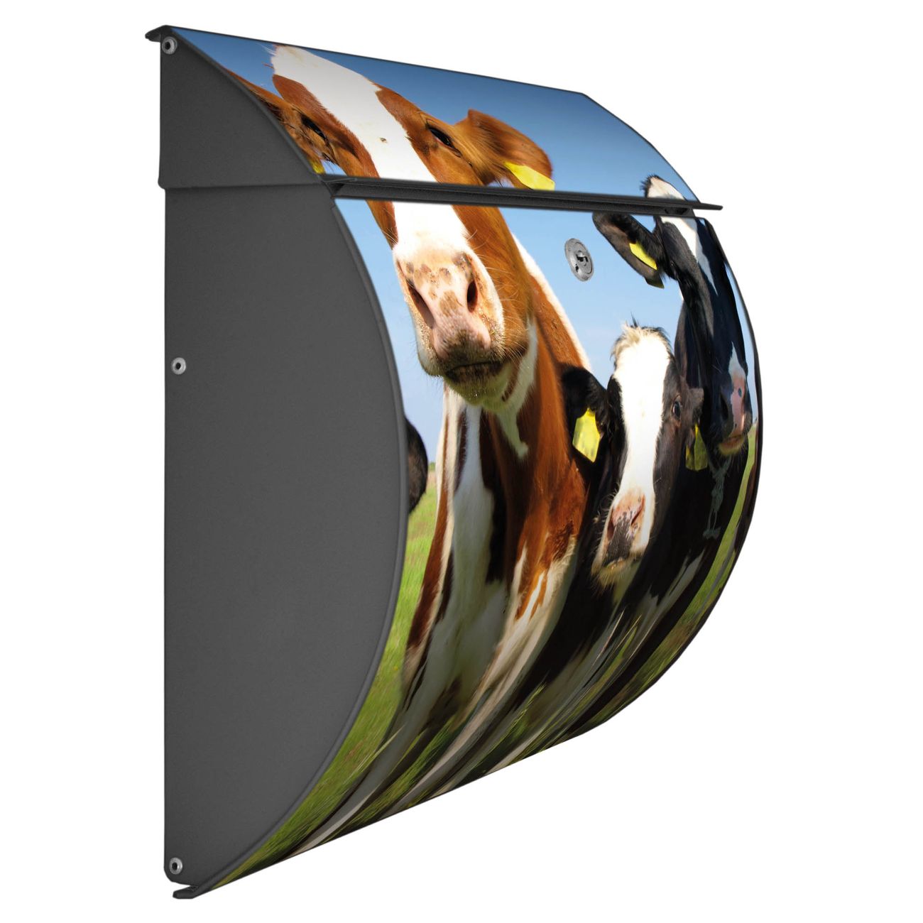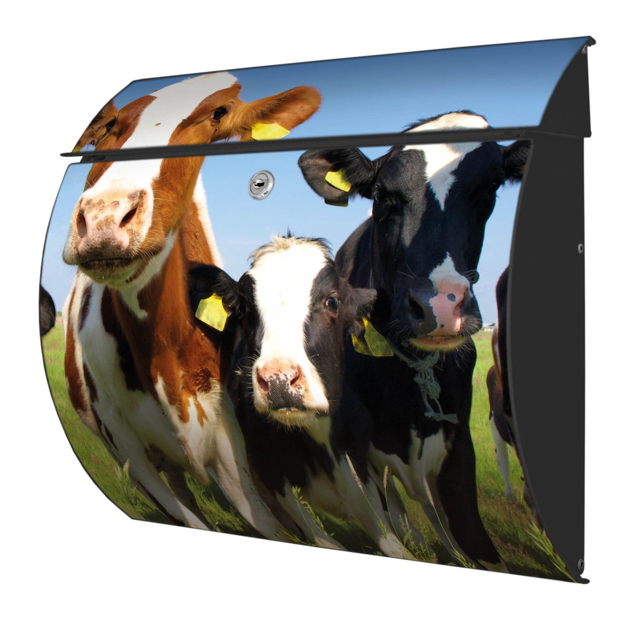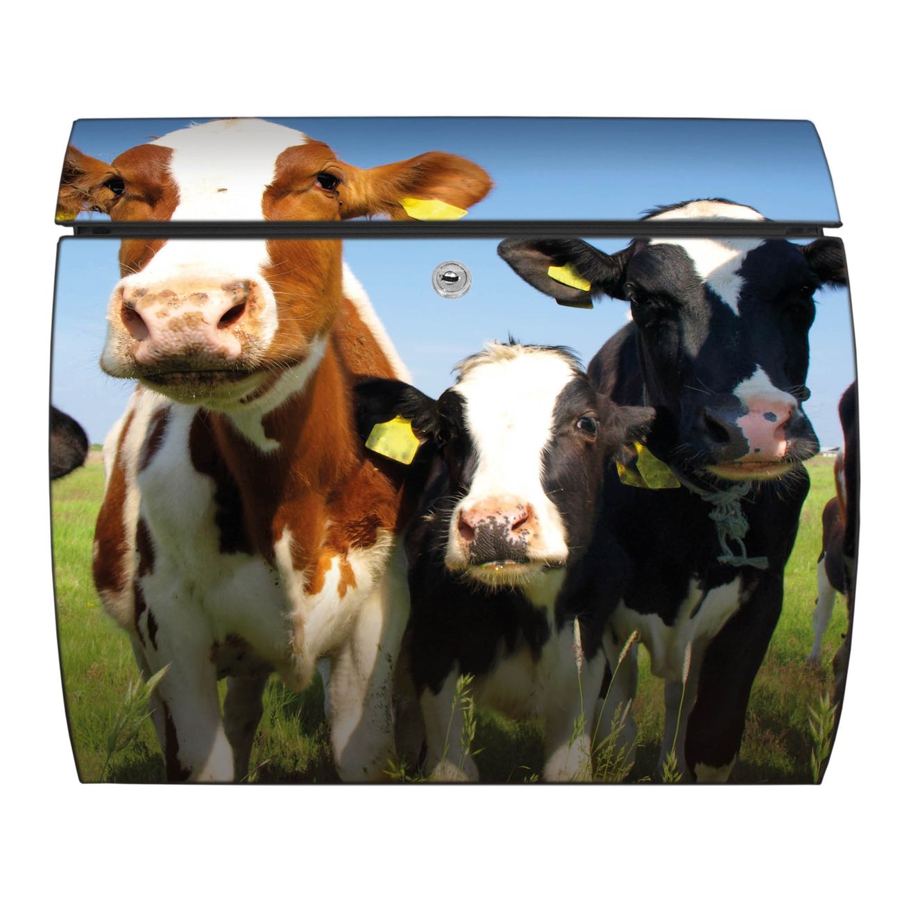FUNKTION: DESIGN: Das Burg Wächter Modell Toscana mit Motiv Kühe hat ein sehr ansprechendes und zeitloses Design und ist besonderes wetterfest. Heben Sie Sich von der tristen grauen Masse ab, ohne auf Funktionalität zu verzichten. Wir bieten Ihnen ebenfalls Namensschilder, bereits beschriftet oder frei zu beschriften, und verschiedene selbst gestaltete Bitte-Keine-Werbung-Aufkleber. DETAILS: Der Postkasten besteht aus vollflächig verzinktem Stahl welcher in Anthrazit oder Weiß lackiert wurde oder aus Edelstahl (je nach gewählter Variante). Das Motiv besteht aus einer wetter- und UV-festen Folie, die mit einem Schutzlaminat überzogen ist, durch die Ihren Briefkasten zusätzlich vor Kratzern geschützt ist und auf den Briefkasten kaschiert wurde. Sie erhalten zu Ihrem neuen Design Briefkasten 2 Schlüssel sowie das passende Montagematerial. BANJADO: Ihr Briefkasten wird von Burg Wächter in Deutschland gefertigt und in unserer kleinen Manufaktur von Hand veredelt. Die Motivfolie ist lösungsmittelfrei und schutzlaminiert, dies sorgt für einen langen Halt. Wir legen großen Wert auf die Verbindung von Funktionalität und Design. Sie erhalten besondere Handarbeit aus Sachsen und Made in Germany.