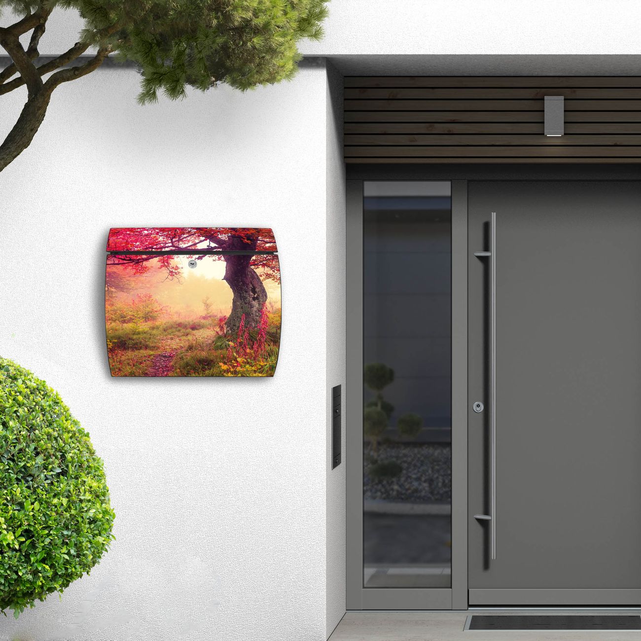 FUNKTION: DESIGN: Das Burg Wächter Modell Toscana mit Motiv Lichtung Im Herbst hat ein sehr ansprechendes und zeitloses Design und ist besonderes wetterfest. Heben Sie Sich von der tristen grauen Masse ab, ohne auf Funktionalität zu verzichten. Wir bieten Ihnen ebenfalls Namensschilder, bereits beschriftet oder frei zu beschriften, und verschiedene selbst gestaltete Bitte-Keine-Werbung-Aufkleber. DETAILS: Der Postkasten besteht aus vollflächig verzinktem Stahl welcher in Anthrazit oder Weiß lackiert wurde oder aus Edelstahl (je nach gewählter Variante). Das Motiv besteht aus einer wetter- und UV-festen Folie, die mit einem Schutzlaminat überzogen ist, durch die Ihren Briefkasten zusätzlich vor Kratzern geschützt ist und auf den Briefkasten kaschiert wurde. Sie erhalten zu Ihrem neuen Design Briefkasten 2 Schlüssel sowie das passende Montagematerial. BANJADO: Ihr Briefkasten wird von Burg Wächter in Deutschland gefertigt und in unserer kleinen Manufaktur von Hand veredelt. Die Motivfolie ist lösungsmittelfrei und schutzlaminiert, dies sorgt für einen langen Halt. Wir legen großen Wert auf die Verbindung von Funktionalität und Design. Sie erhalten besondere Handarbeit aus Sachsen und Made in Germany.