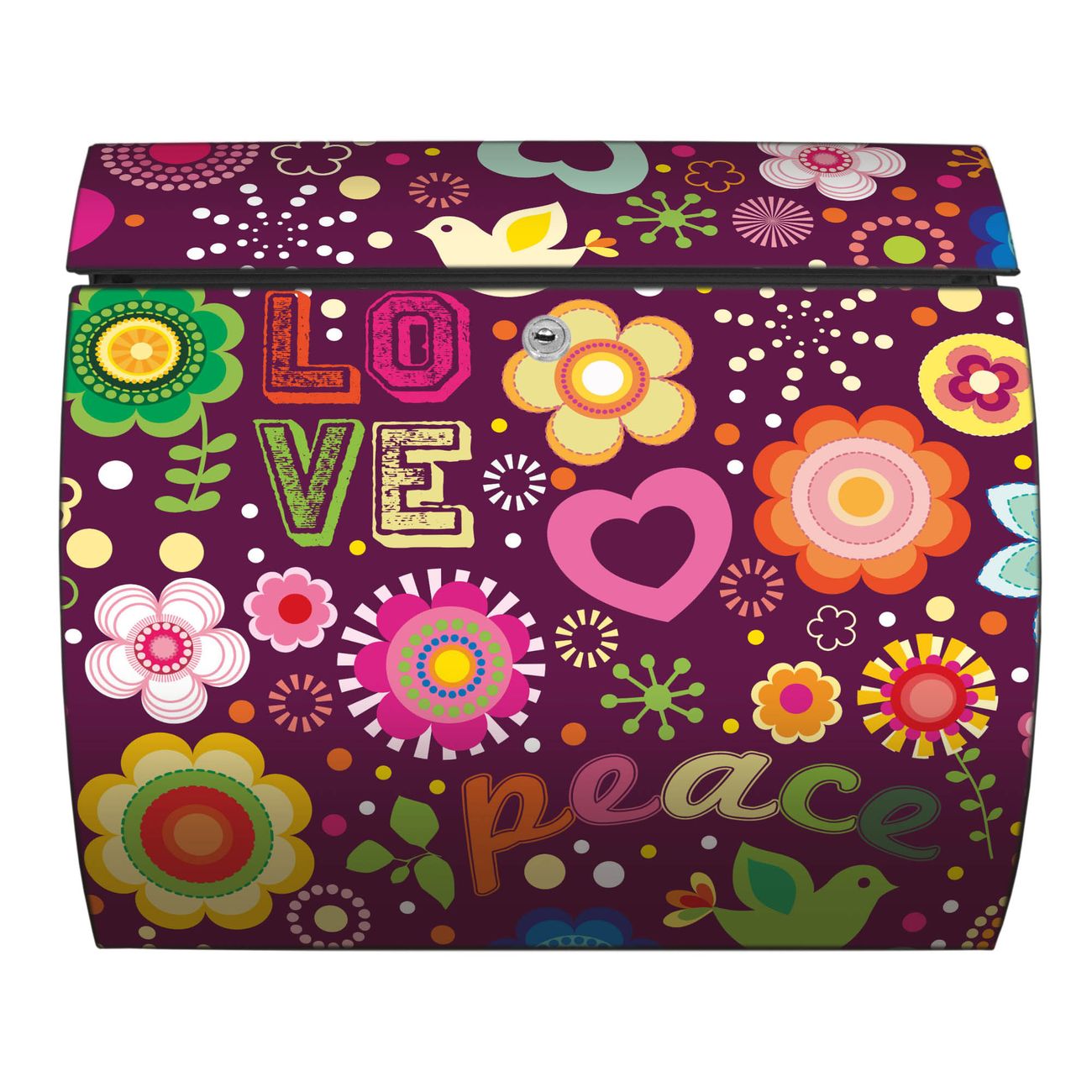 Der geschwungene Burg Wächter Briefkasten Toscana mit Motiv Love and Peace bietet Ihnen mit seinem großen Fassungsvermögen genügend Platz auch für große A4 Sendungen. Auf Wunsch können Sie bei uns den passenden Standfuß bestellen und so aus dem Wandbriefkasten einen Standbriefkasten machen. Der integrierte Öffnungsstopp ermöglicht eine einfache Handhabung beim Entnehmen der Post.