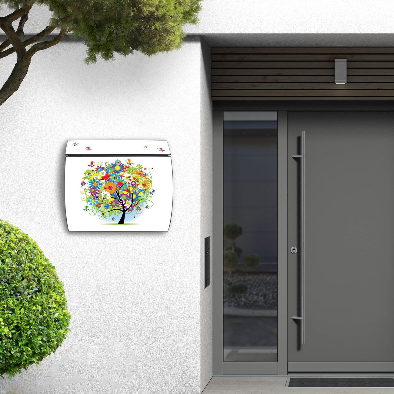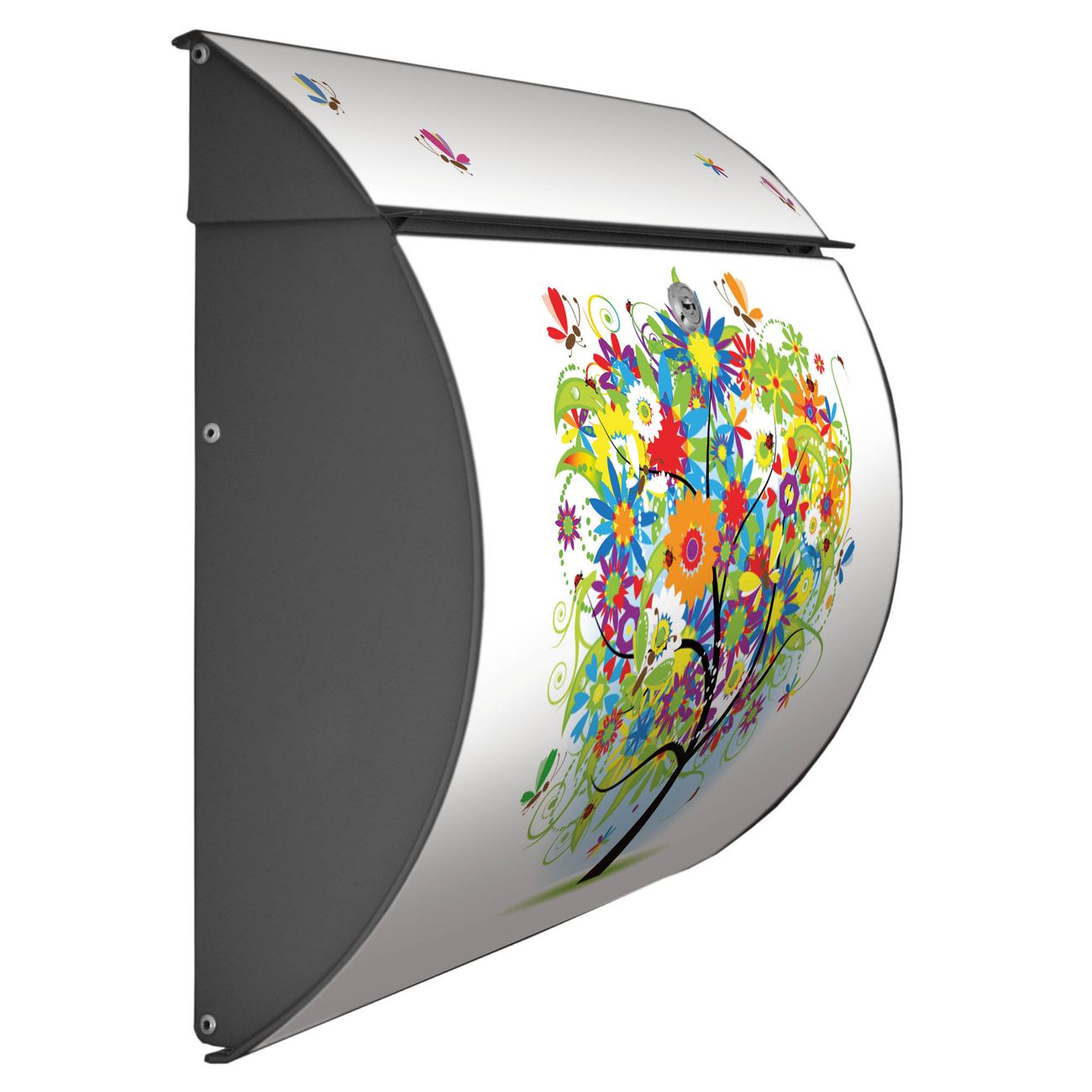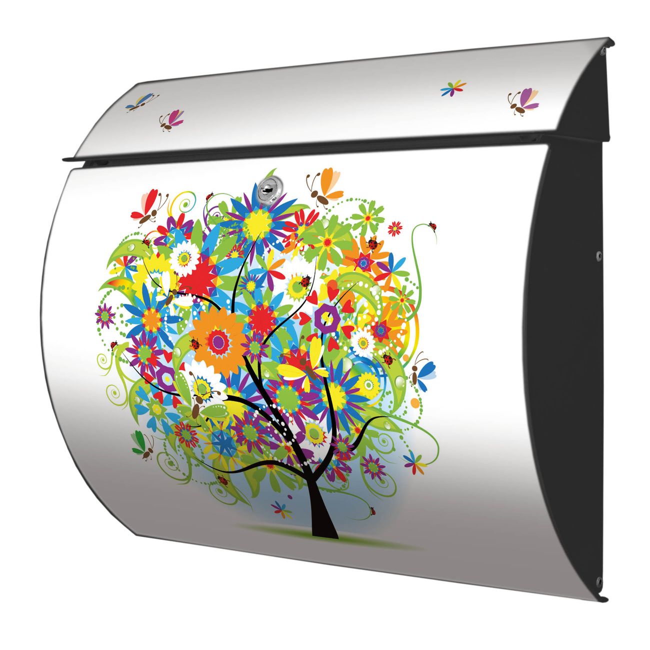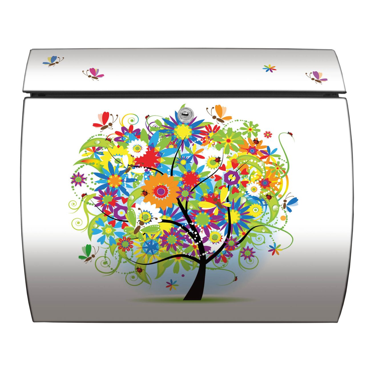 FUNKTION: DESIGN: Das Burg Wächter Modell Toscana mit Motiv Märchenzauberbaum hat ein sehr ansprechendes und zeitloses Design und ist besonderes wetterfest. Heben Sie Sich von der tristen grauen Masse ab, ohne auf Funktionalität zu verzichten. Wir bieten Ihnen ebenfalls Namensschilder, bereits beschriftet oder frei zu beschriften, und verschiedene selbst gestaltete Bitte-Keine-Werbung-Aufkleber. DETAILS: Der Postkasten besteht aus vollflächig verzinktem Stahl welcher in Anthrazit oder Weiß lackiert wurde oder aus Edelstahl (je nach gewählter Variante). Das Motiv besteht aus einer wetter- und UV-festen Folie, die mit einem Schutzlaminat überzogen ist, durch die Ihren Briefkasten zusätzlich vor Kratzern geschützt ist und auf den Briefkasten kaschiert wurde. Sie erhalten zu Ihrem neuen Design Briefkasten 2 Schlüssel sowie das passende Montagematerial. BANJADO: Ihr Briefkasten wird von Burg Wächter in Deutschland gefertigt und in unserer kleinen Manufaktur von Hand veredelt. Die Motivfolie ist lösungsmittelfrei und schutzlaminiert, dies sorgt für einen langen Halt. Wir legen großen Wert auf die Verbindung von Funktionalität und Design. Sie erhalten besondere Handarbeit aus Sachsen und Made in Germany.