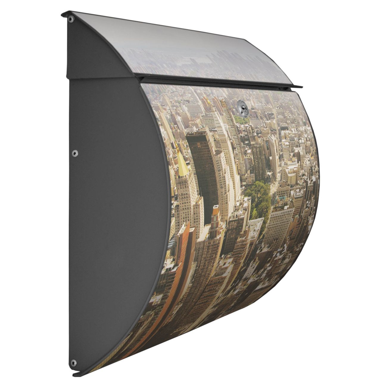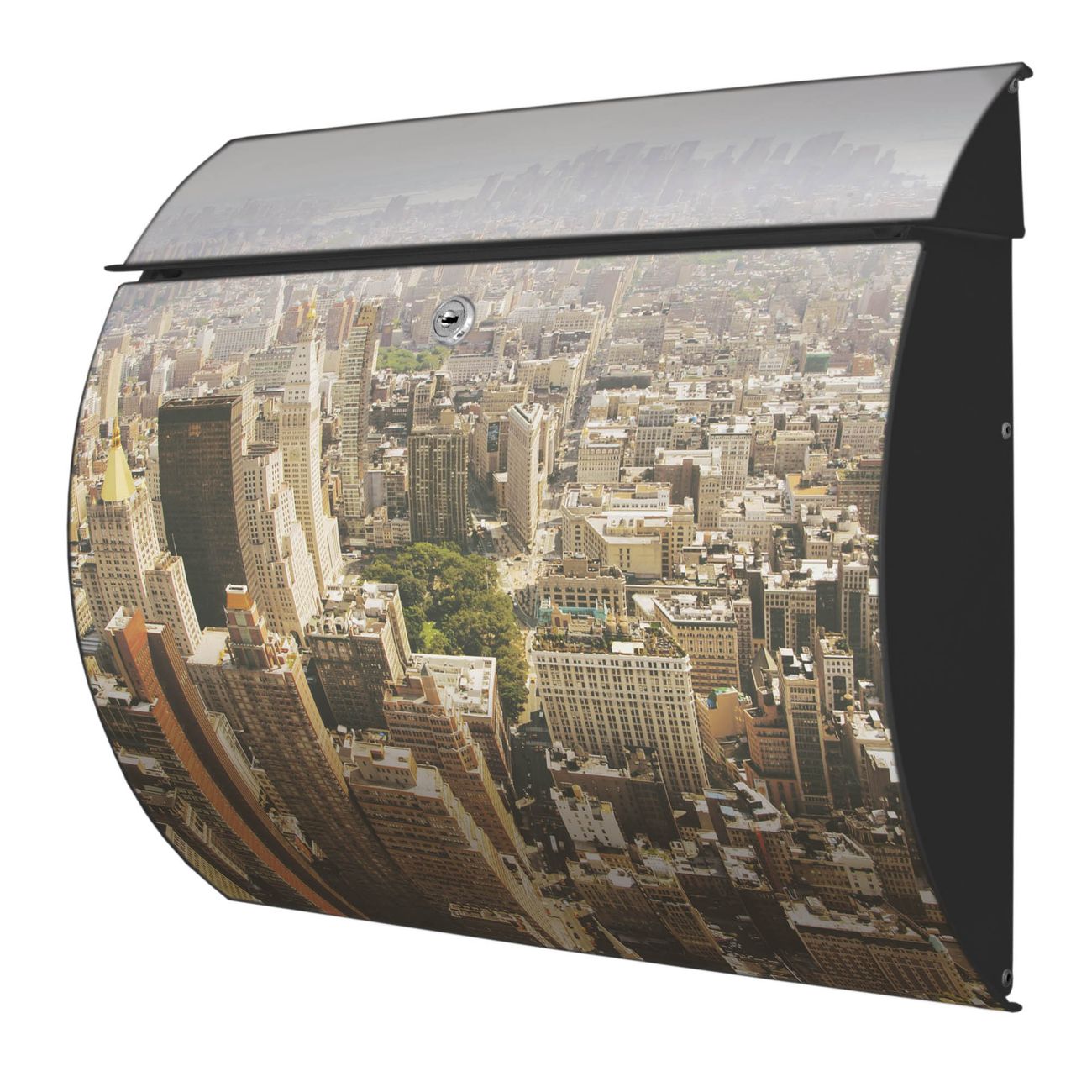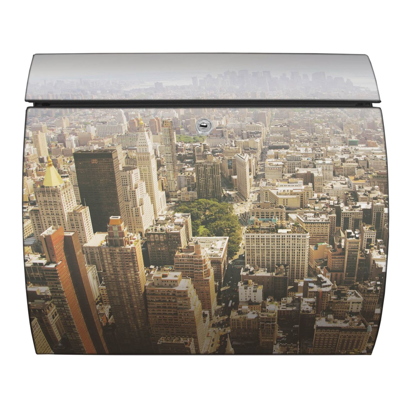 Der geschwungene Burg Wächter Briefkasten Toscana mit Motiv Manhattan 1 bietet Ihnen mit seinem großen Fassungsvermögen genügend Platz auch für große A4 Sendungen. Auf Wunsch können Sie bei uns den passenden Standfuß bestellen und so aus dem Wandbriefkasten einen Standbriefkasten machen. Der integrierte Öffnungsstopp ermöglicht eine einfache Handhabung beim Entnehmen der Post.