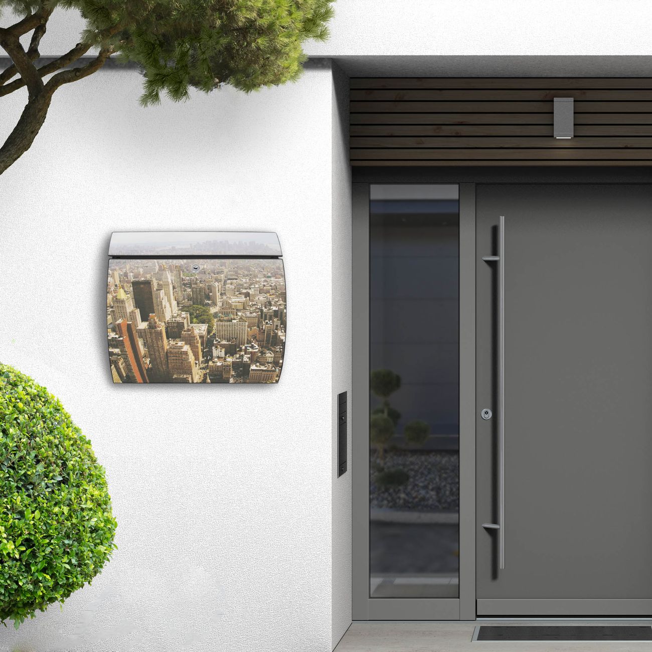 FUNKTION: DESIGN: Das Burg Wächter Modell Toscana mit Motiv Manhattan 1 hat ein sehr ansprechendes und zeitloses Design und ist besonderes wetterfest. Heben Sie Sich von der tristen grauen Masse ab, ohne auf Funktionalität zu verzichten. Wir bieten Ihnen ebenfalls Namensschilder, bereits beschriftet oder frei zu beschriften, und verschiedene selbst gestaltete Bitte-Keine-Werbung-Aufkleber. DETAILS: Der Postkasten besteht aus vollflächig verzinktem Stahl welcher in Anthrazit oder Weiß lackiert wurde oder aus Edelstahl (je nach gewählter Variante). Das Motiv besteht aus einer wetter- und UV-festen Folie, die mit einem Schutzlaminat überzogen ist, durch die Ihren Briefkasten zusätzlich vor Kratzern geschützt ist und auf den Briefkasten kaschiert wurde. Sie erhalten zu Ihrem neuen Design Briefkasten 2 Schlüssel sowie das passende Montagematerial. BANJADO: Ihr Briefkasten wird von Burg Wächter in Deutschland gefertigt und in unserer kleinen Manufaktur von Hand veredelt. Die Motivfolie ist lösungsmittelfrei und schutzlaminiert, dies sorgt für einen langen Halt. Wir legen großen Wert auf die Verbindung von Funktionalität und Design. Sie erhalten besondere Handarbeit aus Sachsen und Made in Germany.